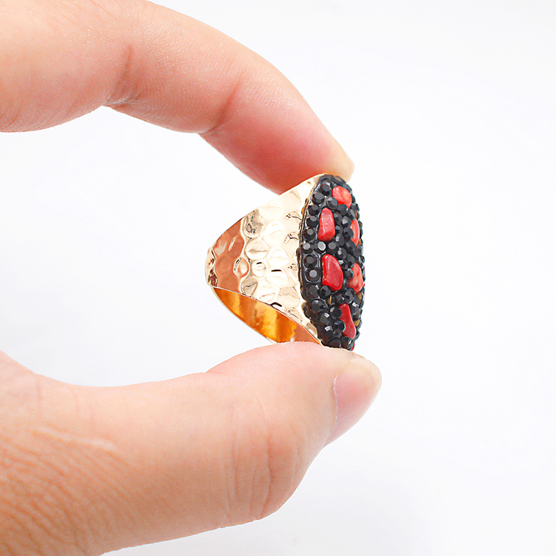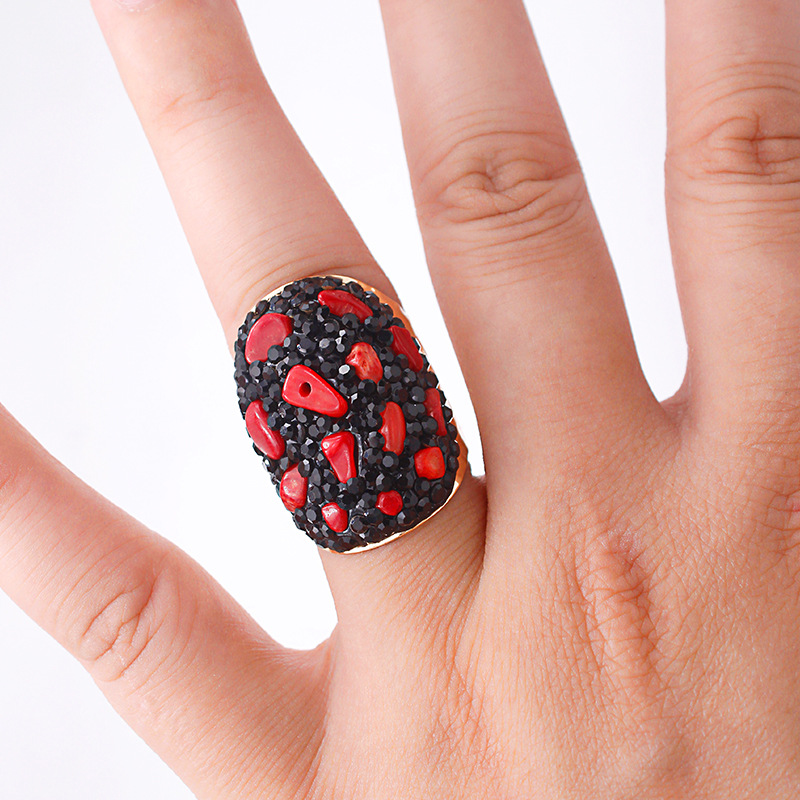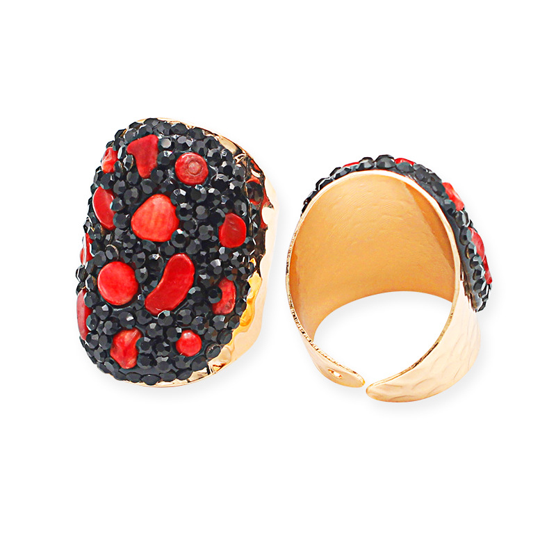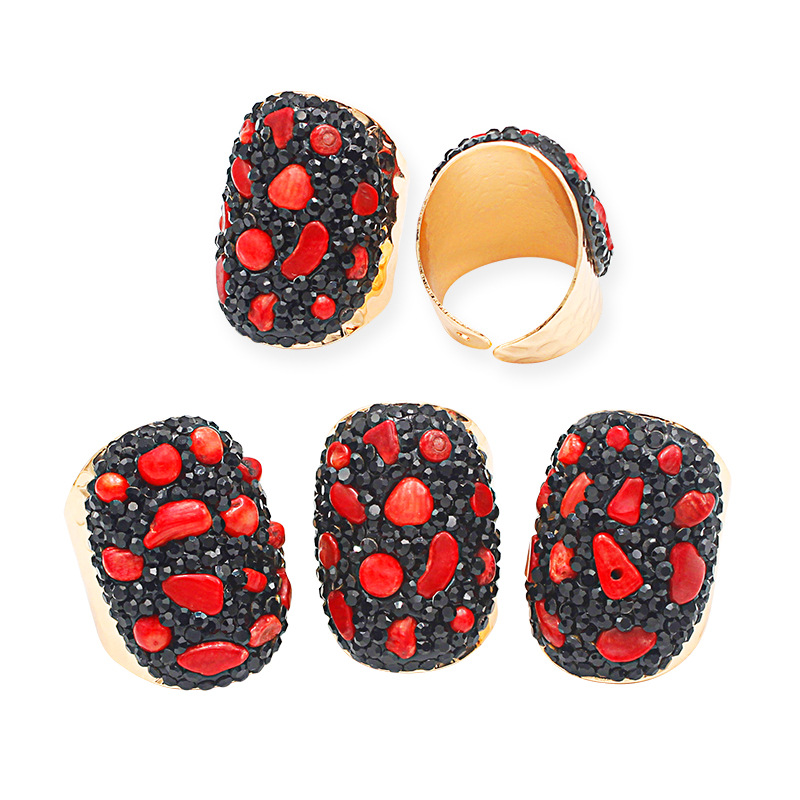 Edelstein Fingerring, Messing, mit Synthetische Koralle, goldfarben plattiert, für Frau & mit Strass, schwarz, inner diameter:17~20mm, verkauft von PC