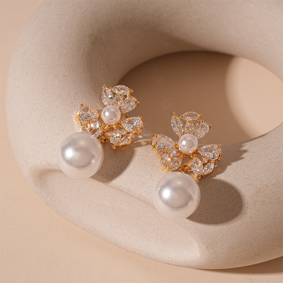 Kubischer Zirkon (CZ) Messing Ohrring, mit Kunststoff Perlen, goldfarben plattiert, Modeschmuck & Micro pave Zirkonia, goldfarben, 37x20mm, verkauft von Paar