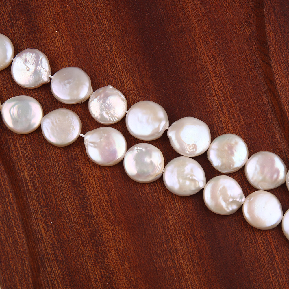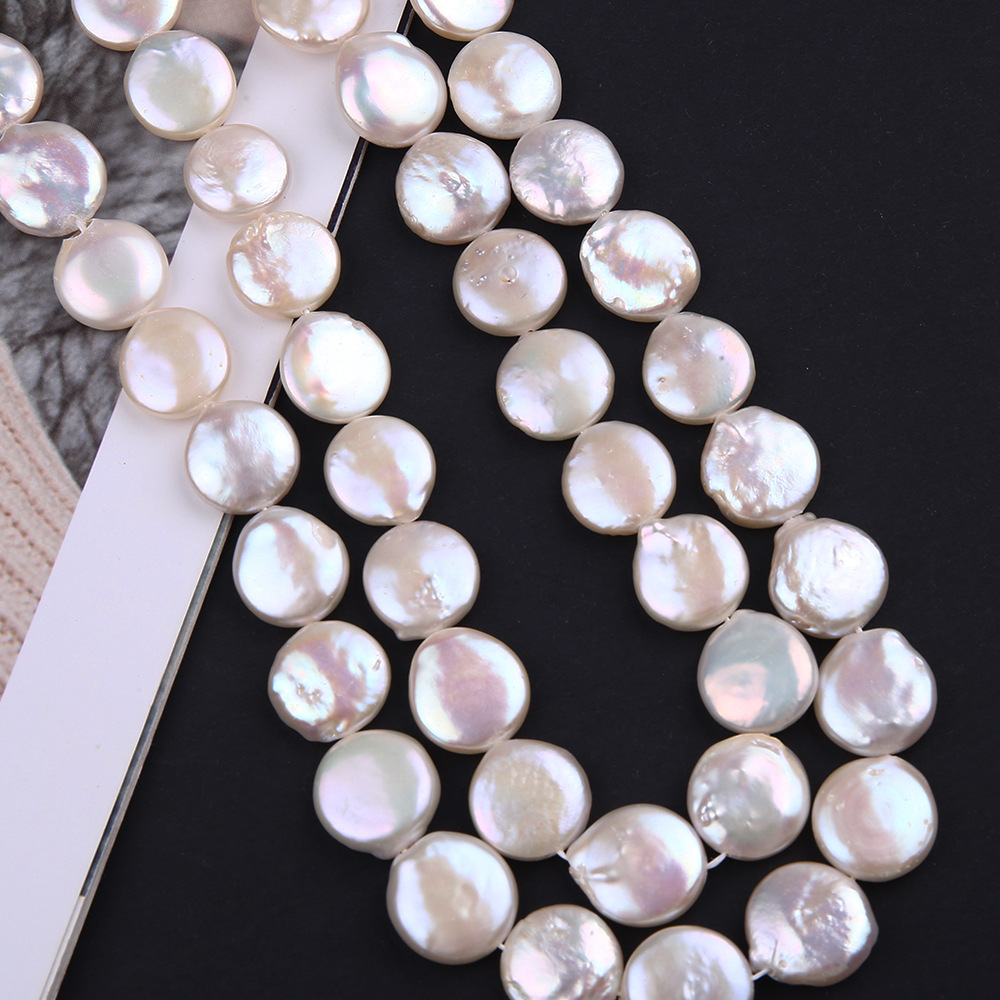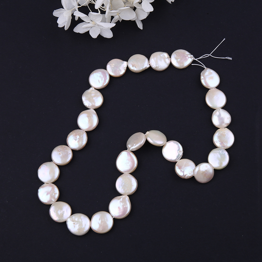 Button kultivierte Süßwasserperlen, Natürliche kultivierte Süßwasserperlen, Knopf, natürlich, weiß, 12-13mm, Bohrung:ca. 0.8mm, Länge:15 ZollInch, verkauft von Strang