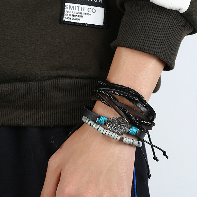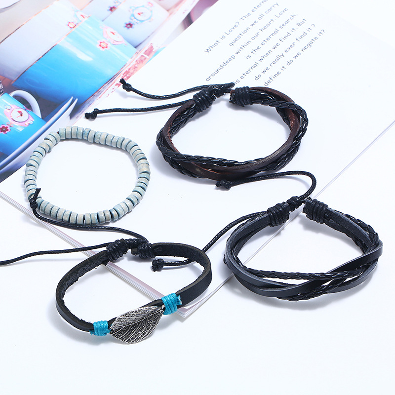 Rindsleder-Armbänder, Kuhhaut, mit PU Leder & Wachsschnur & Holz, handgemacht, 4 Stück & Modeschmuck & für den Menschen, schwarz, Diameter: about 6cm., verkauft von setzen