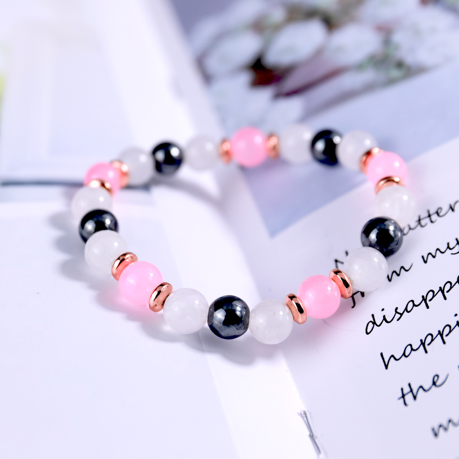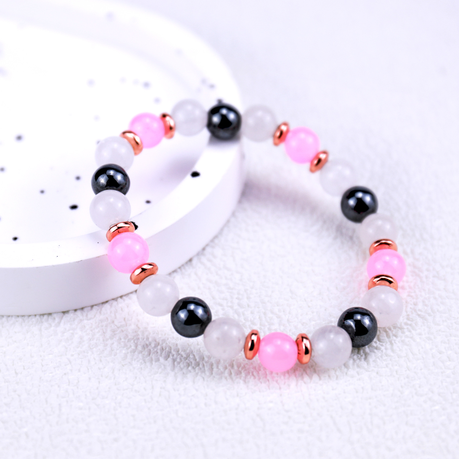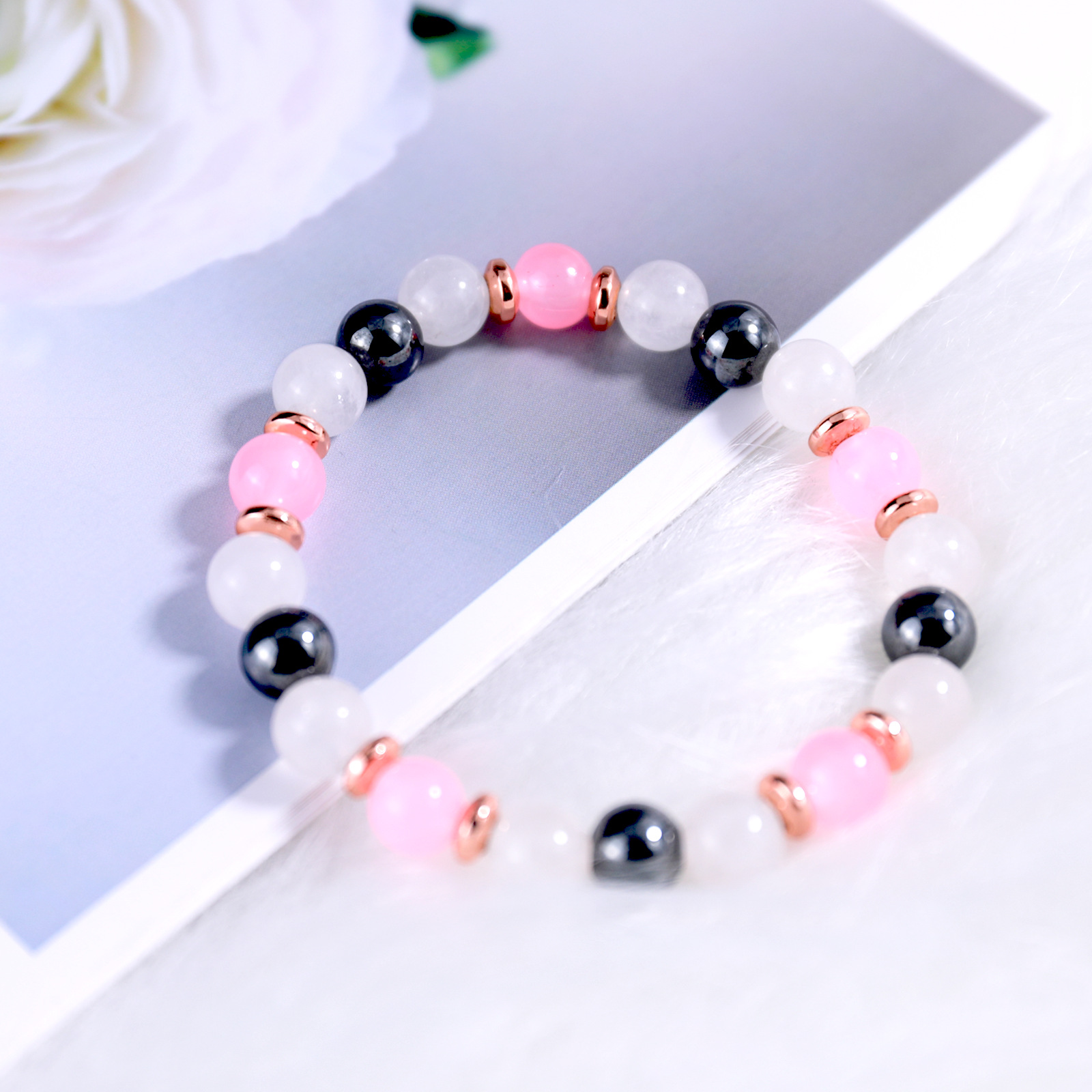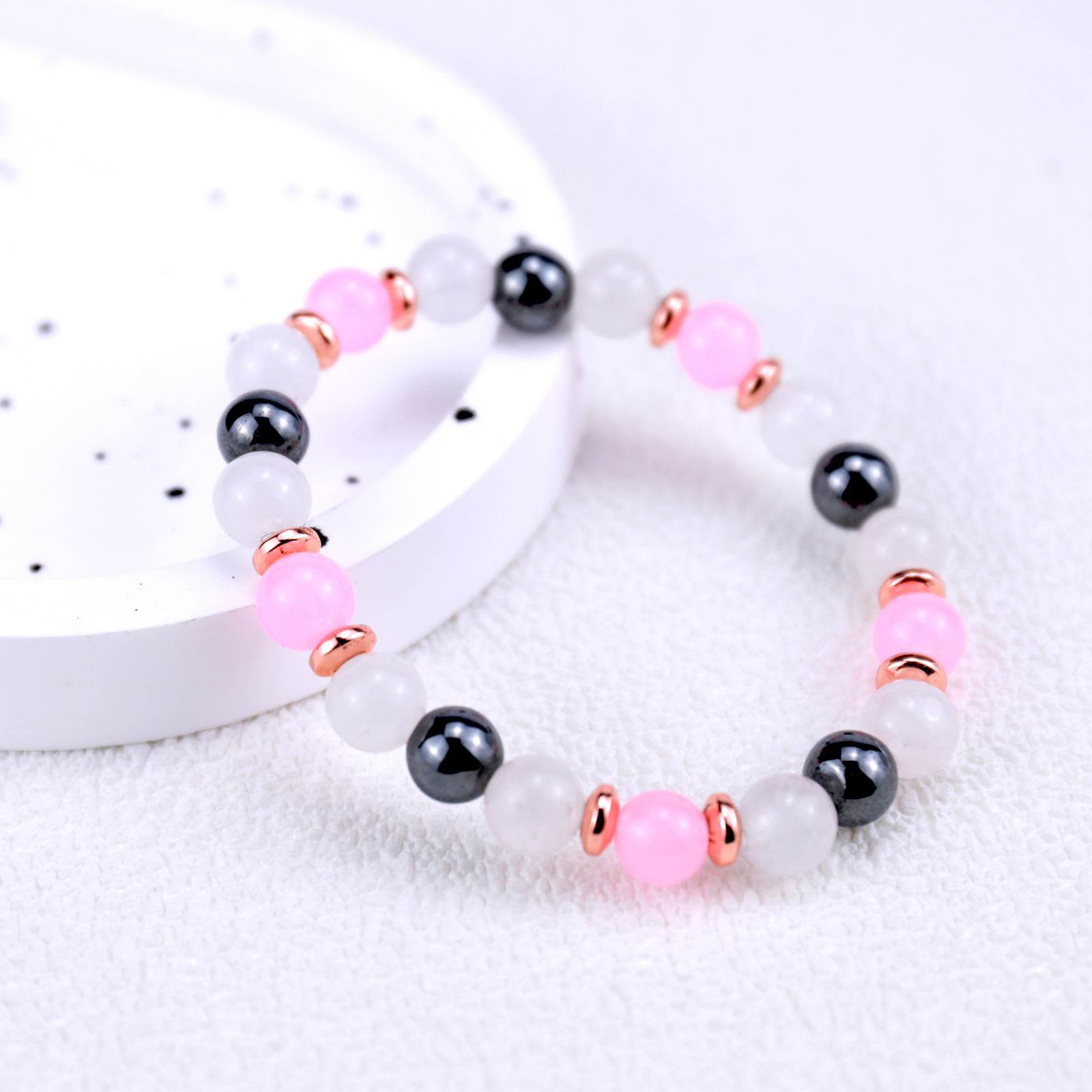 Edelstein Armbänder, Rosenquarz, mit Hämatit, rund, für Frau, Rosa, Länge:12 cm, verkauft von PC