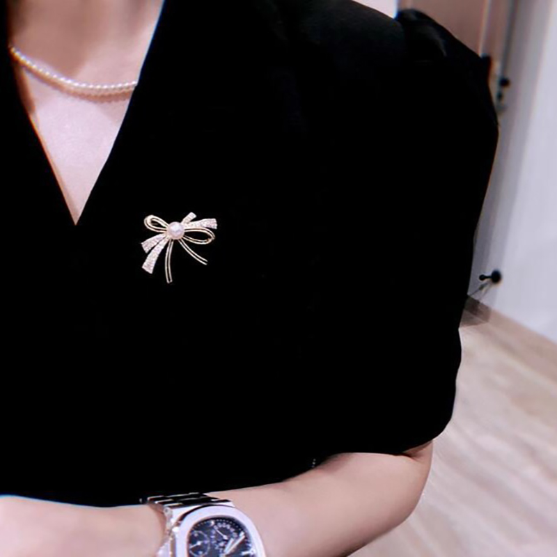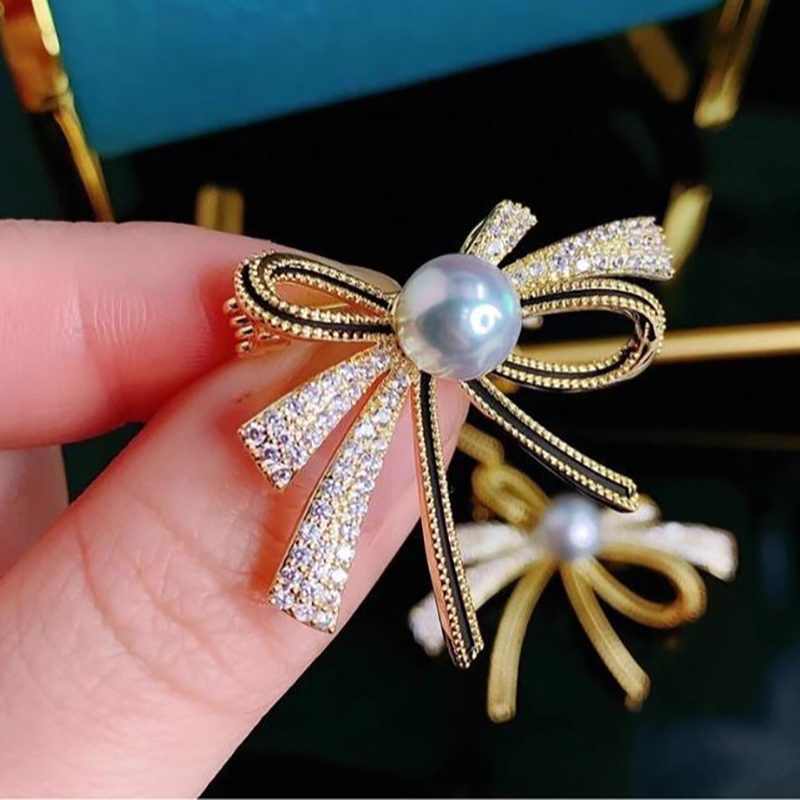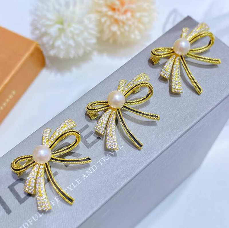 Kunststoff-Perlen-Brosche, Zinklegierung, mit Kunststoff Perlen, Schleife, goldfarben plattiert, für Frau & mit Strass, 45mm, verkauft von PC