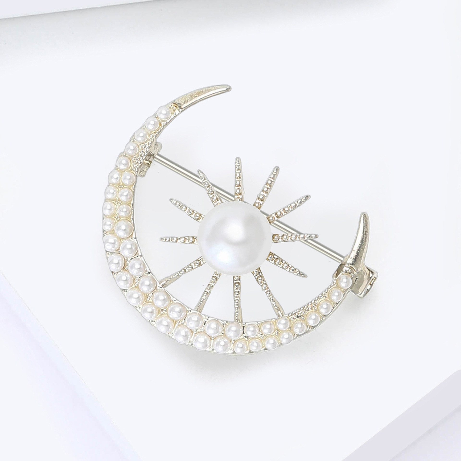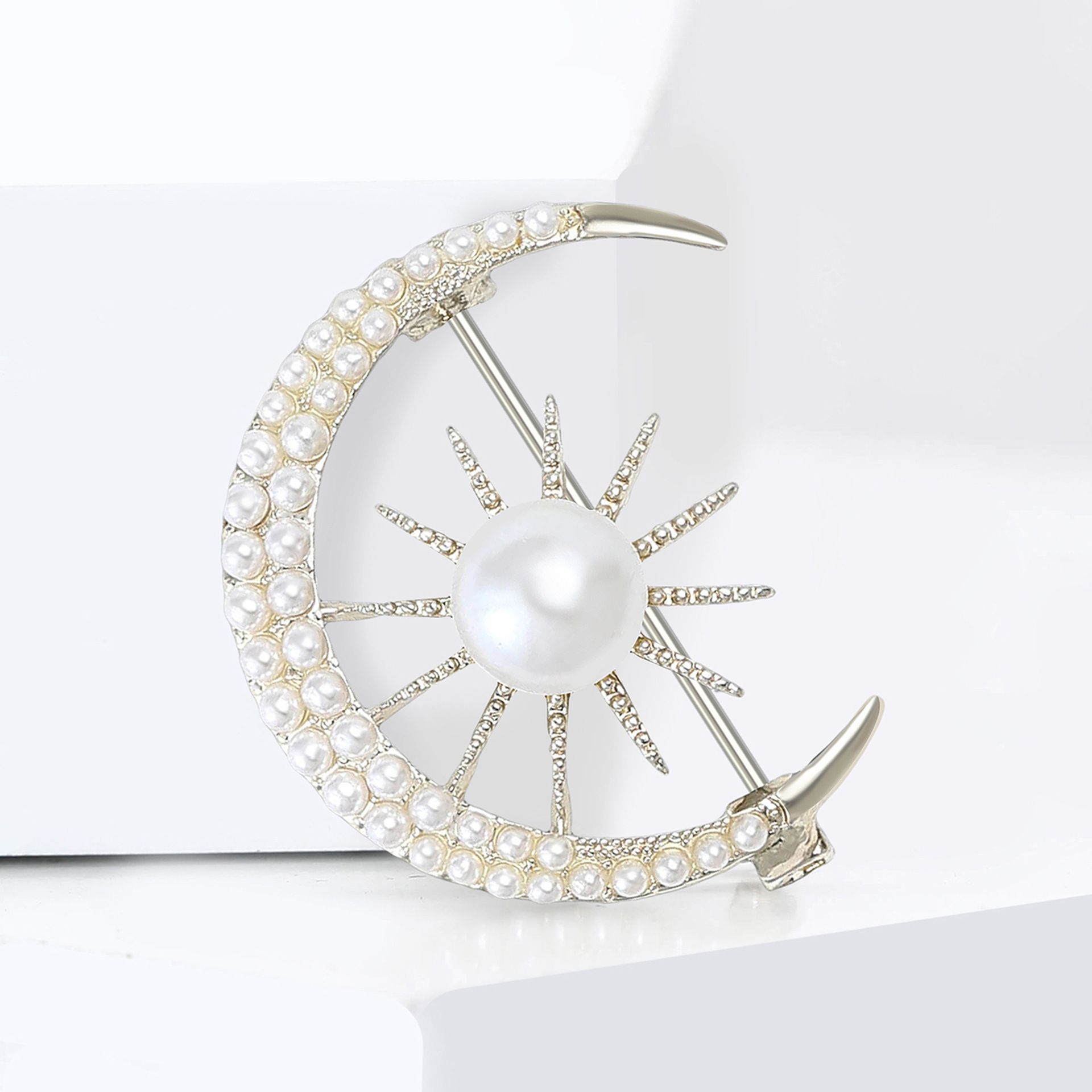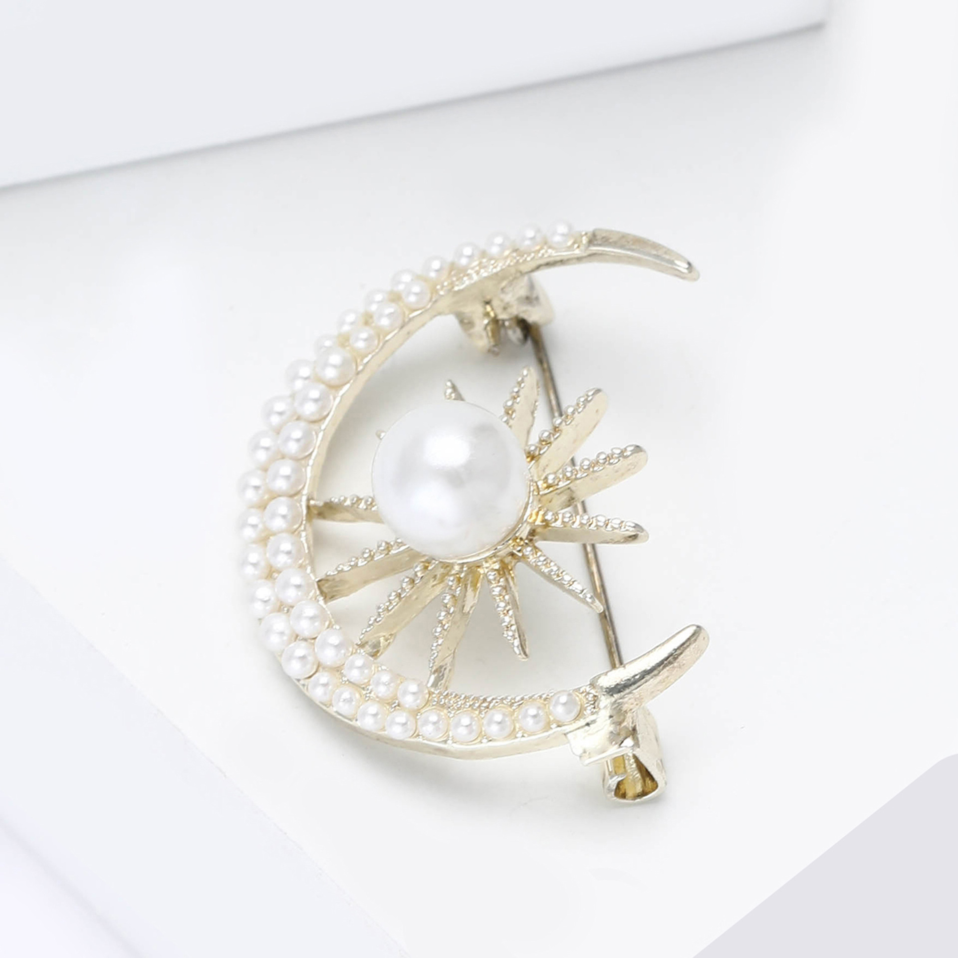 Strass Zink Legierung Brosche, Zinklegierung, mit Kunststoff Perlen, Mond, goldfarben plattiert, für Frau & mit Strass, verkauft von PC