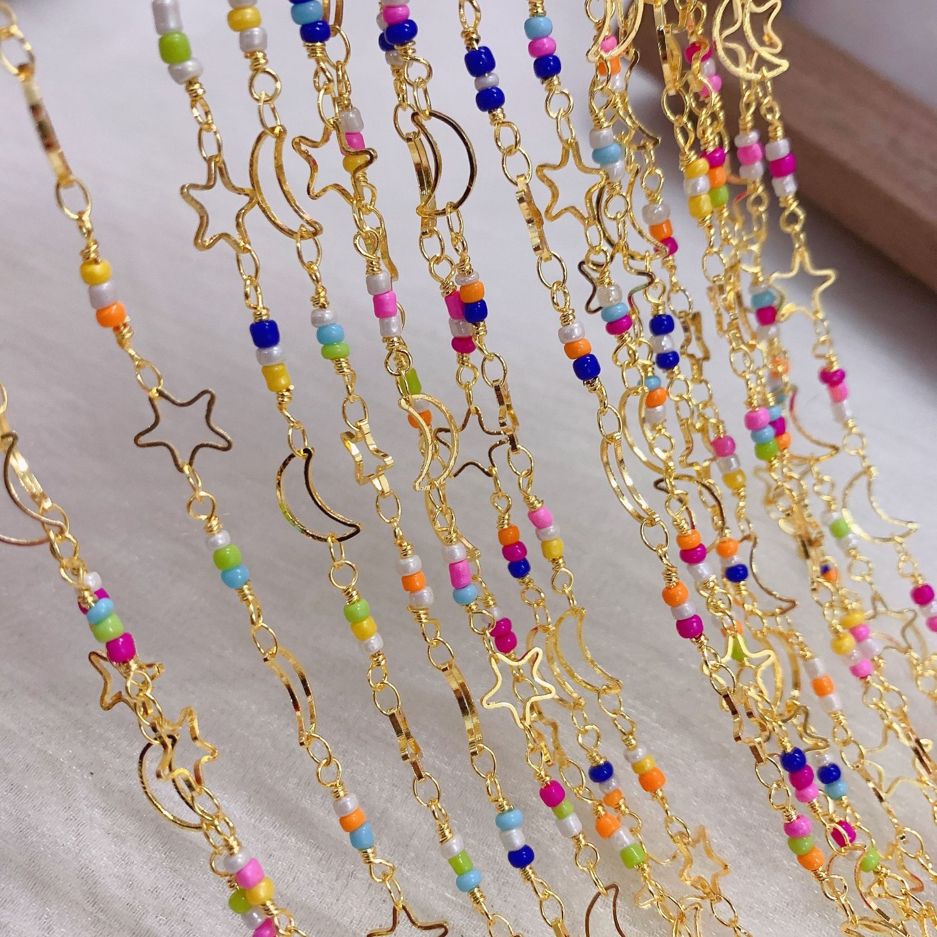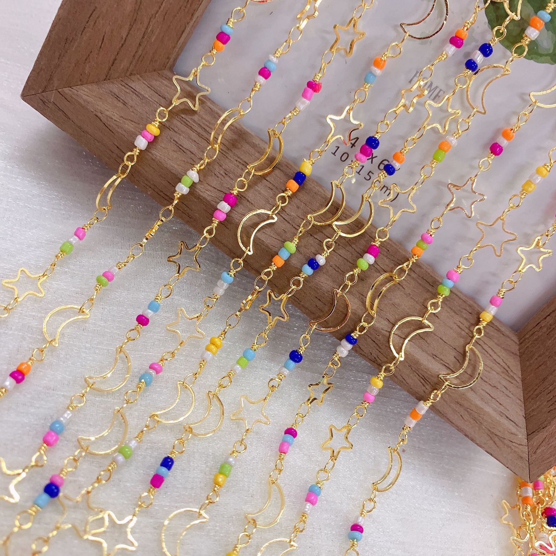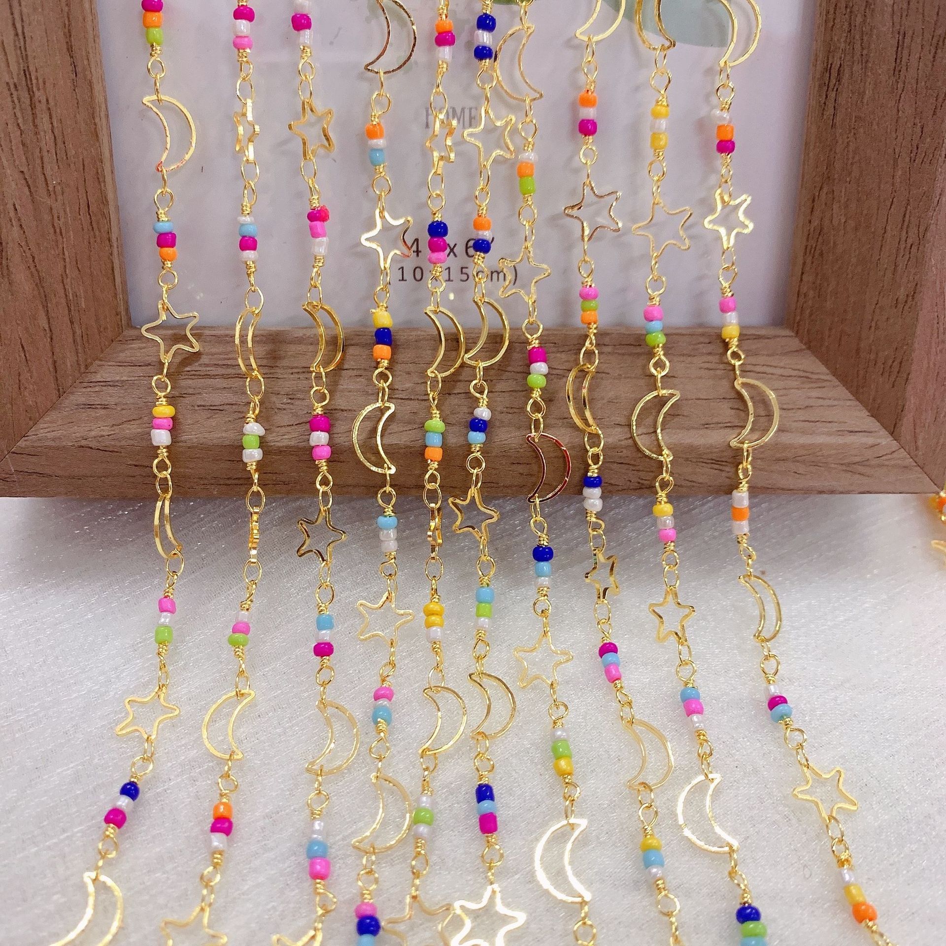 Edelstein Perlen Kette, Messing, mit Seedbead, Mond und Sterne, goldfarben plattiert, DIY, gemischte Farben, 10m/Tasche, verkauft von Tasche