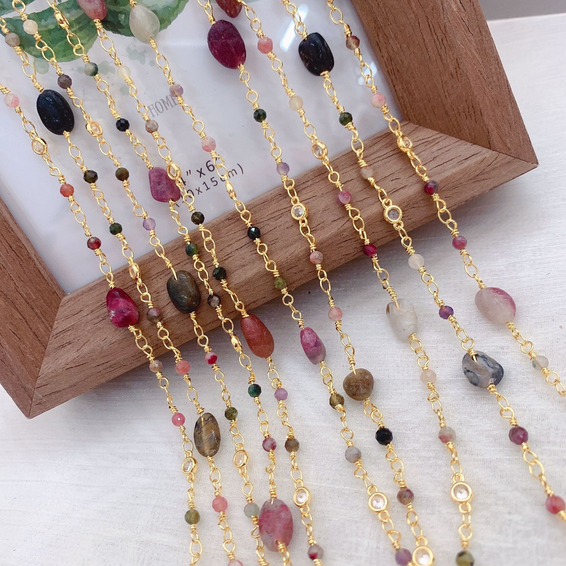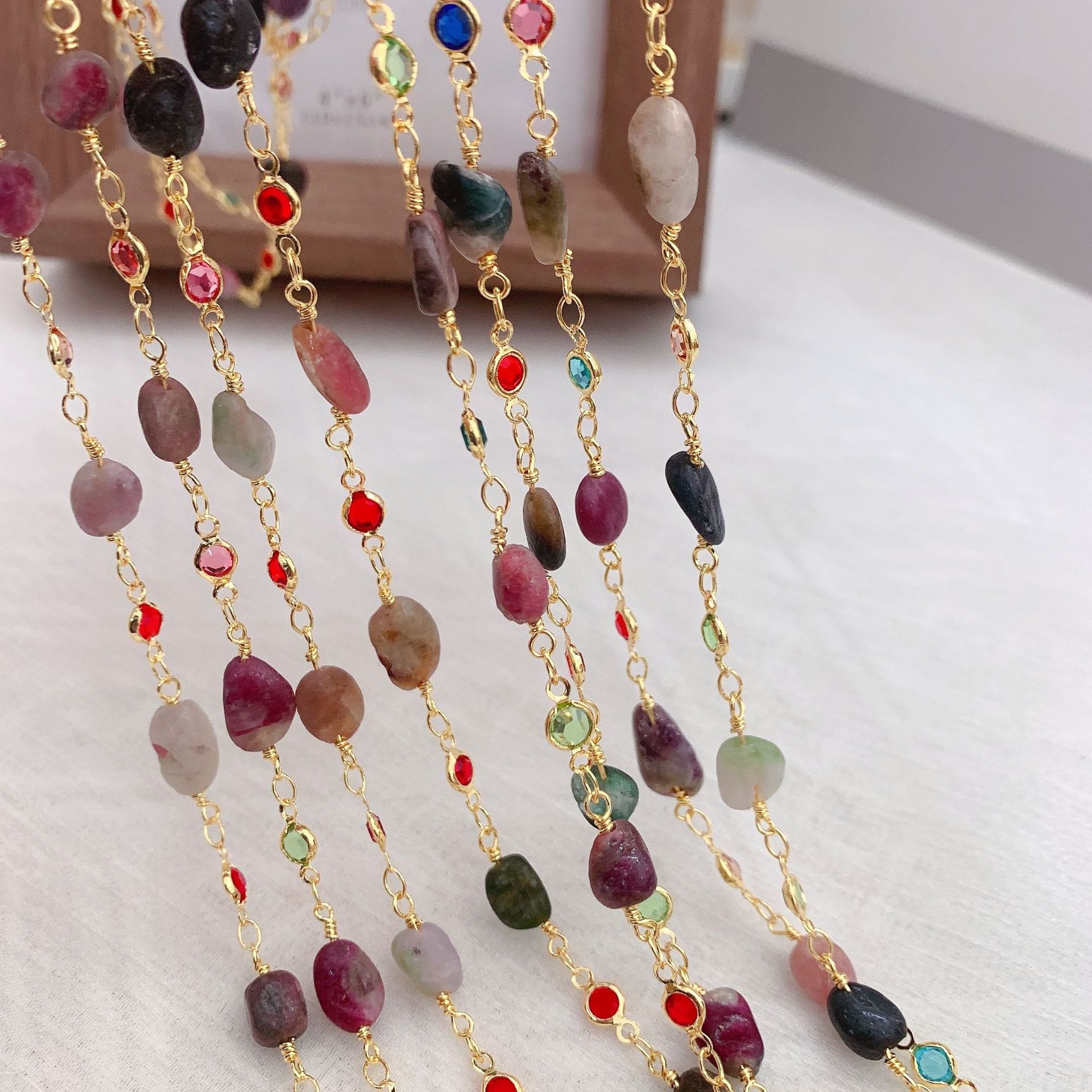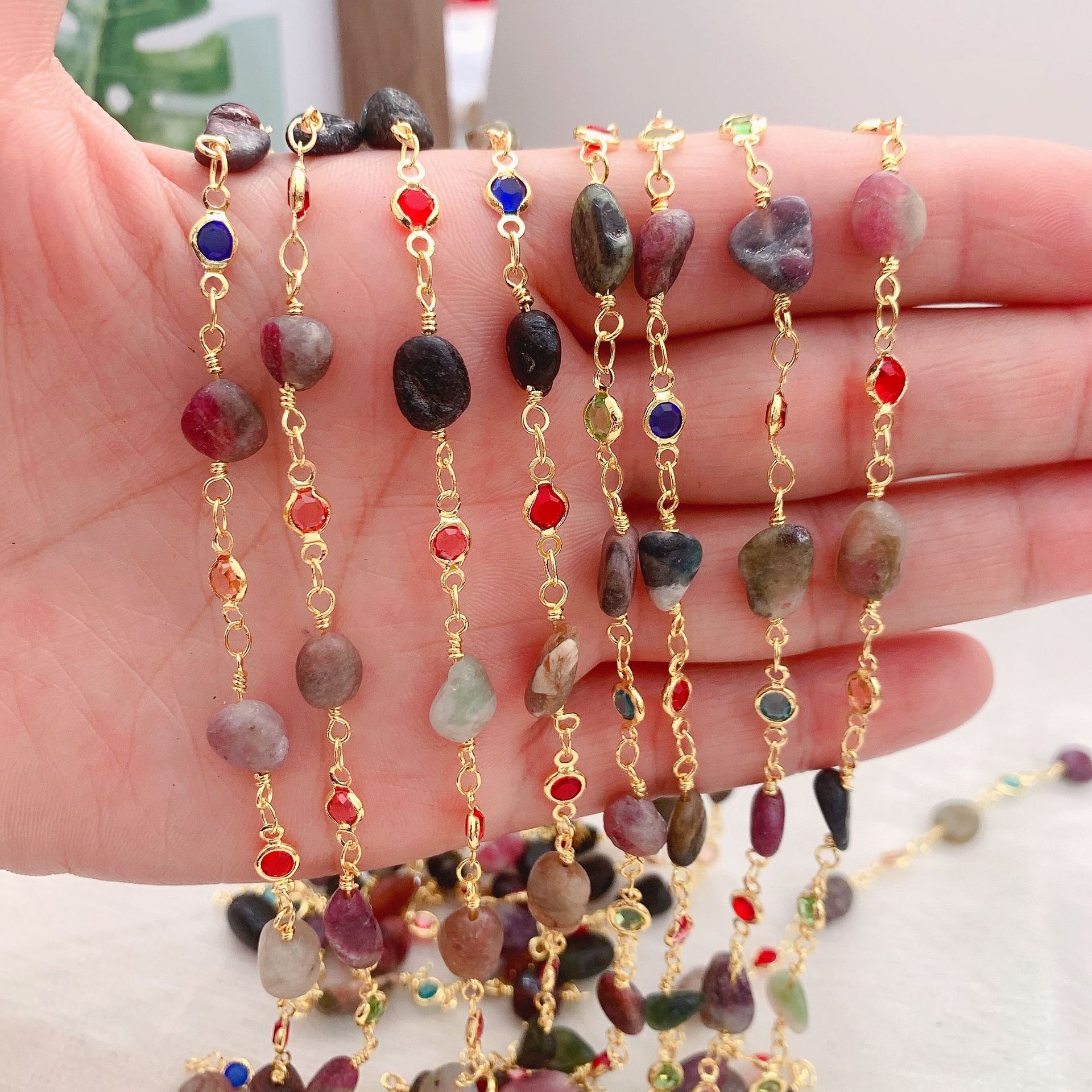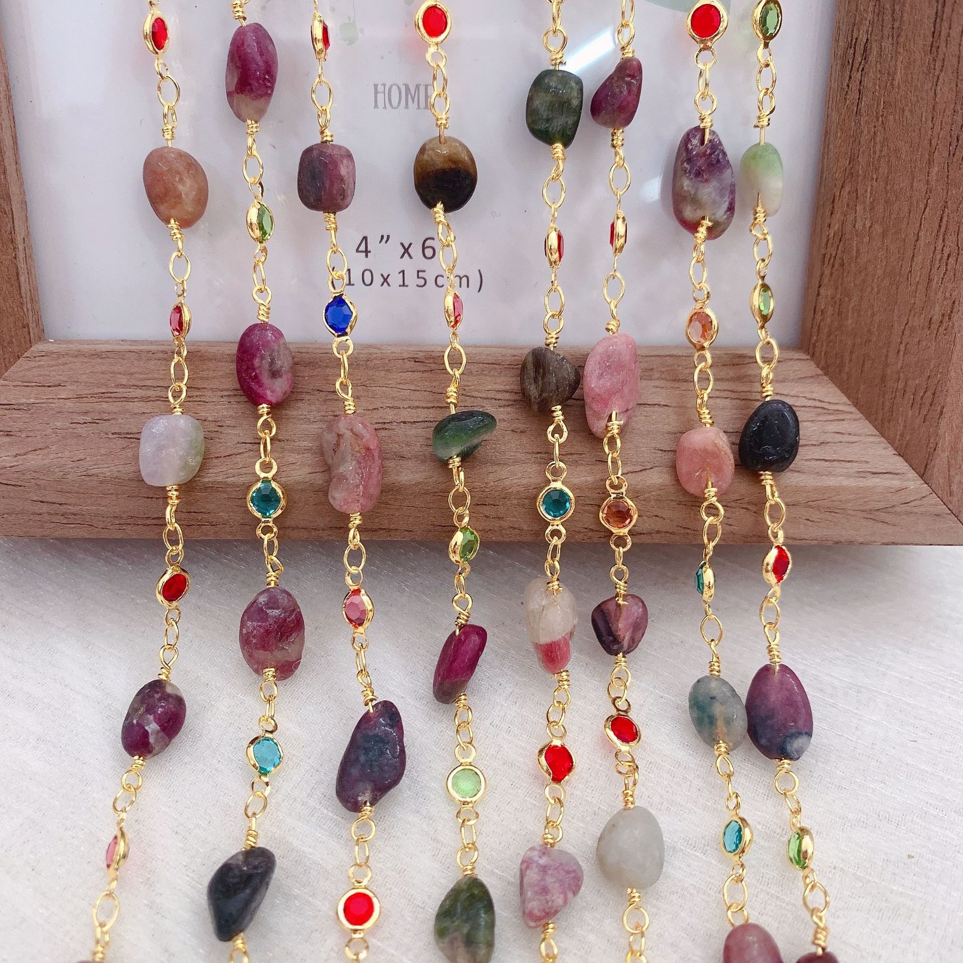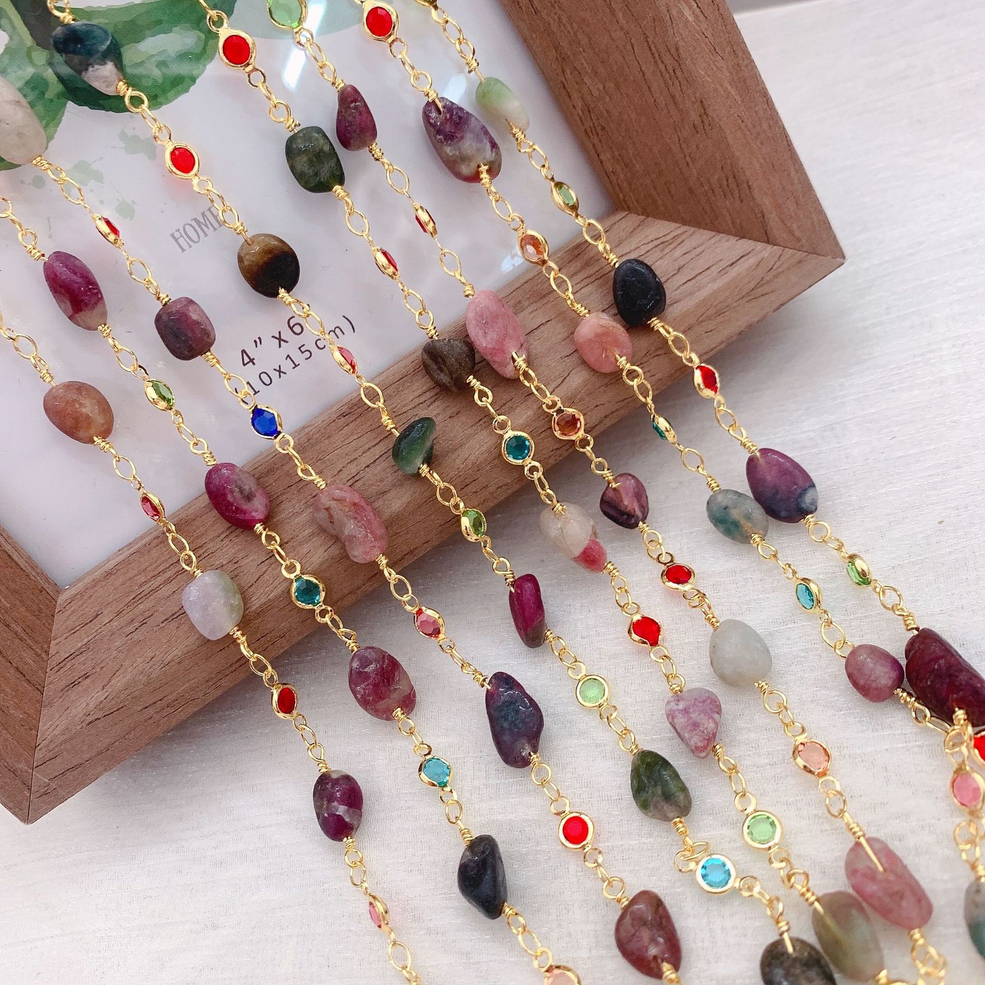 Edelstein Perlen Kette, Messing, mit Synthetischer Edelstein, goldfarben plattiert, DIY, gemischte Farben, 10m/Tasche, verkauft von Tasche