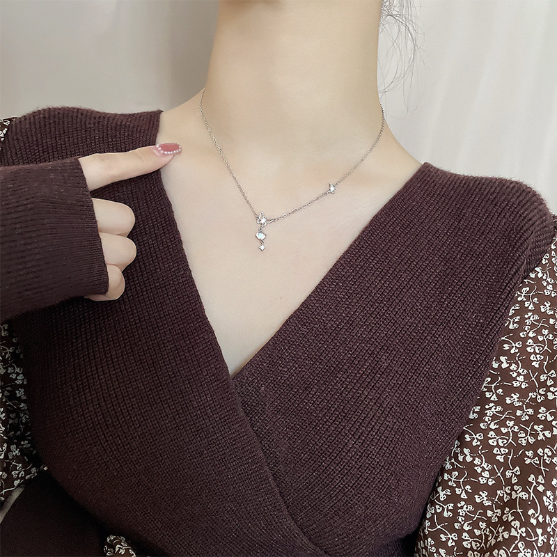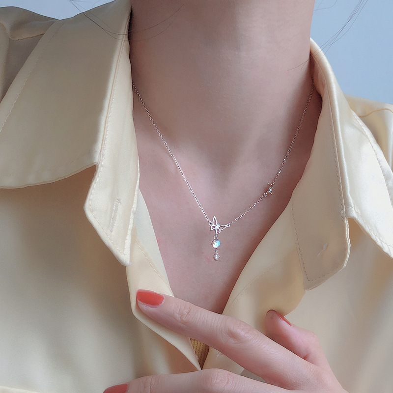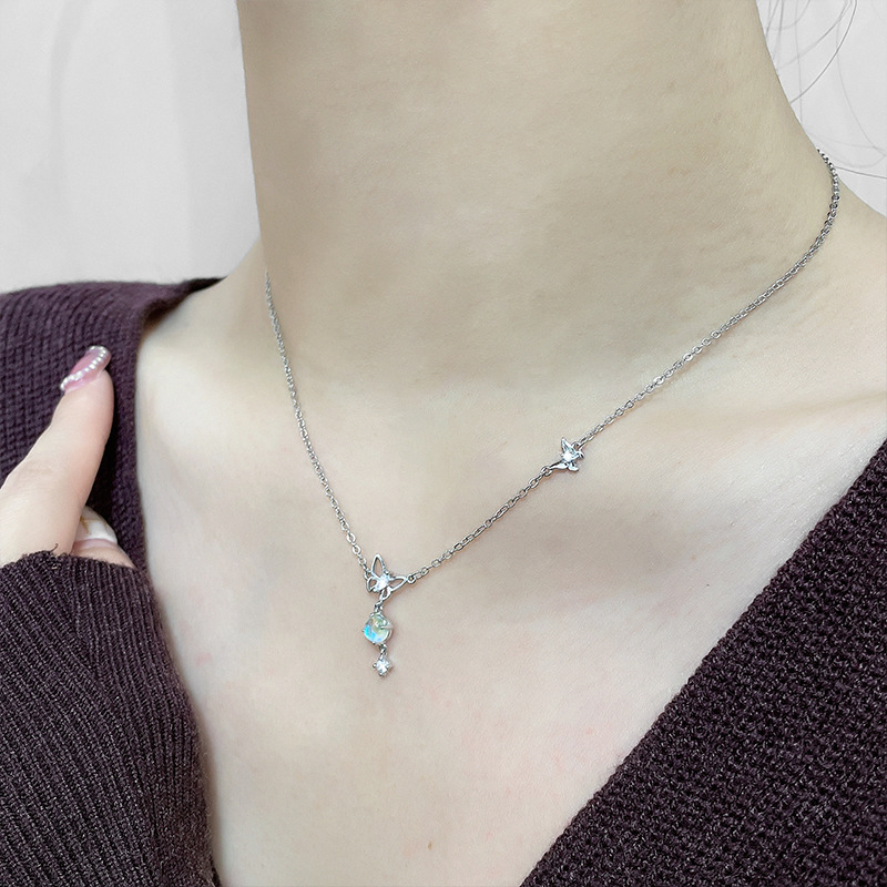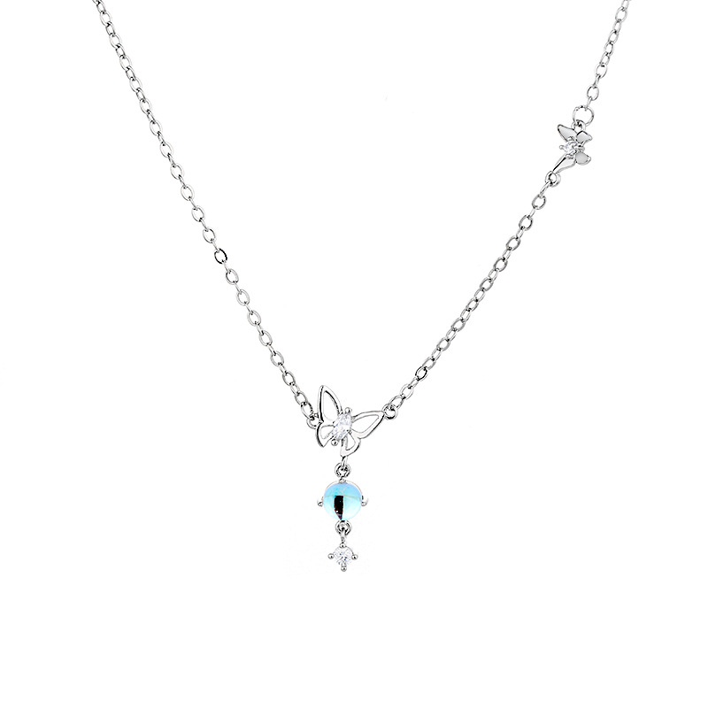 Zirkonia Mikro pflastern Messinghalsketten, Messing, mit Mondstein, mit Verlängerungskettchen von 5CM, Schmetterling, plattiert, Micro pave Zirkonia & für Frau, Platin Farbe, Länge:ca. 40 cm, verkauft von PC