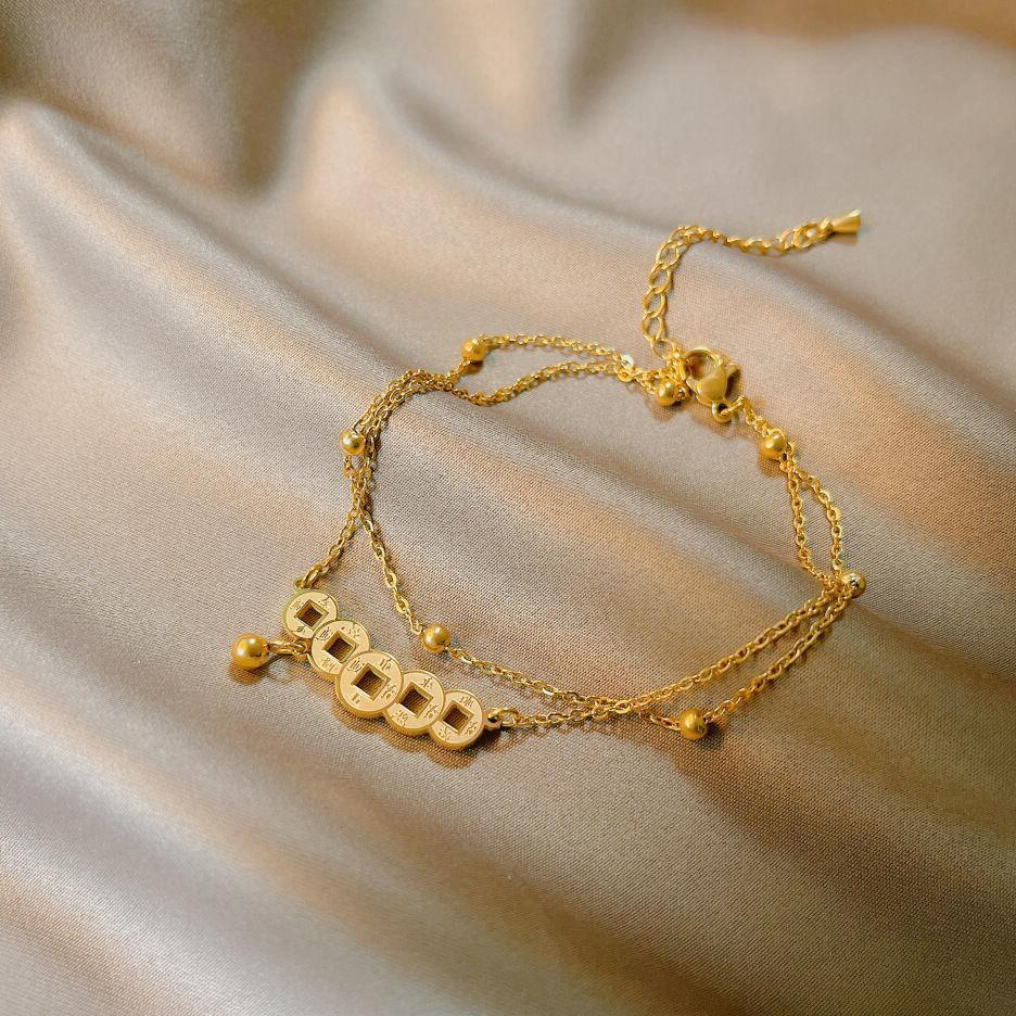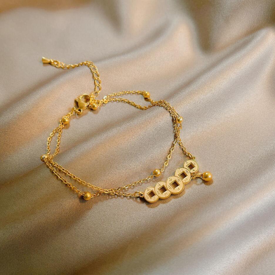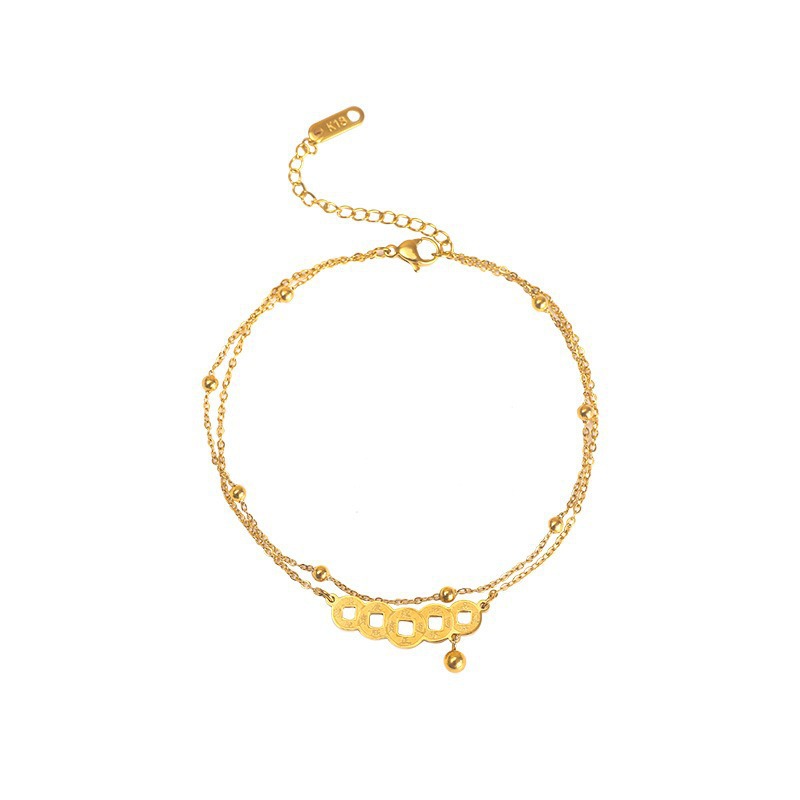 Edelstahl Fußkettchen Schmuck, Titanstahl, mit Verlängerungskettchen von 5cm, plattiert, Doppelschicht & für Frau & hohl, goldfarben, Länge:ca. 21 cm, verkauft von PC