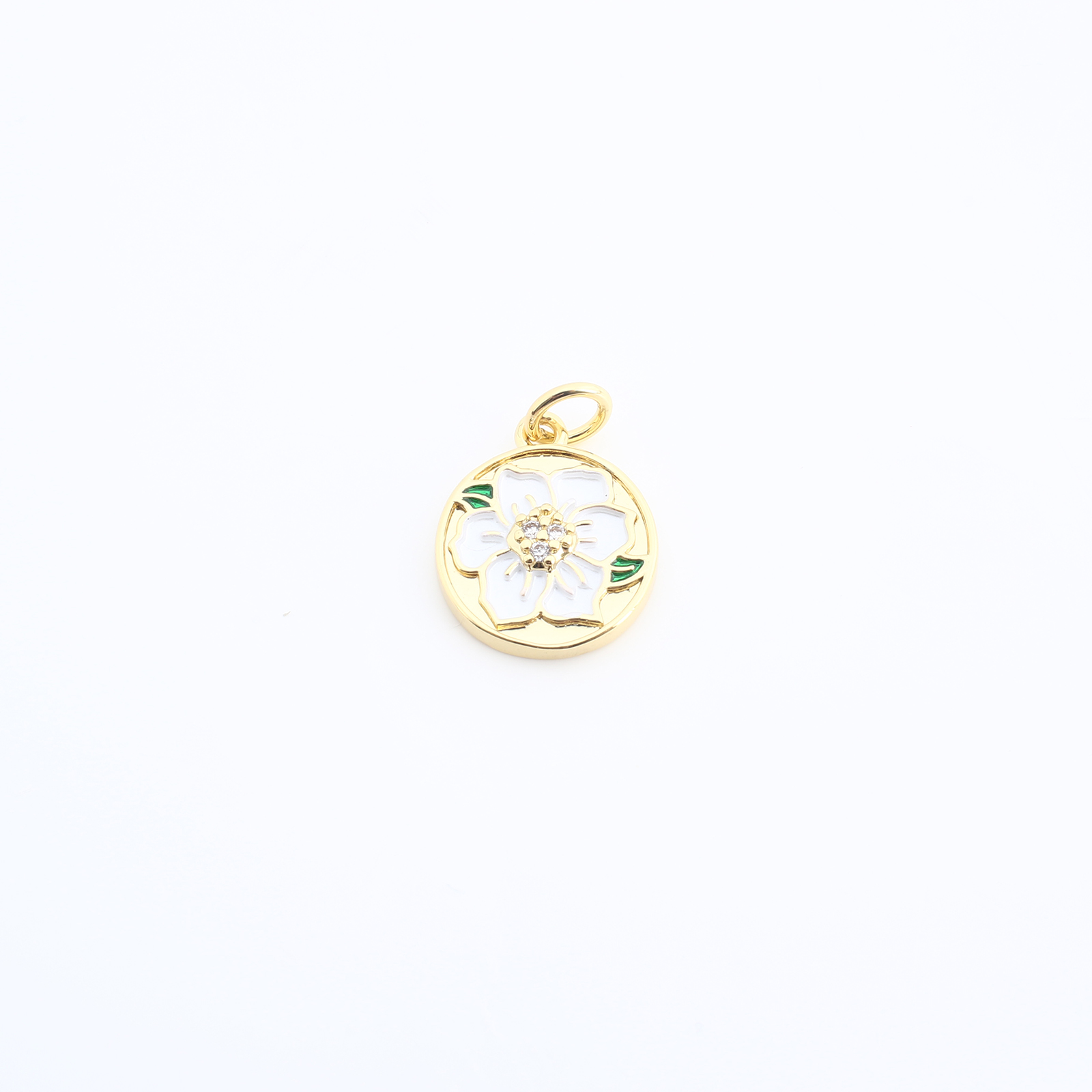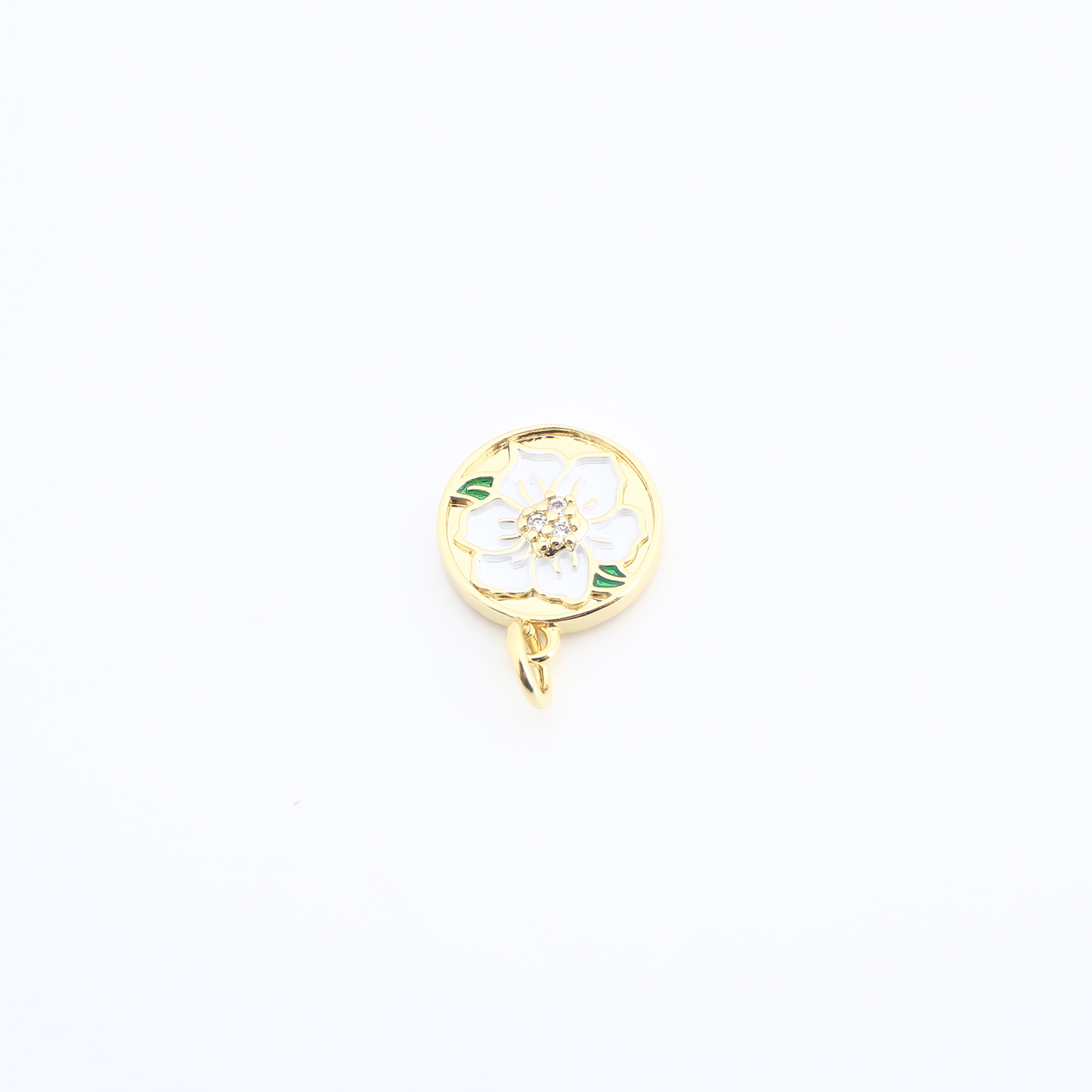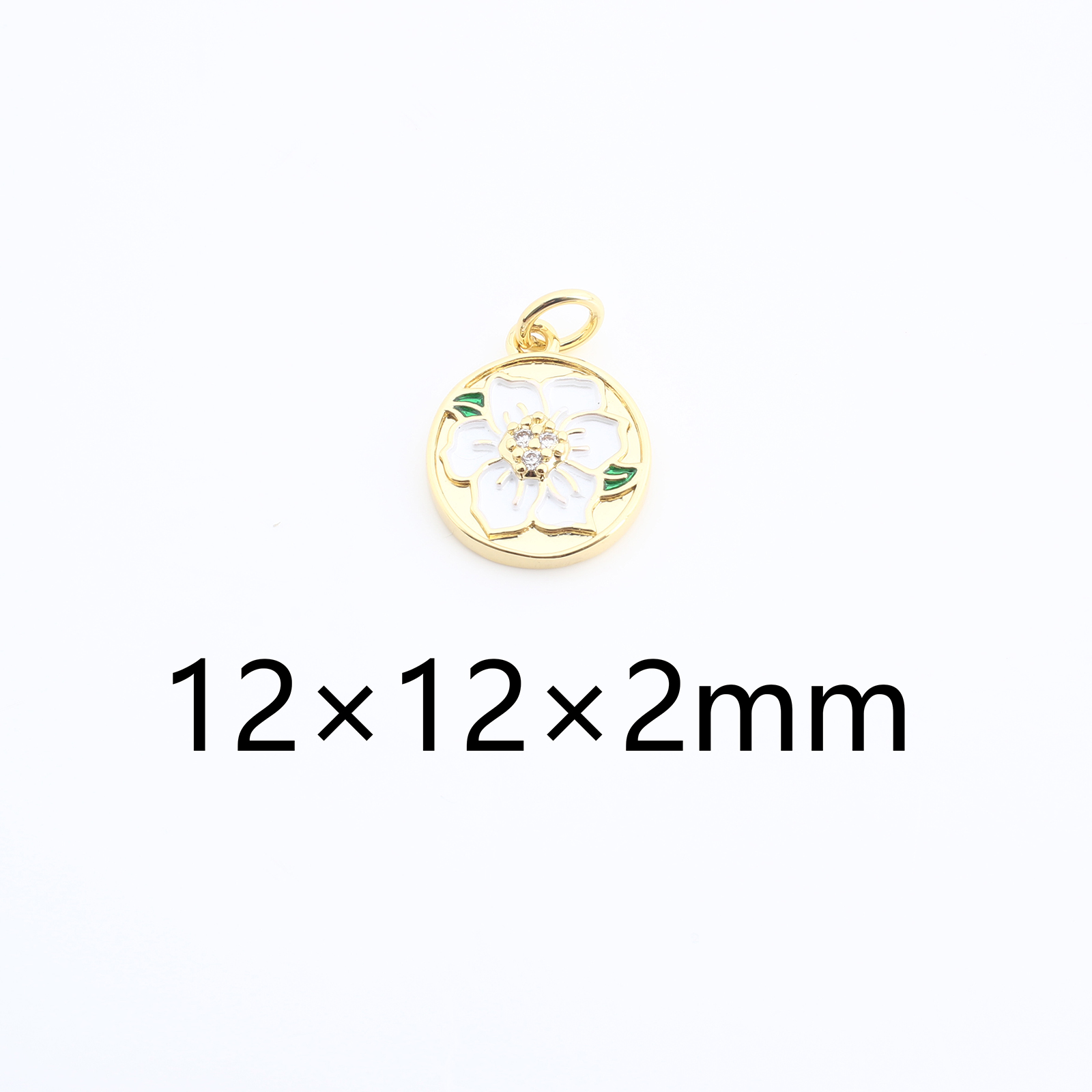 Emaille Messing Anhänger, flache Runde, goldfarben plattiert, DIY & mit Blumenmuster & mit Strass, 12x12x2mm, verkauft von PC