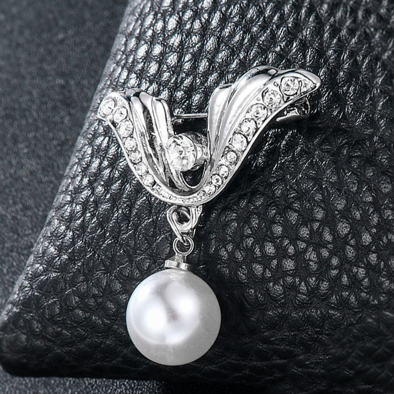Kunststoff-Perlen-Brosche, Zinklegierung, mit Kunststoff Perlen, silberfarben plattiert, für Frau & mit Strass, 35x32mm, verkauft von PC