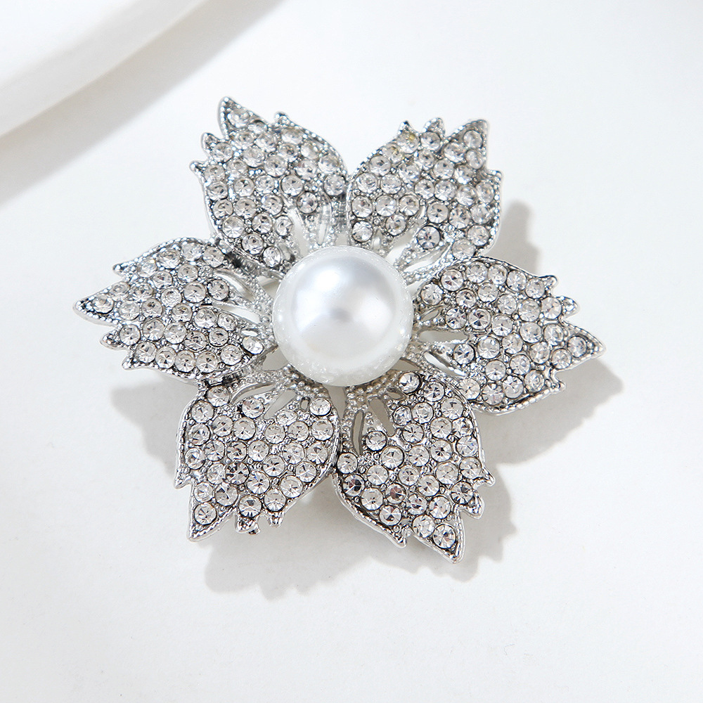 Kunststoff-Perlen-Brosche, Zinklegierung, mit ABS-Kunststoff-Perlen, Blume, silberfarben plattiert, für Frau & mit Strass, keine, frei von Blei & Kadmium, 42x42mm, verkauft von PC