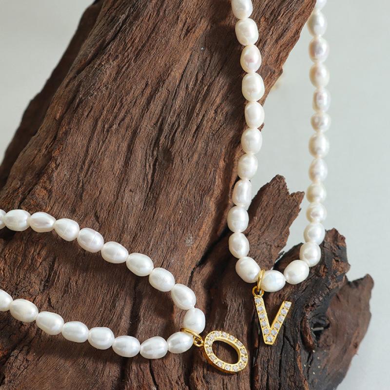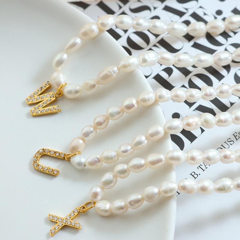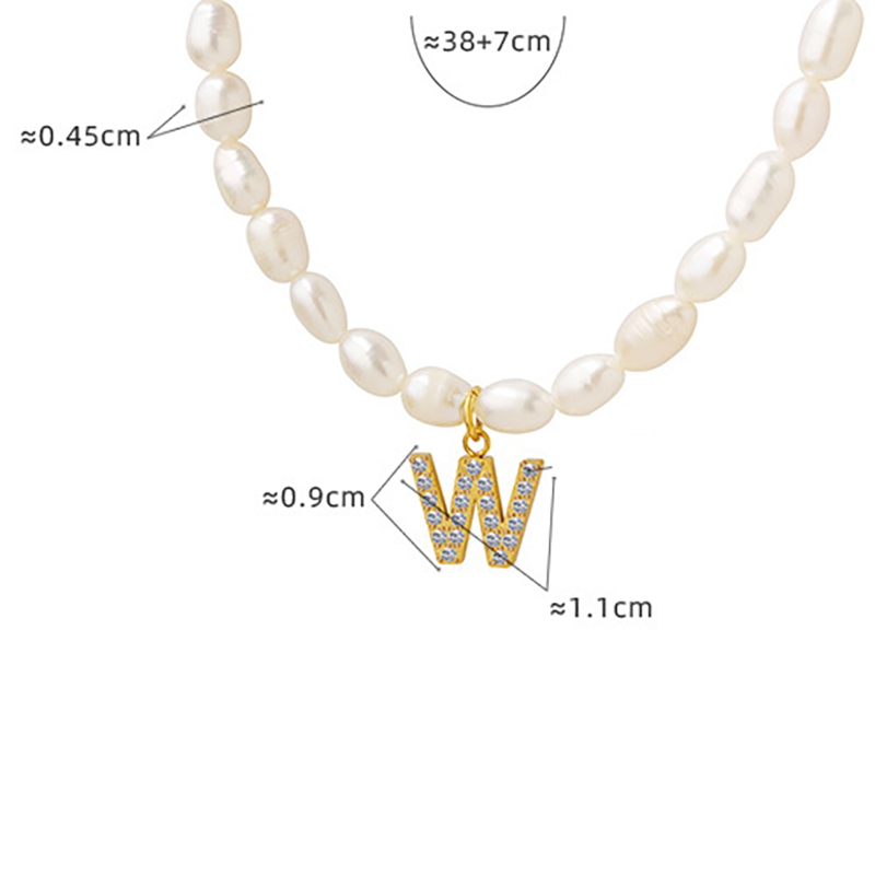 Natürliche Süßwasserperlen Halskette, Titanstahl, mit Natürliche kultivierte Süßwasserperlen, mit Verlängerungskettchen von 7cm, Alphabet-Buchstabe, plattiert, Modeschmuck & Micro pave Zirkonia & für Frau, goldfarben, Länge:ca. 38 cm, verkauft von PC