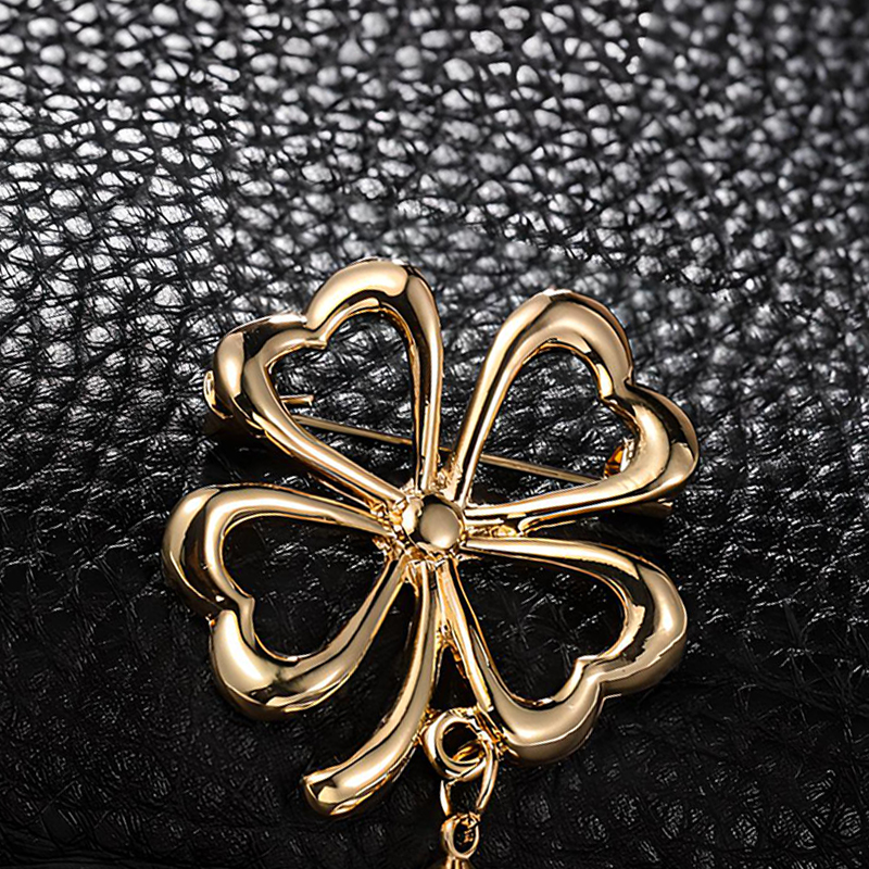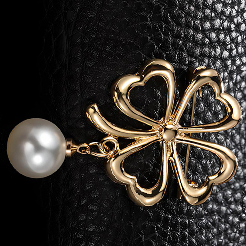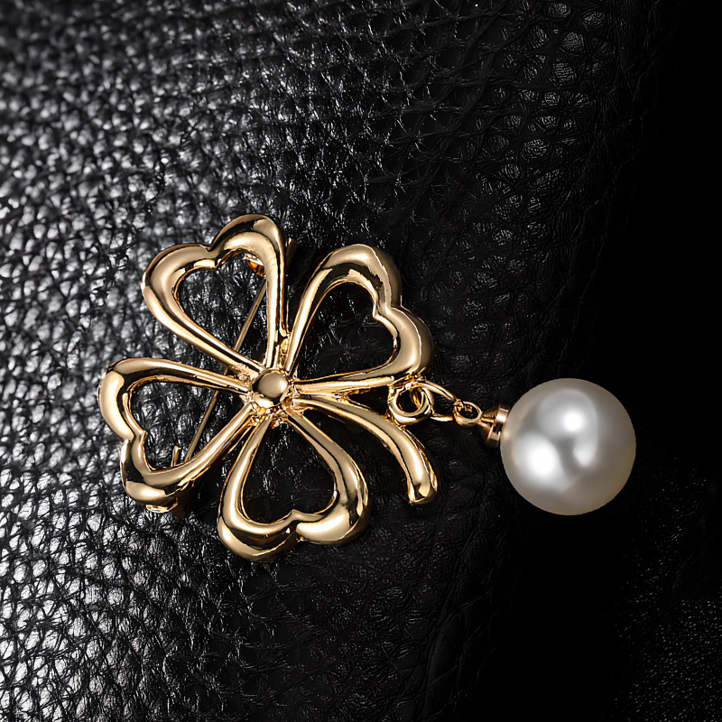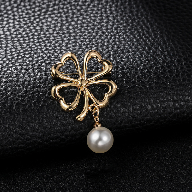 Zinklegierung Brosche, mit Kunststoff Perlen, vierblättriges Kleeblatt, goldfarben plattiert, für Frau & hohl, 29x42mm, verkauft von PC