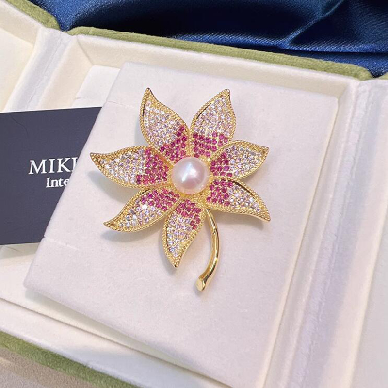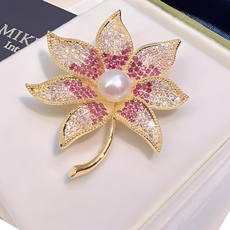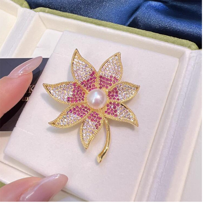 Zinklegierung Brosche, mit Kunststoff Perlen, Ahornblatt, goldfarben plattiert, für Frau & mit Strass, 40x50mm, verkauft von PC
