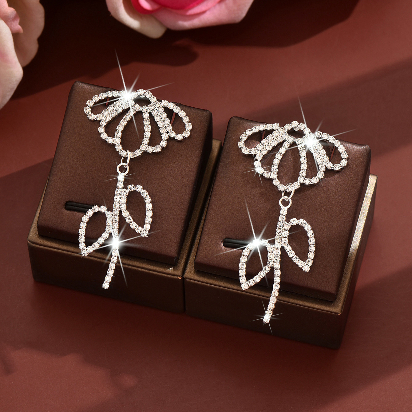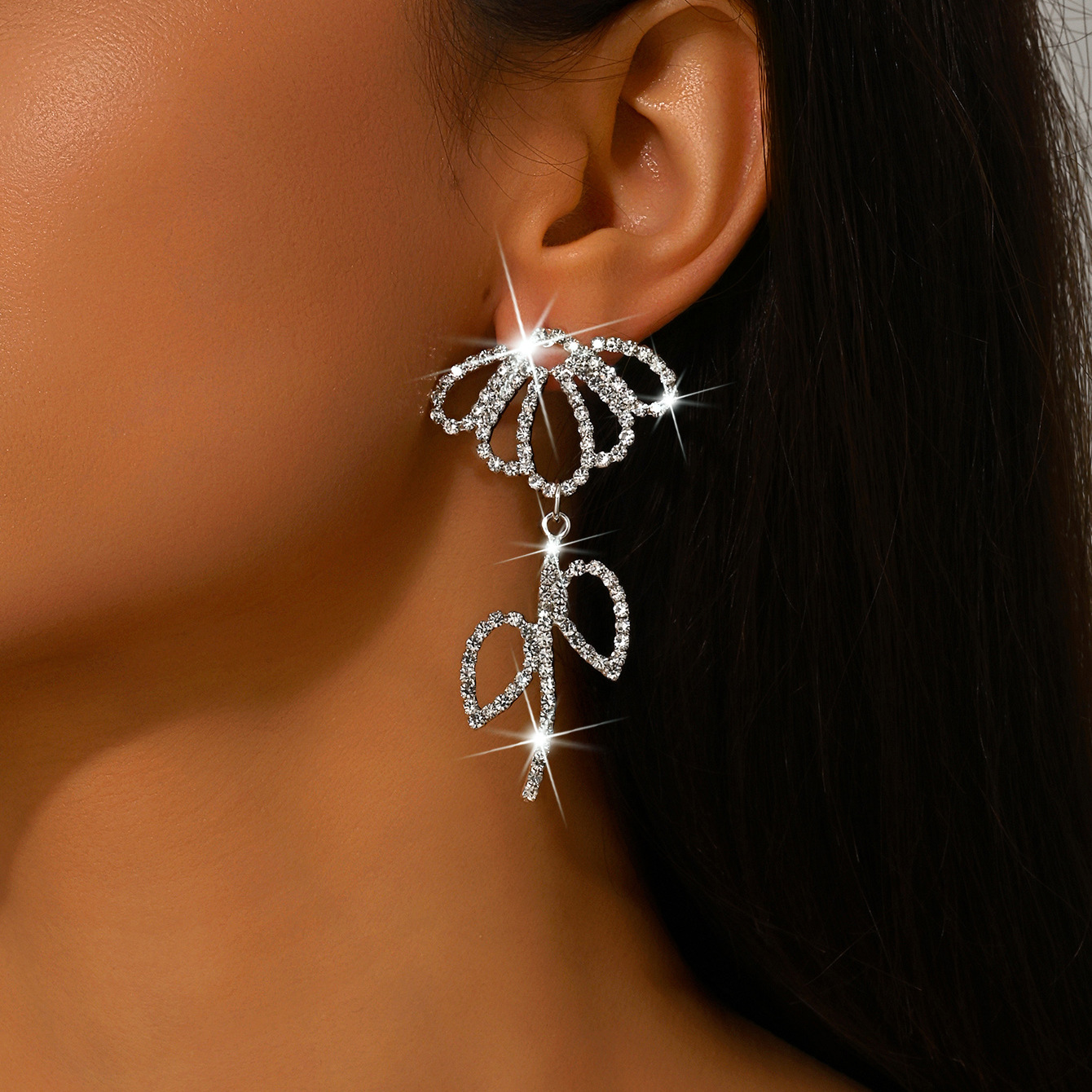 Messing Tropfen Ohrring, Blume, silberfarben plattiert, für Frau & mit Strass & hohl, verkauft von Paar
