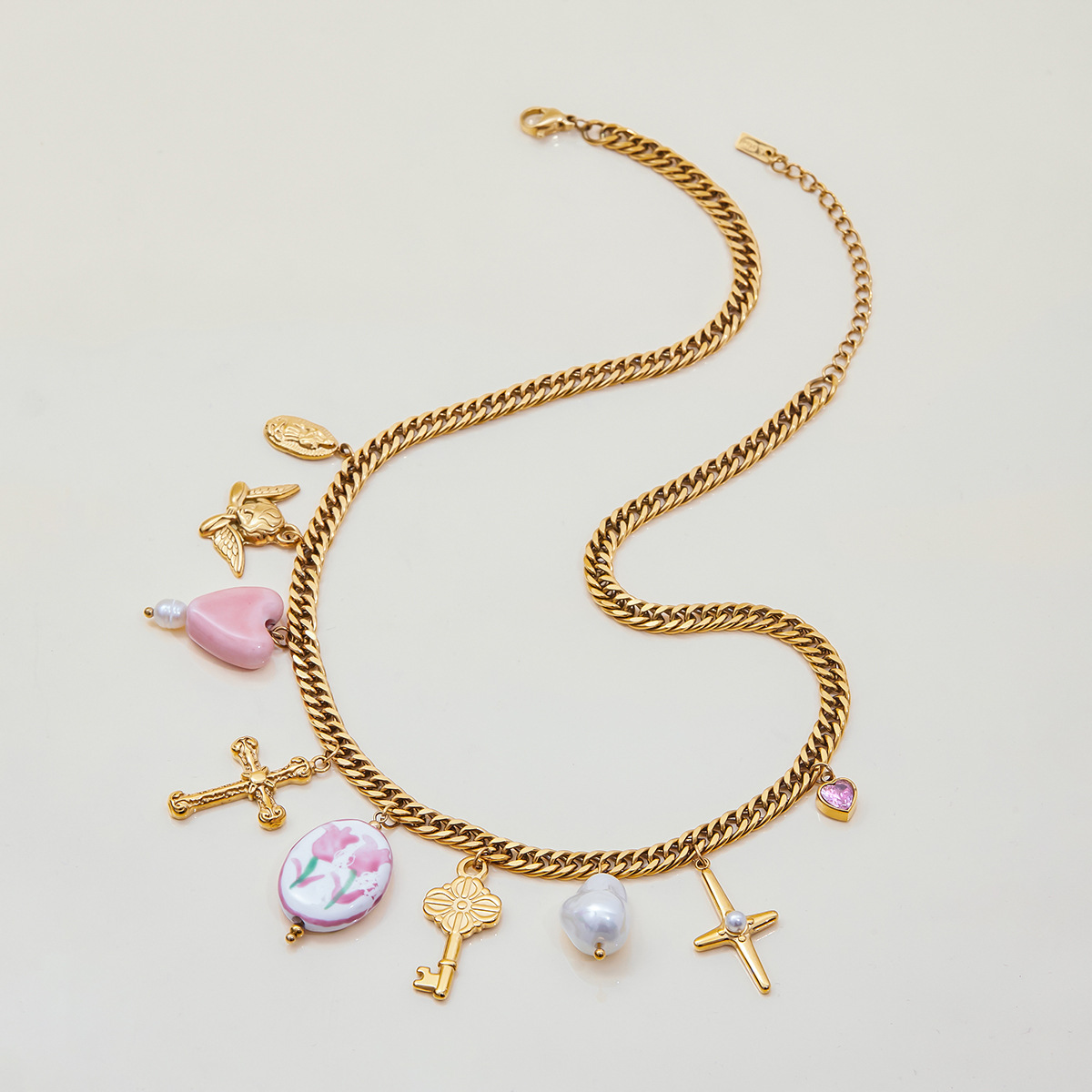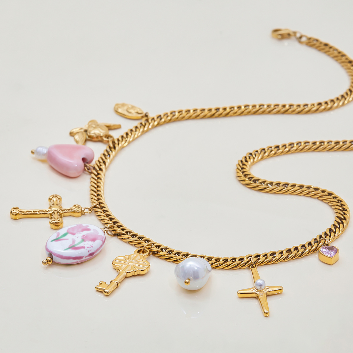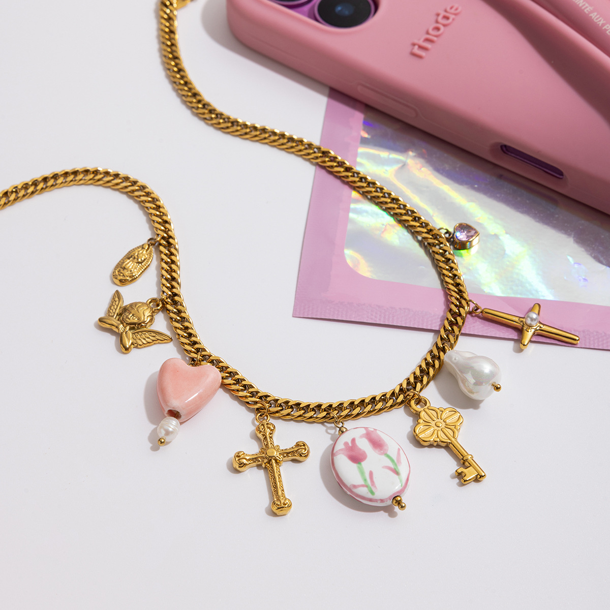 Collar de Acero Inoxidable, acero inoxidable 304, con cúbica circonia & Porcelana & Perlas plásticas, 18K chapado en oro, Joyería & diferentes estilos para la opción & para mujer, Vendido por UD
