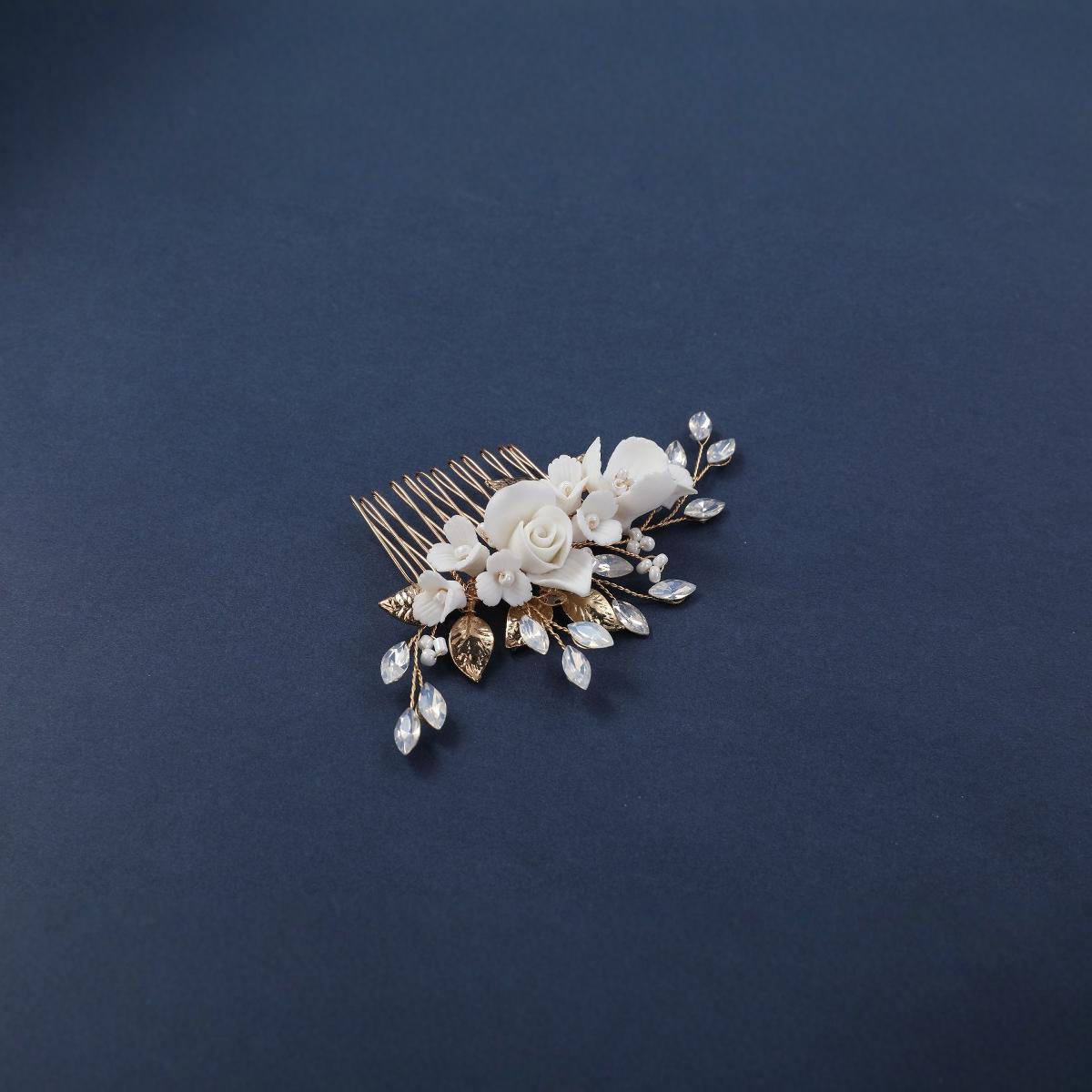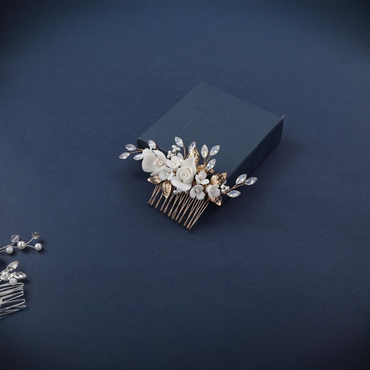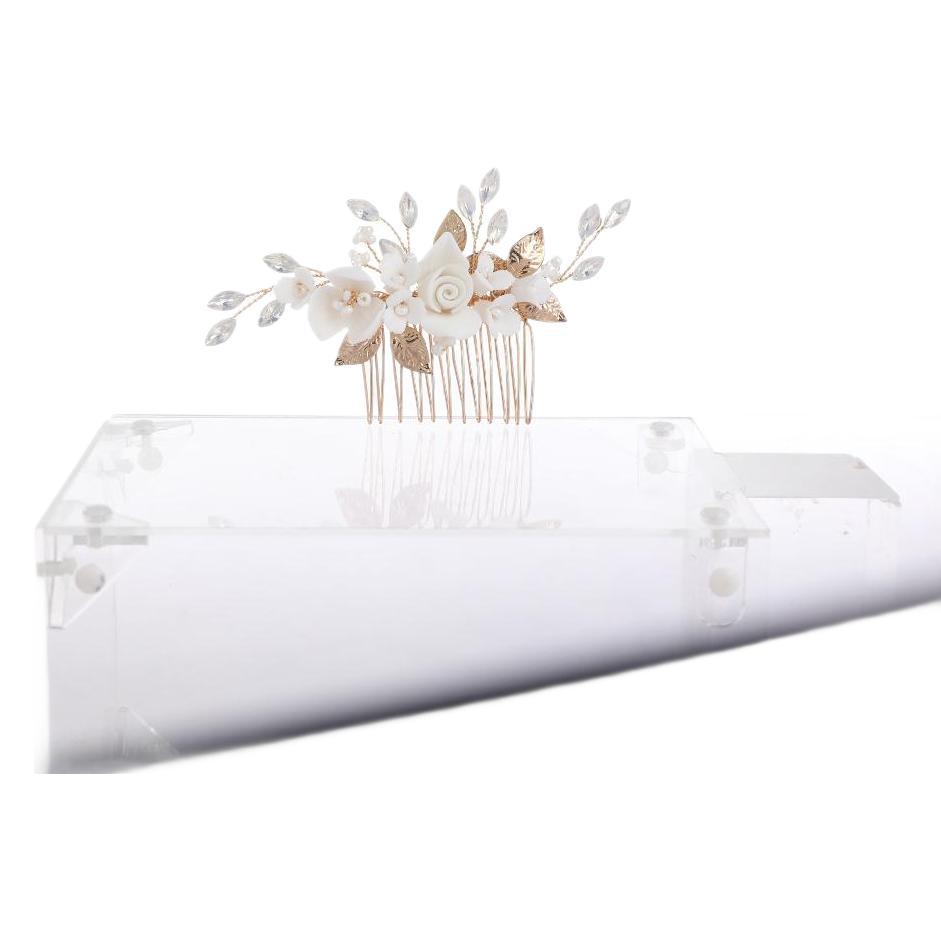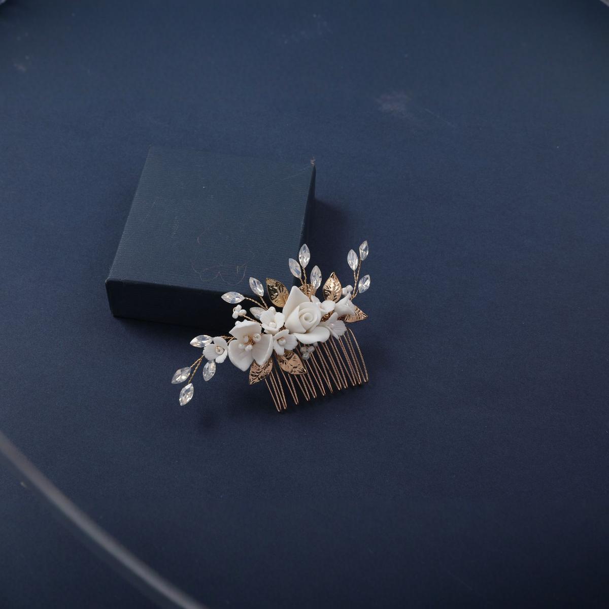 Peine Decorativo para Novia, aleación de zinc, con alambre de latón & Arcilla polimero & Cristal & Perlas plásticas, hecho a mano, Joyería & para mujer, dorado, 140x80x10mm, Vendido por UD
