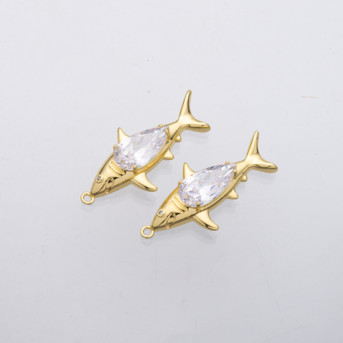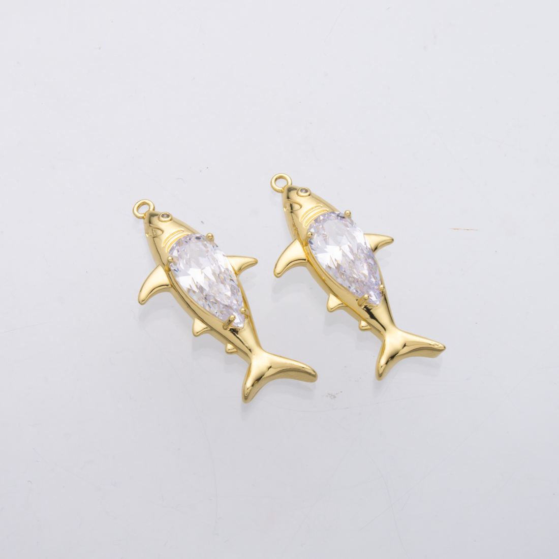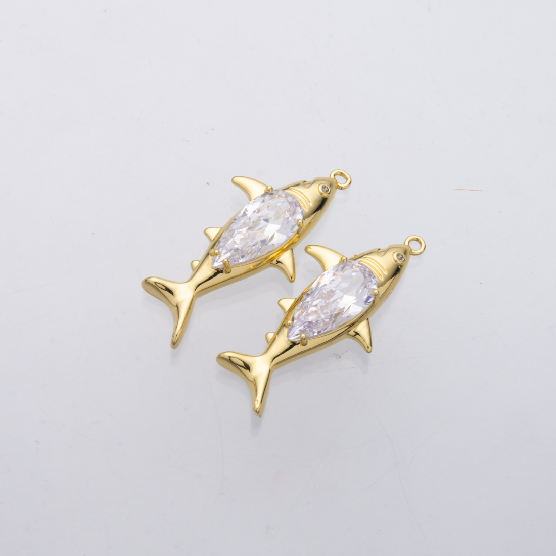Colgantes de latón cúbicos Circonia (CZ), metal, Pez, chapado en color dorado, 42x21x9mm, Vendido por UD