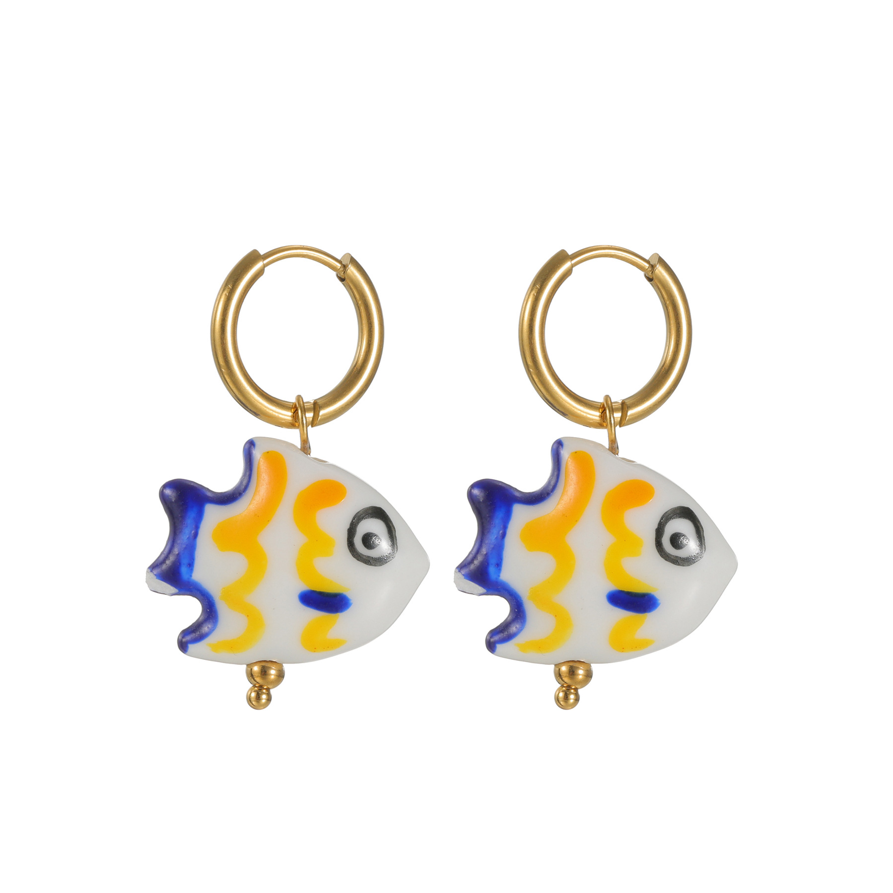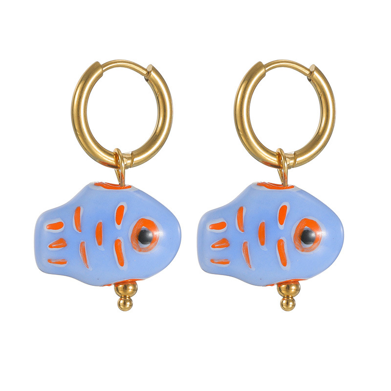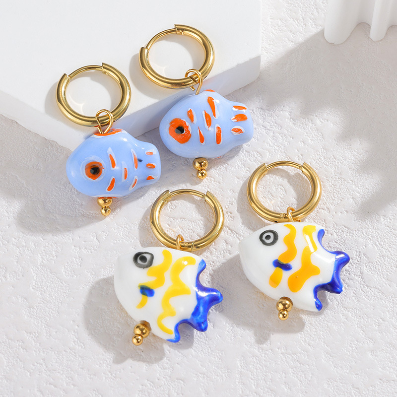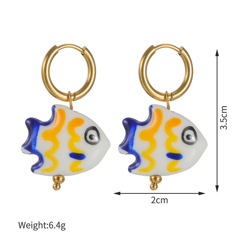 Pendiente de la joyería de la porcelana, acero inoxidable 304, con Porcelana, Pez, dibujo de la mano, para mujer, Vendido por Par