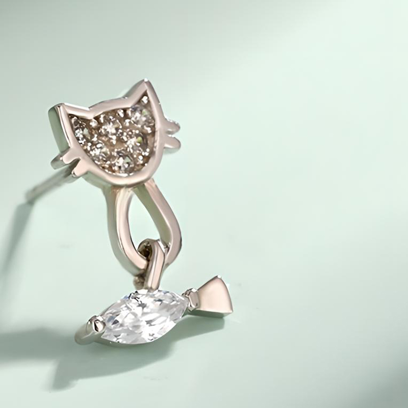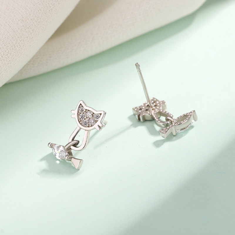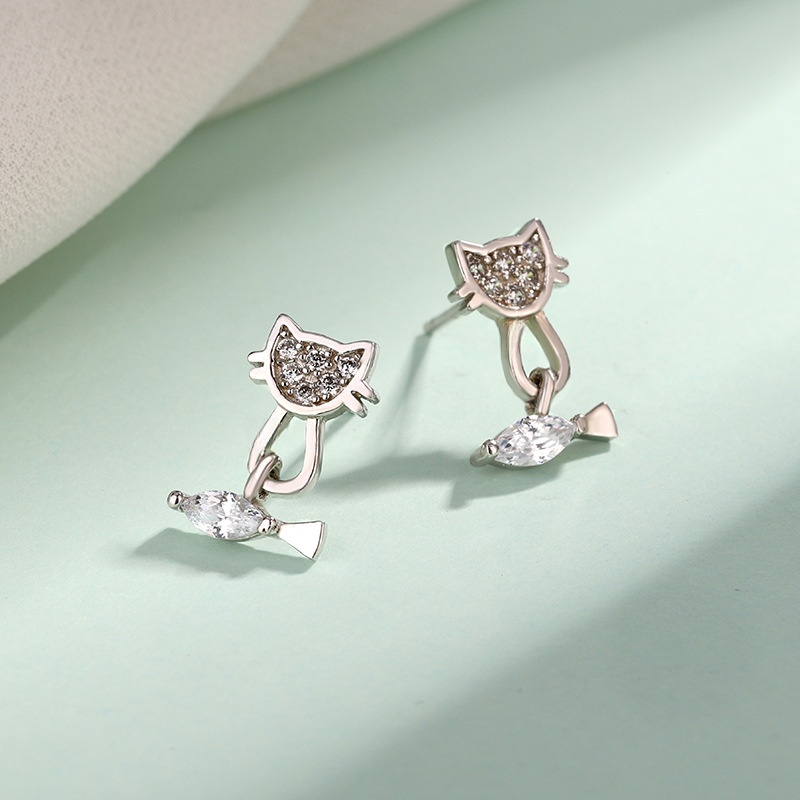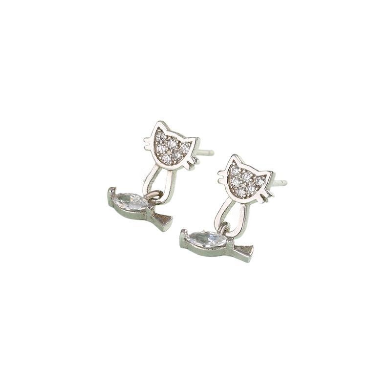 Plata de ley 925 Pendientes con Colgantes, Gato y pescados, chapado en platina real, para mujer & con diamantes de imitación, 8.4x12.6mm, Vendido por Par
