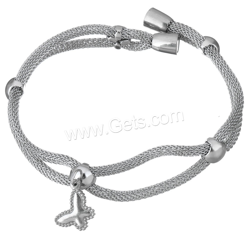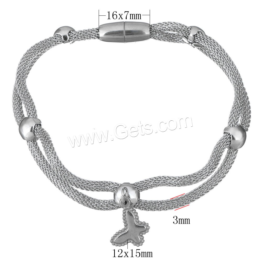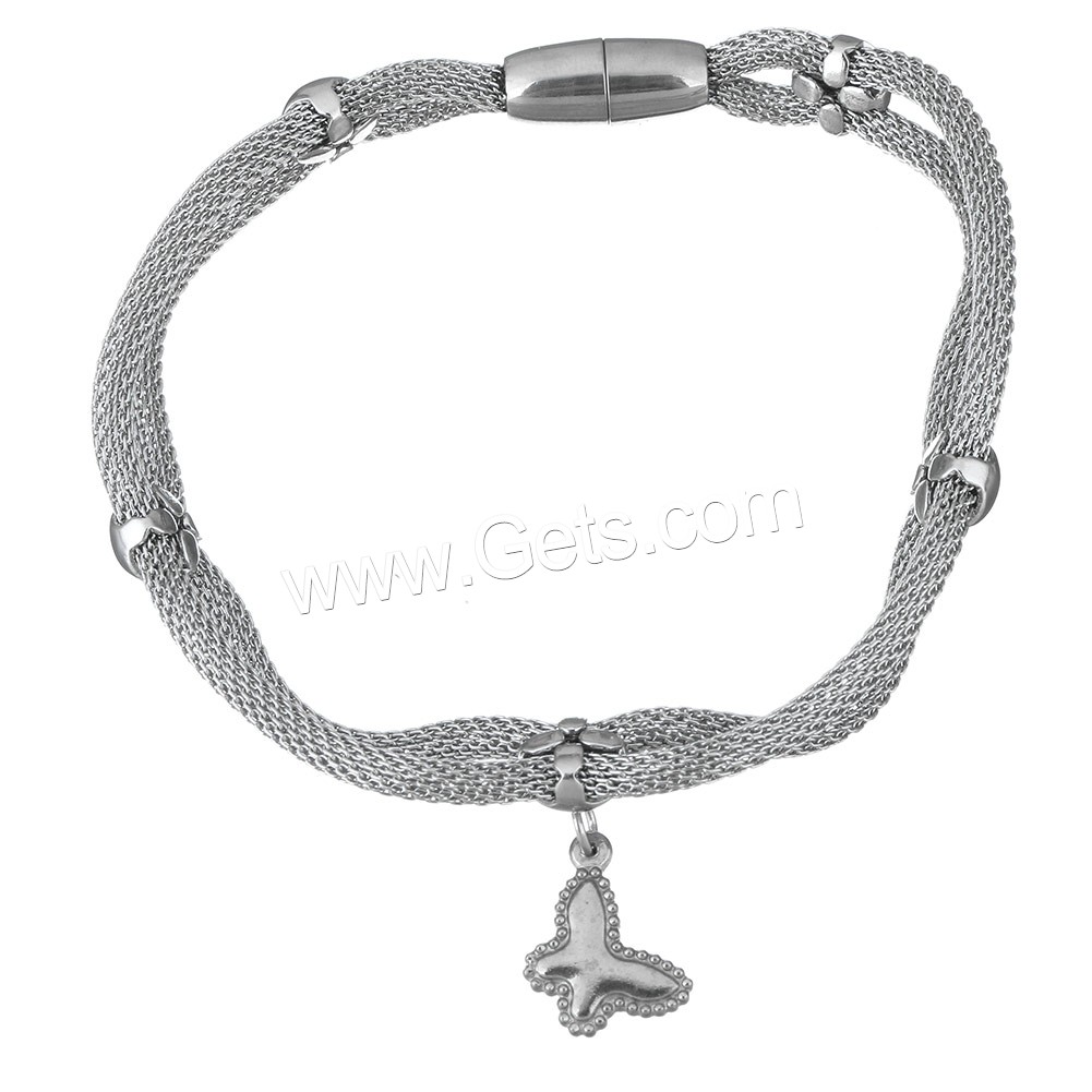 Bracelet Tube maille, acier inoxydable, papillon, bracelet à breloques & chaîne de maille & pour femme, couleur originale, 12x15mm, 3mm, 16x7mm, Longueur:Environ 8 pouce, Vendu par brin