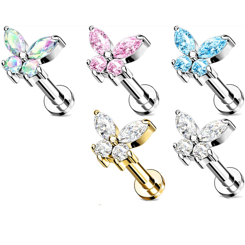 Acier inoxydable 304 Goujons perforés pour les lèvres, papillon, Placage, pavé de micro zircon & pour femme, plus de couleurs à choisir, 10mm, Vendu par PC