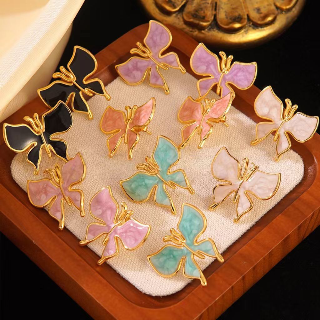 Acier inoxydable 304 boucle d oreille dormeuse, papillon, Placage de couleur d'or, pour femme & émail, plus de couleurs à choisir, 28x25mm, Vendu par paire