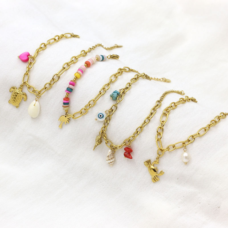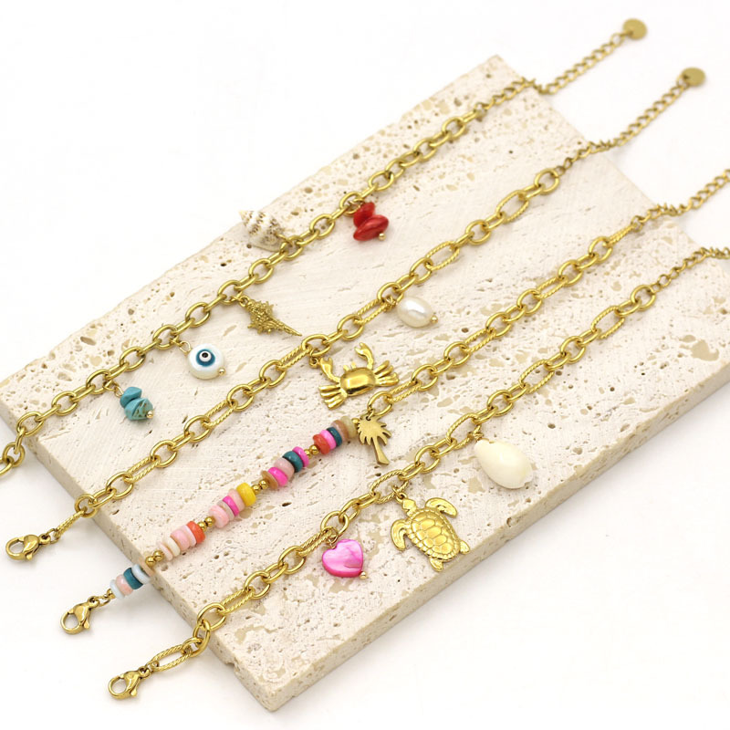 Acier inoxydable 304 bracelet, avec pierre gemme & coquille & résine & perle de plastique, Placage de couleur d'or, bijoux de mode, plus de couleurs à choisir, 170x120x10mm, Vendu par PC