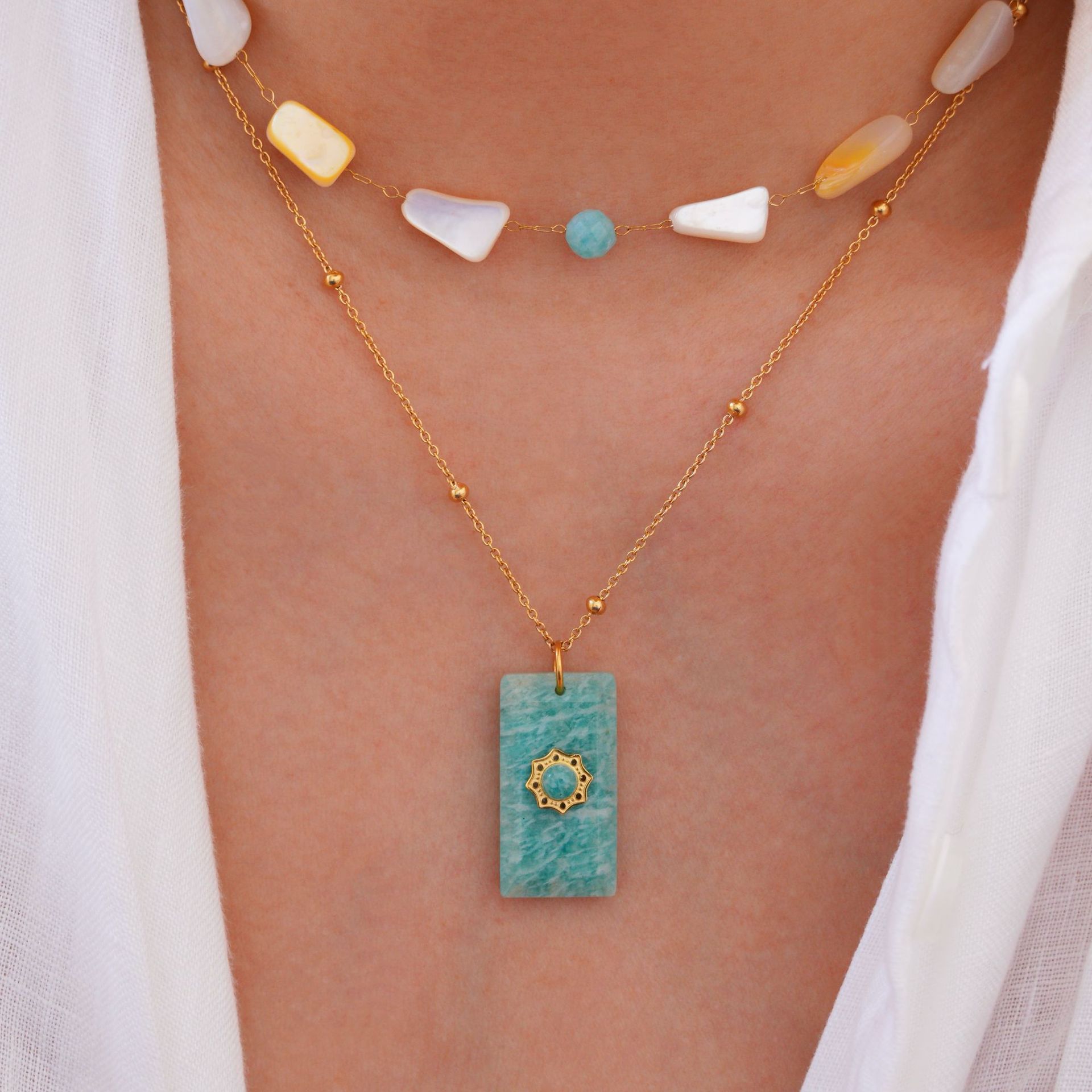 Acier titane collier, avec Amazonite & coquille jaune, Placage de couleur d'or, styles différents pour le choix & pour femme, Longueur:Environ 16-18 pouce, Vendu par PC