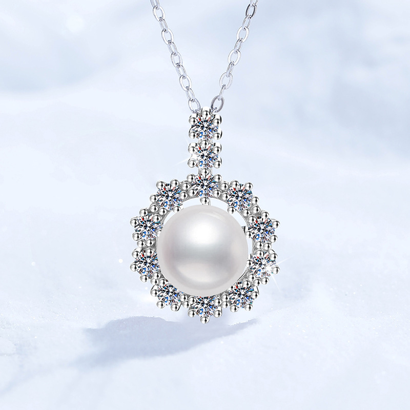 Argent sterling 925 collier, avec Moissanite & perle d'eau douce cultivée, avec 2inch chaînes de rallonge, fleur, Chaîne transversale & pour femme, Longueur:Environ 15.7 pouce, Vendu par PC