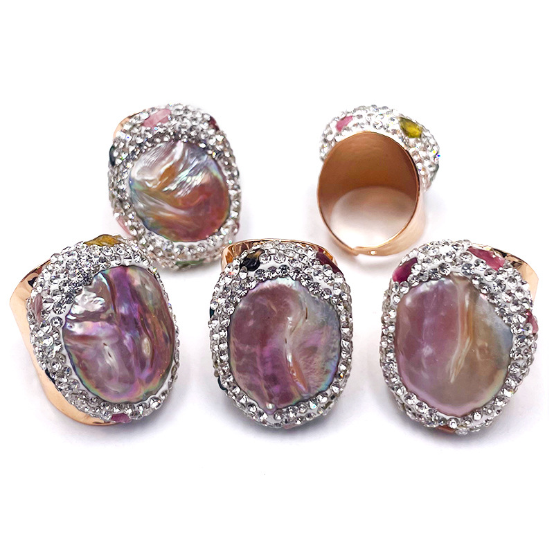 Bague de perle de culture d'eau douce, laiton, avec perle, Plat rond, Placage de couleur platine, avec strass, couleurs mélangées, protéger l'environnement, sans nickel, plomb et cadmium, 7-8mm  .5 îte, Vendu par boîte