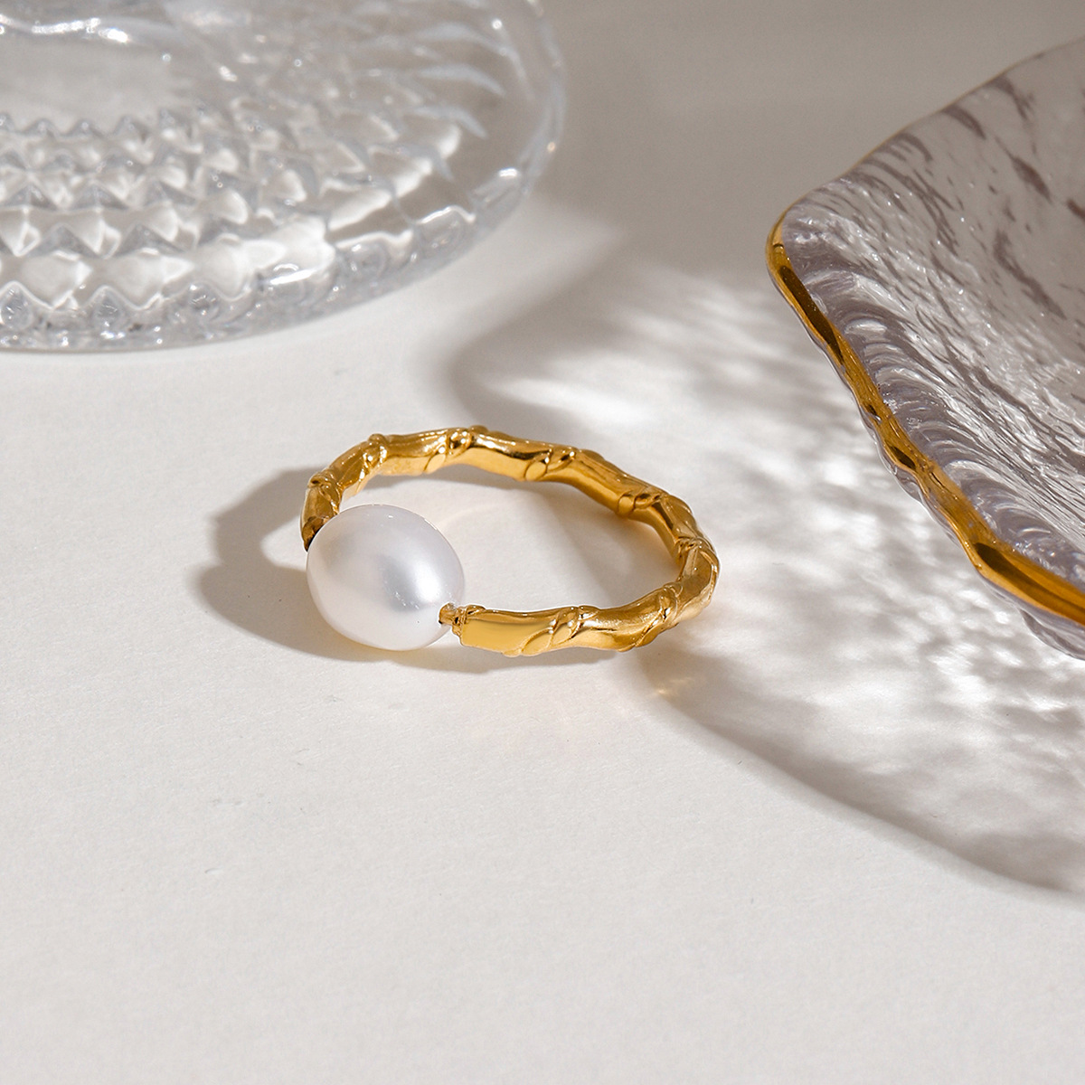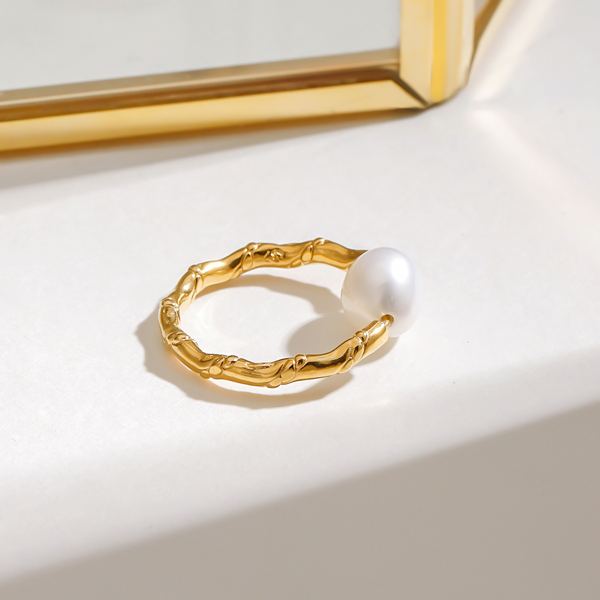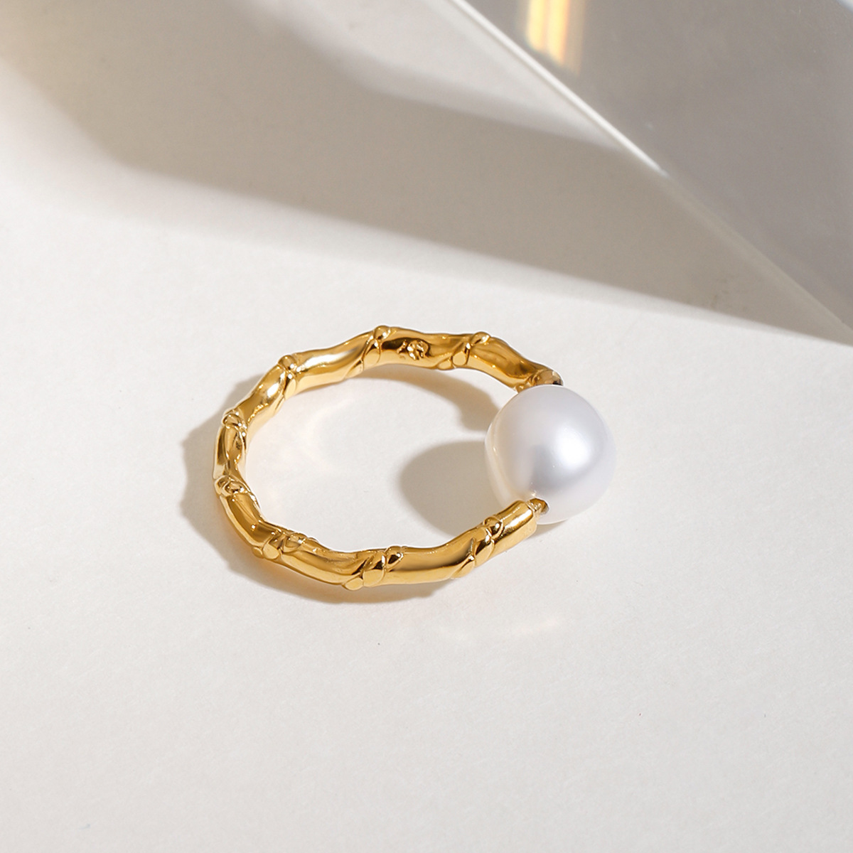 Bague en acier inoxydable, Acier inoxydable 304, avec perle de plastique, Placage de couleur d'or, bijoux de mode, doré, Vendu par PC