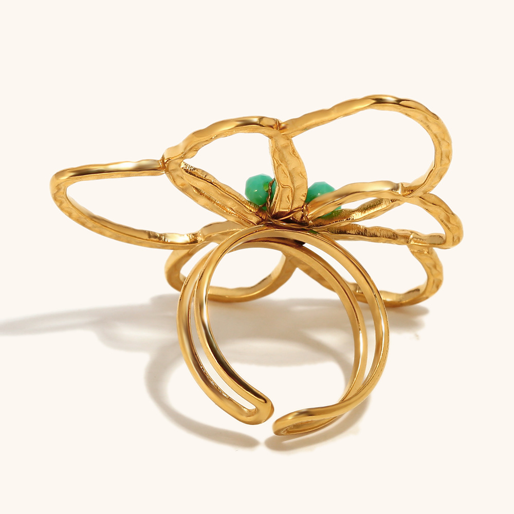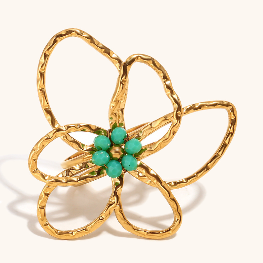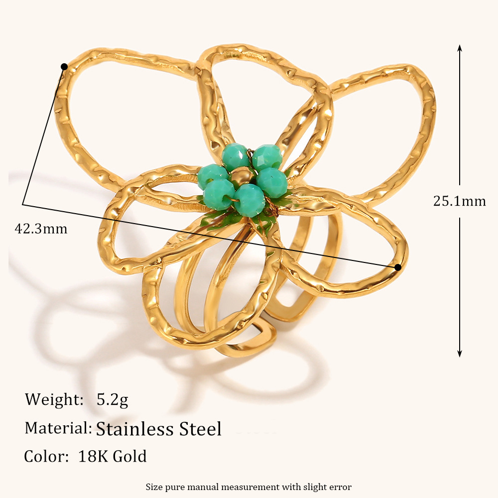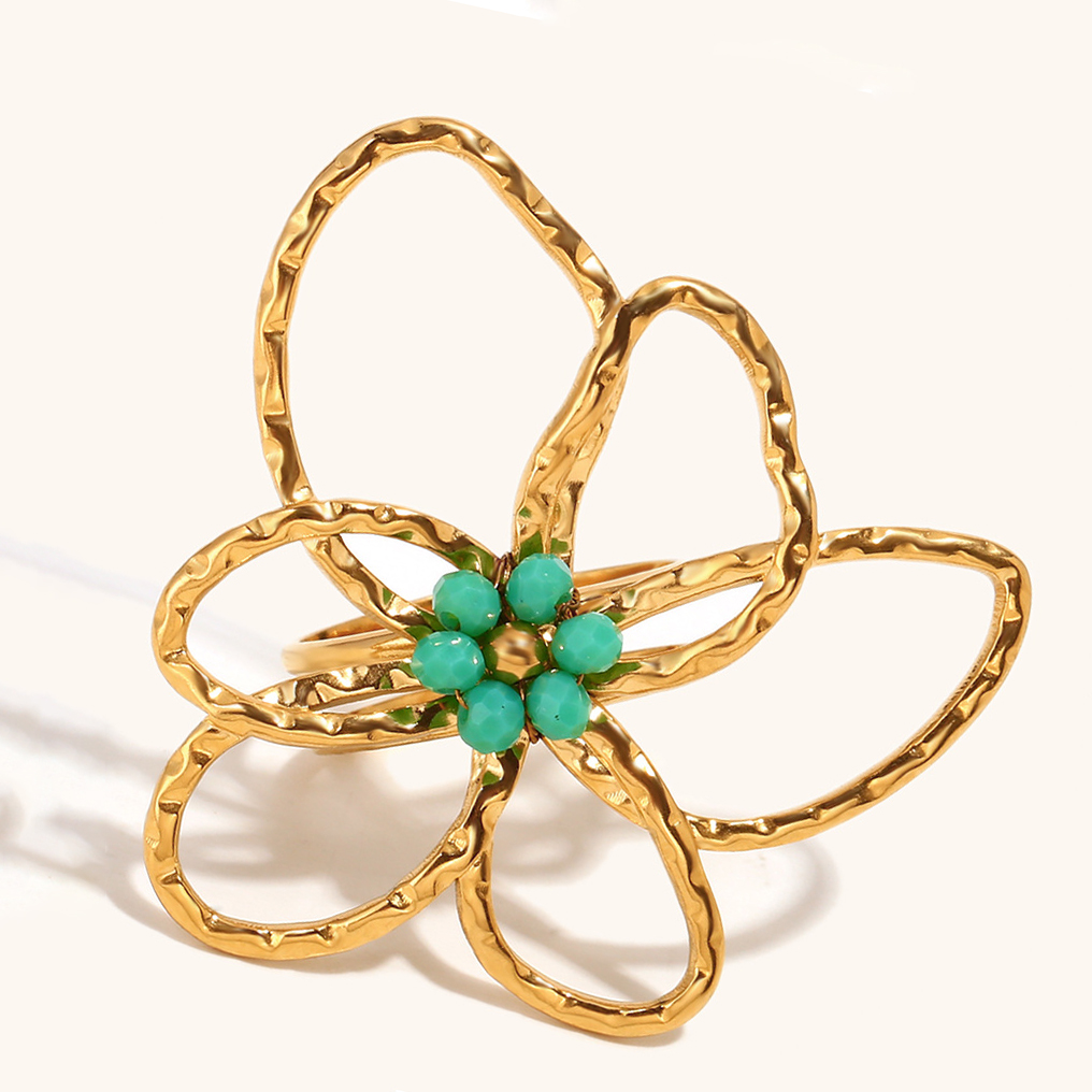 Bague en acier inoxydable, Acier inoxydable 304, avec plastique, fleur, Placage de couleur d'or, pour femme, vert, Vendu par paire