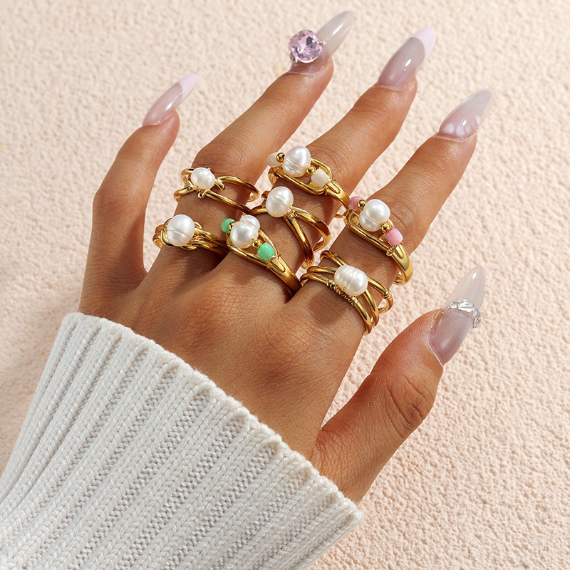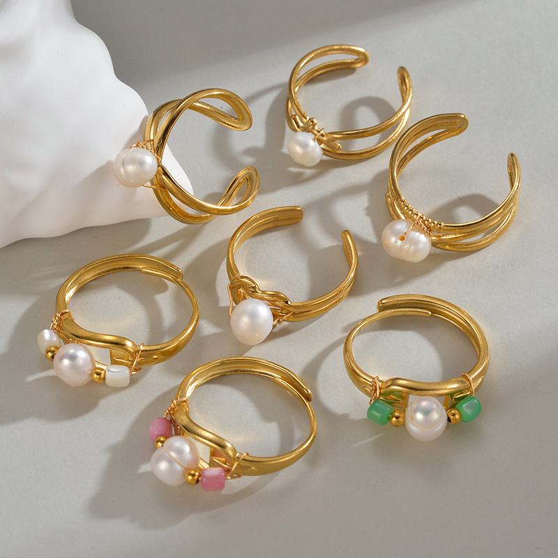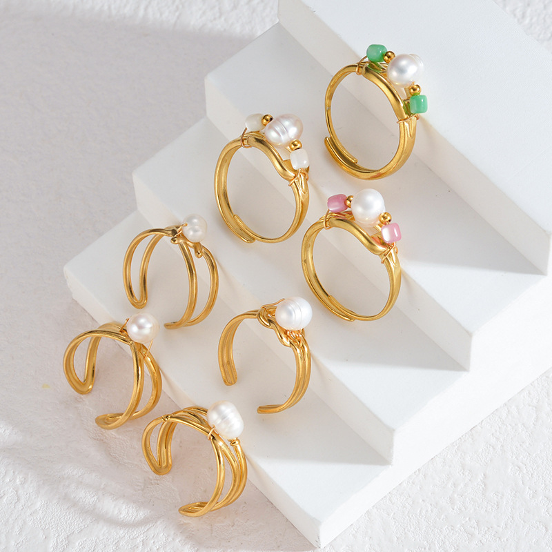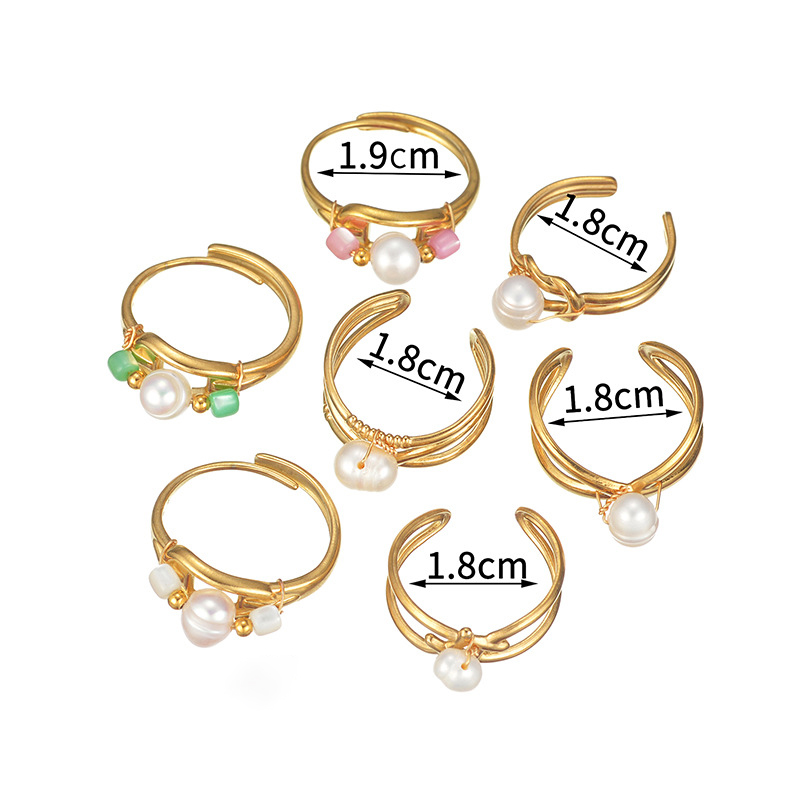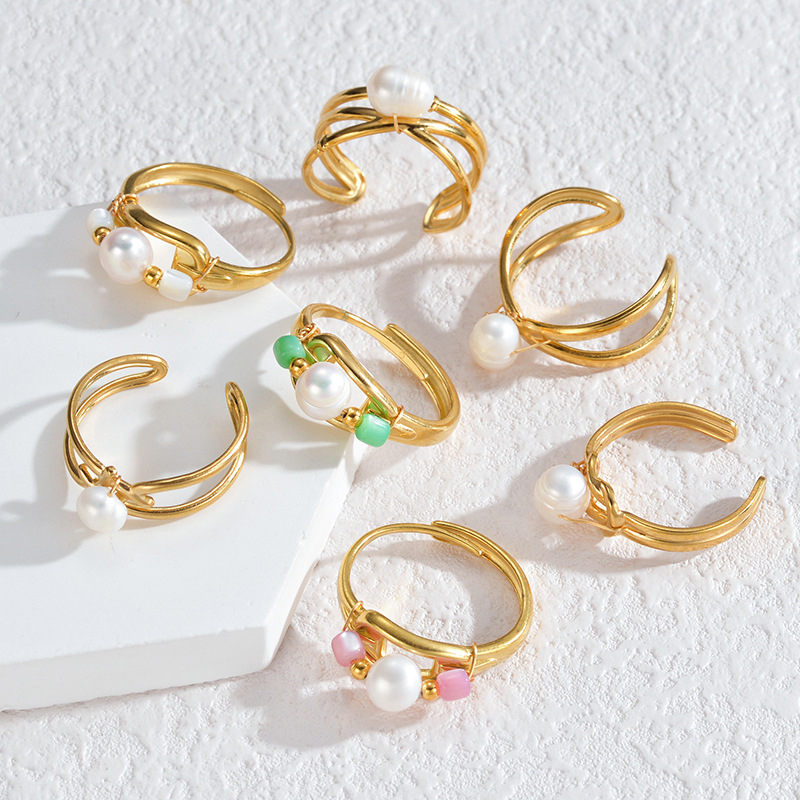 Bague en acier inoxydable, Acier inoxydable 304, avec perle de plastique, Placage, styles différents pour le choix & pour femme & creux, doré, Vendu par PC