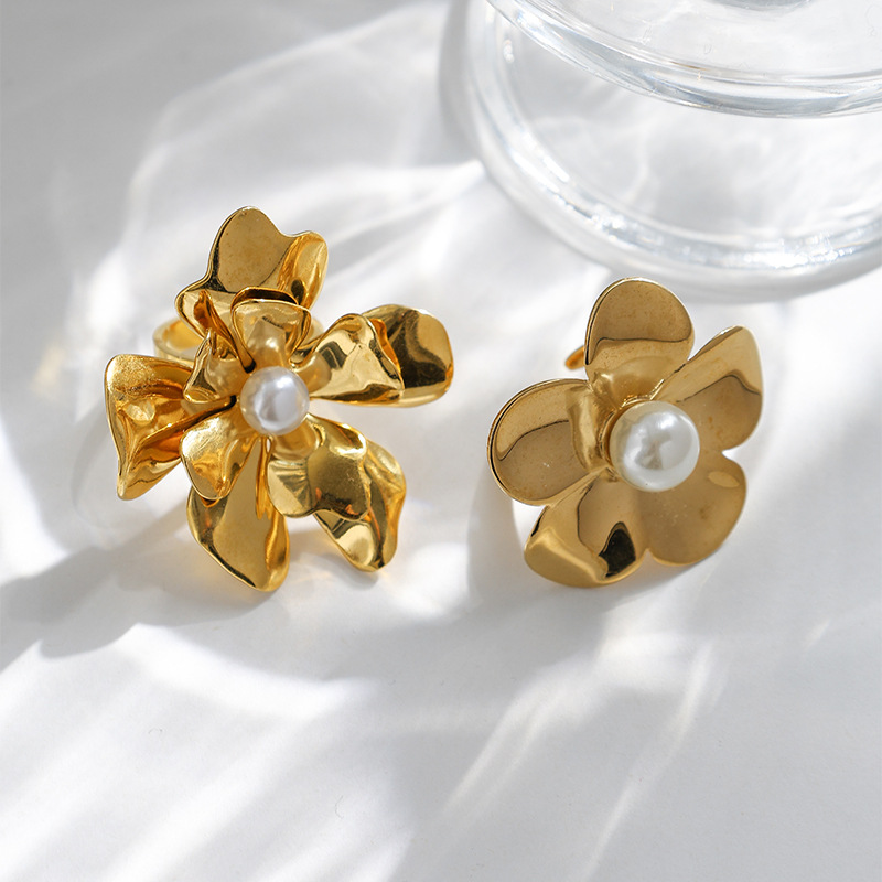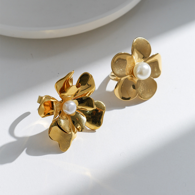 Bague en acier inoxydable, Acier inoxydable 304, avec perle de plastique, fleur, Placage, bijoux de mode & styles différents pour le choix & pour femme, doré, Vendu par PC