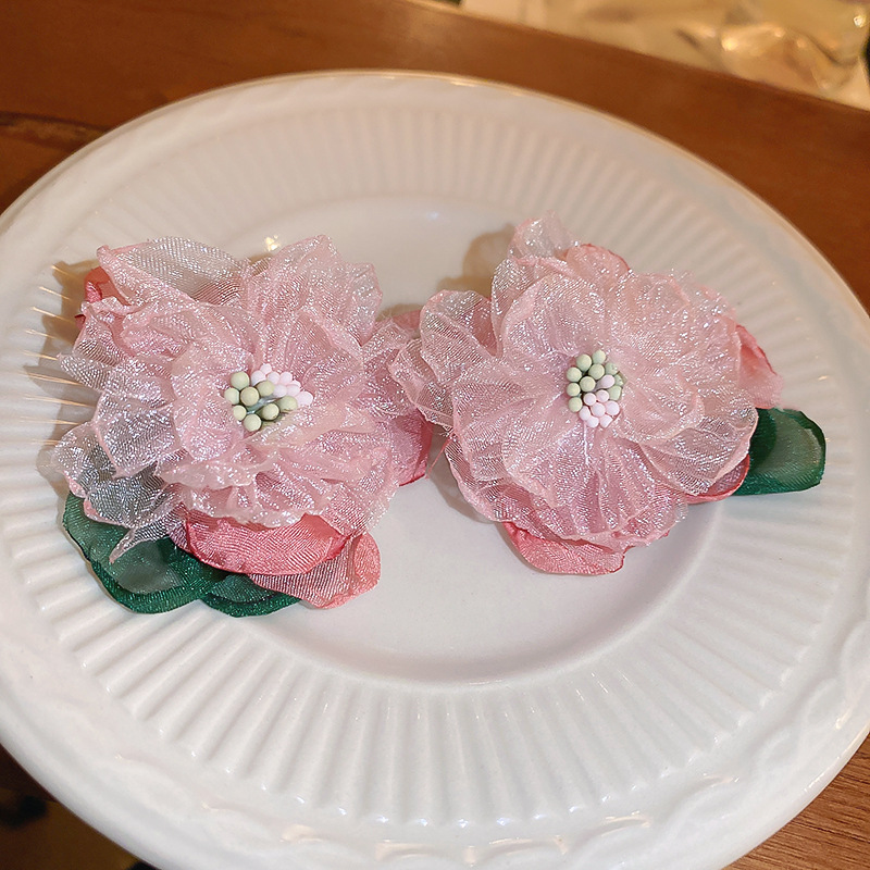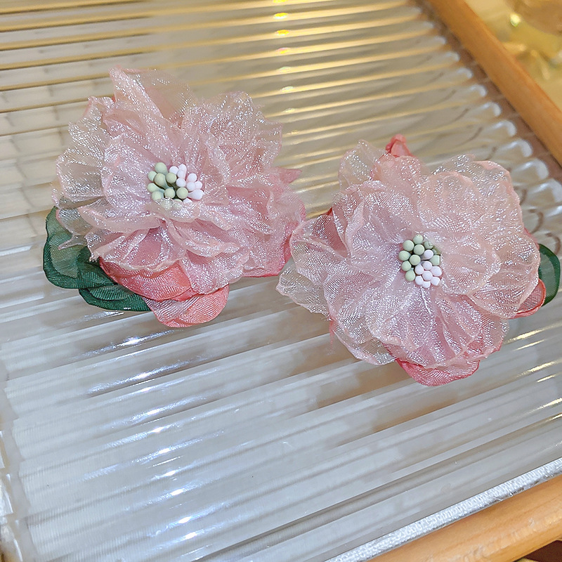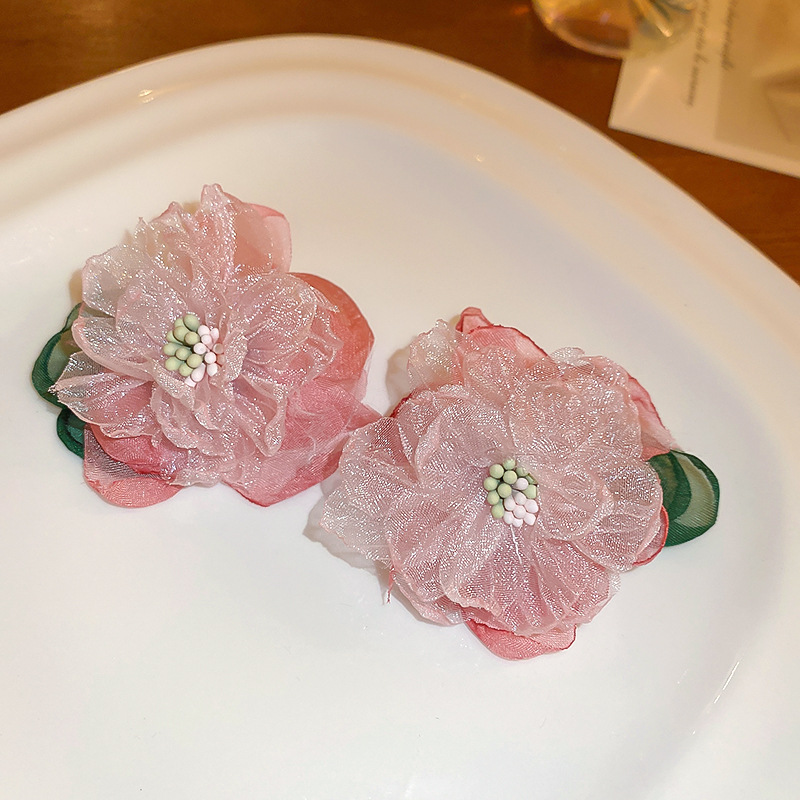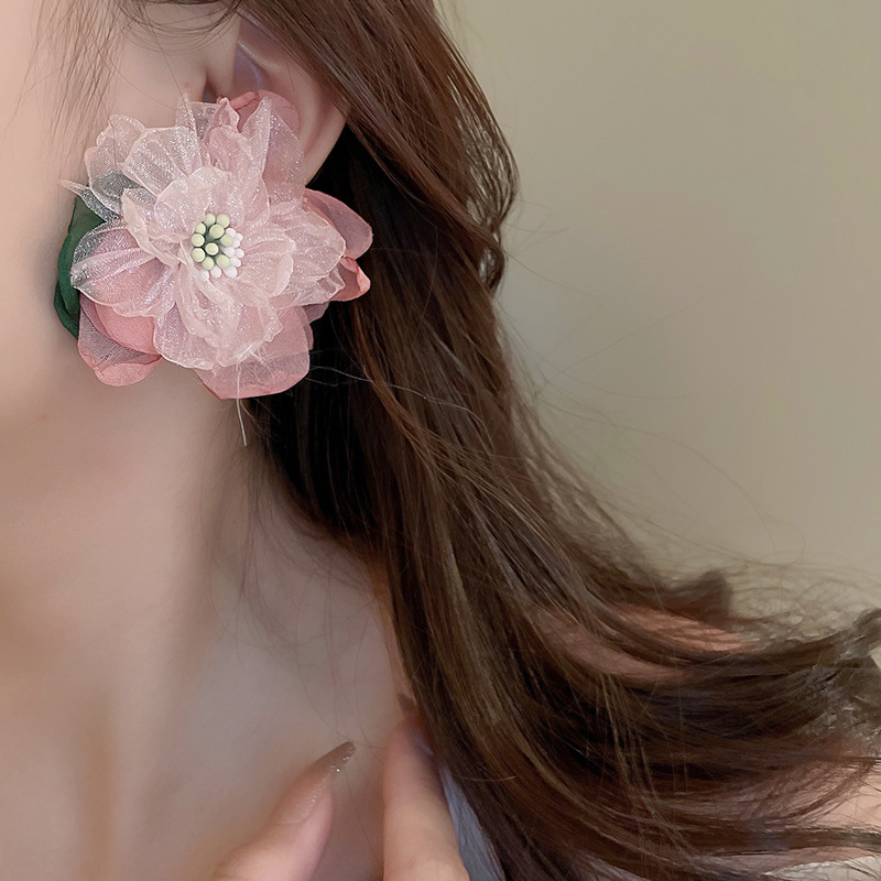 Bijoux boucle d'oreille a la mode, Acrylique, avec Gaze, fleur, bijoux de mode & pour femme, rose, 55x45mm, Vendu par paire