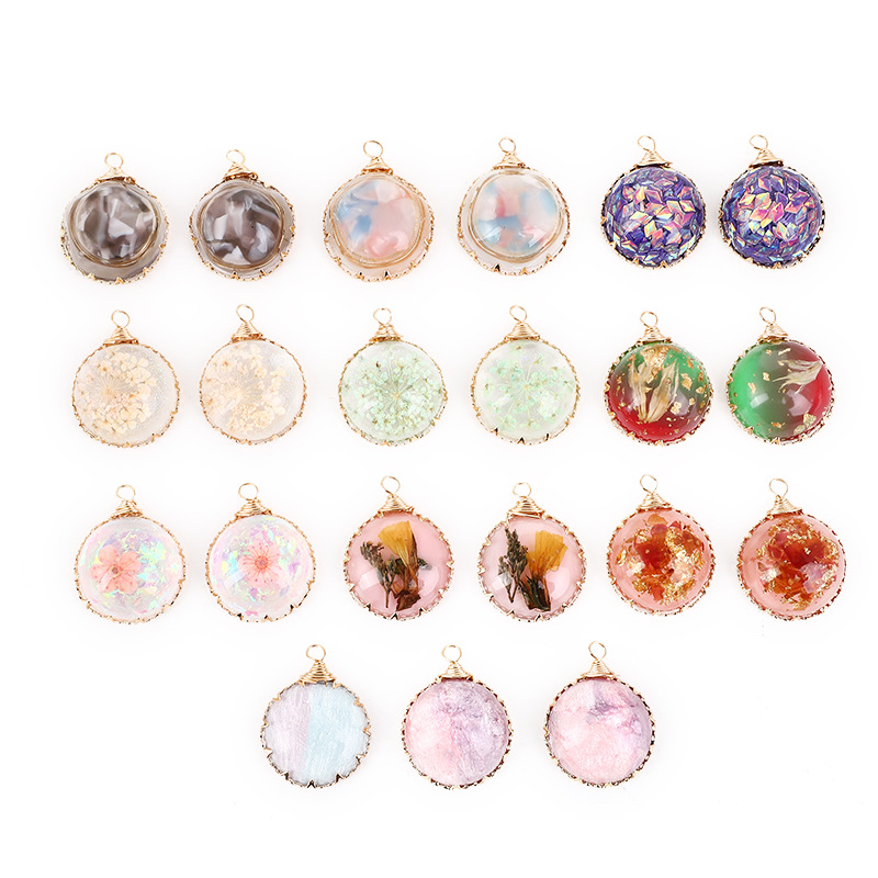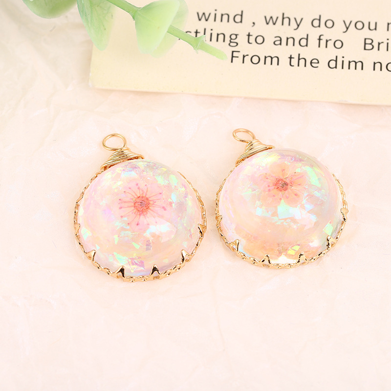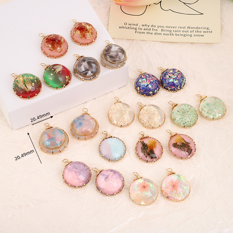 Bijoux pendentifs en Zinc alliage , alliage de zinc, avec Autocollant époxyde & Fleurs séchées, Rond, Placage, DIY, Couleur aléatoire, 49x20mm, Vendu par PC