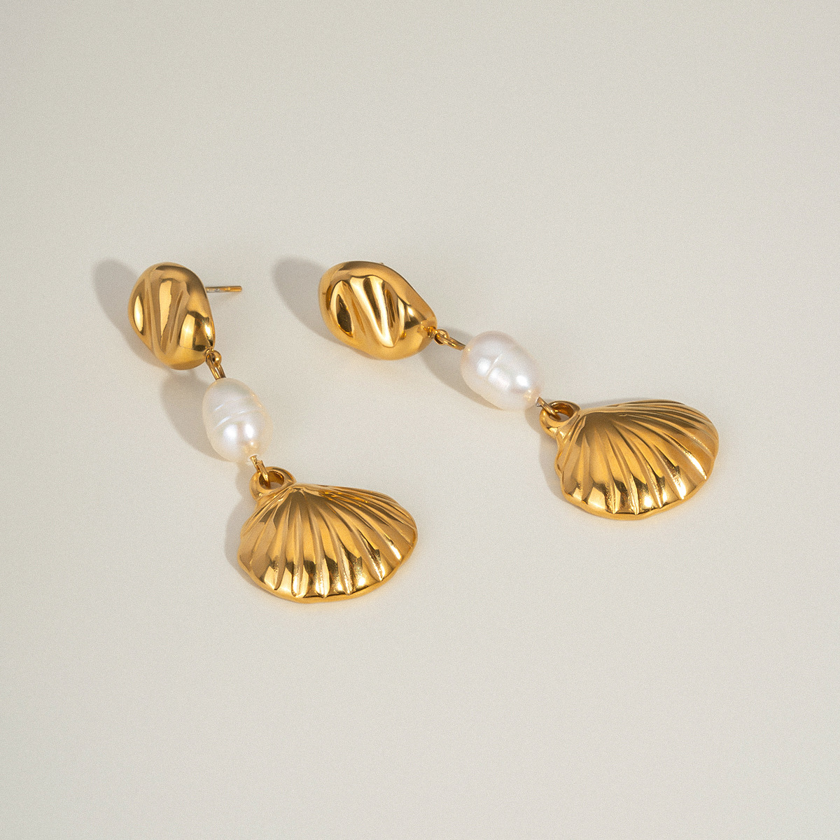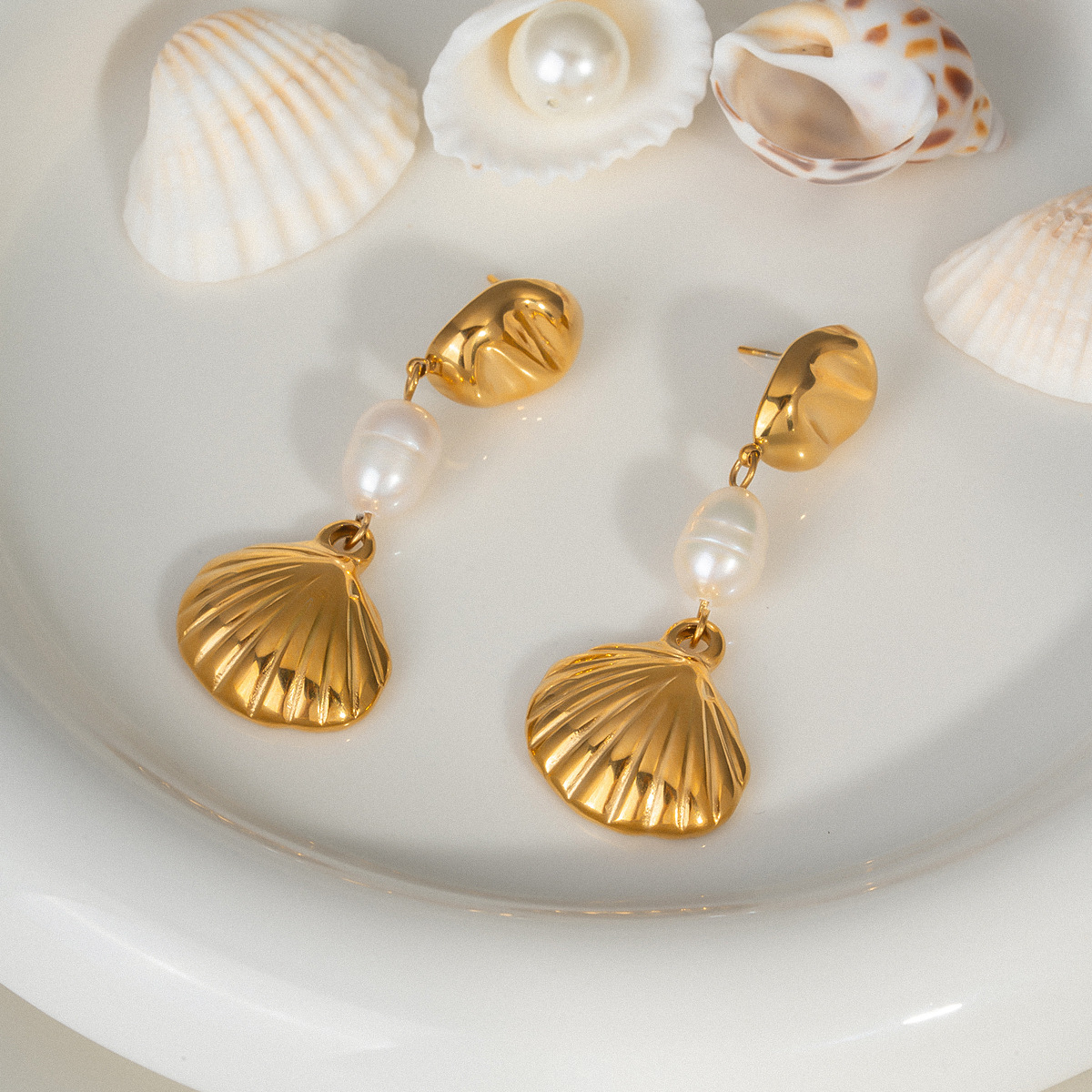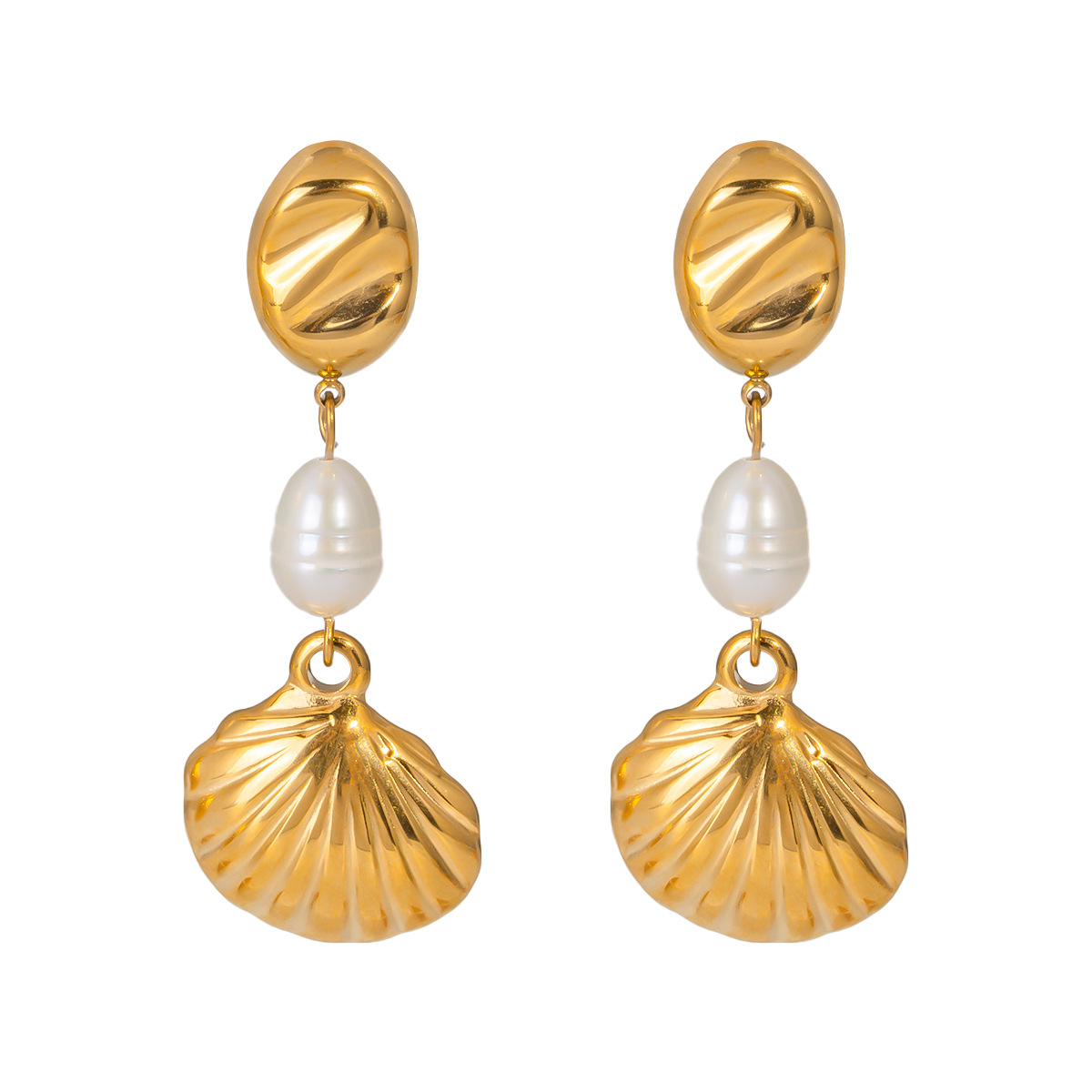 Boucle d'oreille goutte inox, Acier inoxydable 304, avec Shell Pearl, Placage ionique sous vide, bijoux de mode & pour femme, doré, Vendu par paire