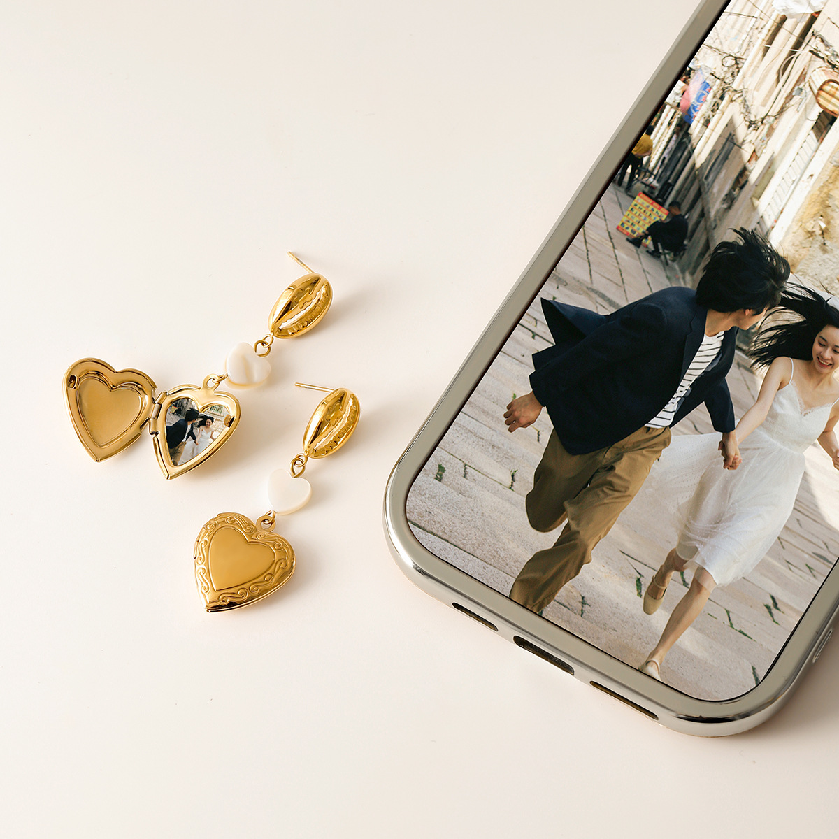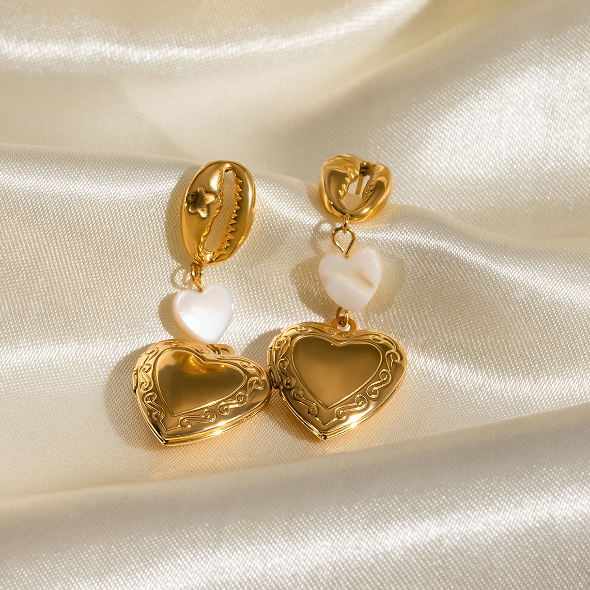 Boucle d'oreille goutte inox, Acier inoxydable 304, avec coquille blanche, coeur, Placage, peut s’ouvrir et mettre dans quelque chose & pour femme & creux, doré, Vendu par paire