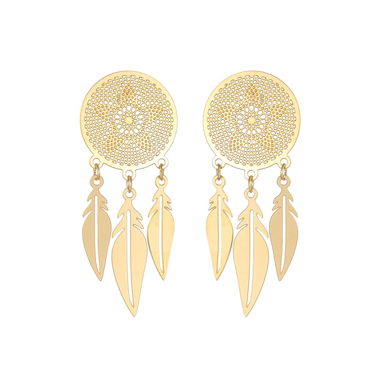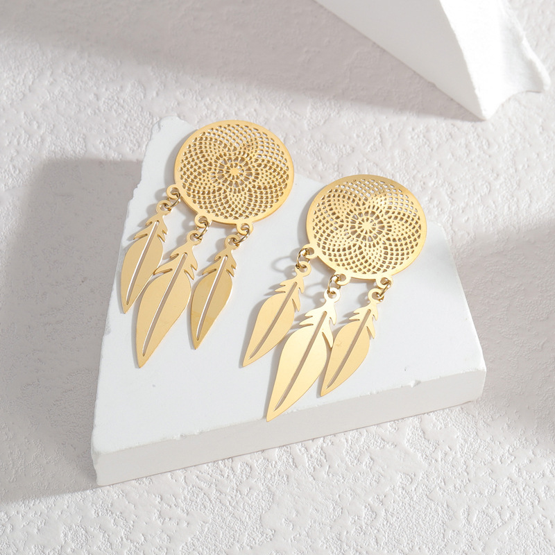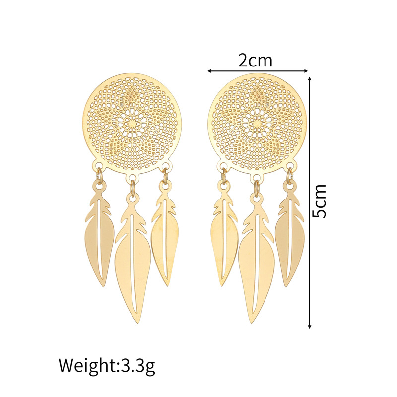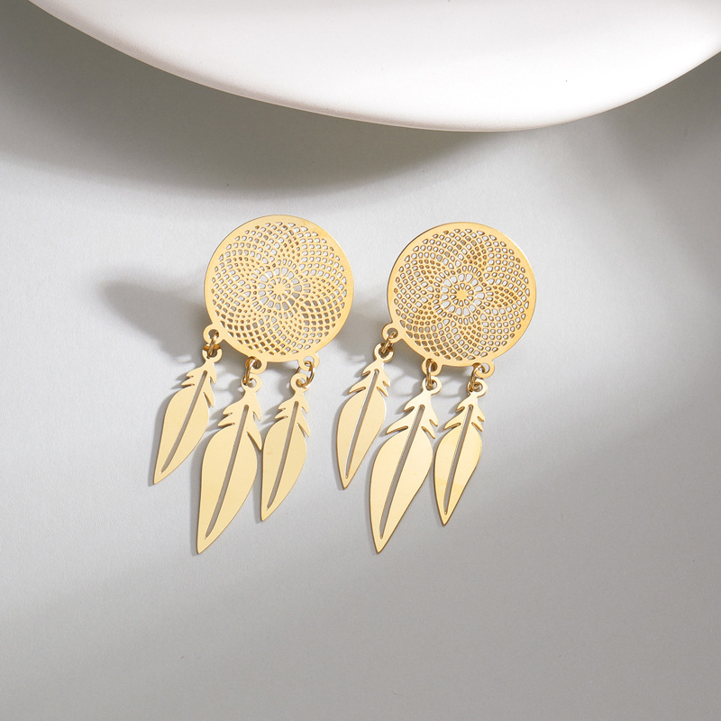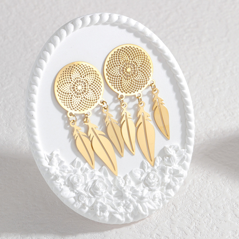 Boucle d'oreille goutte inox, Acier inoxydable 304, forme de plume, Plaqué or 18K, bijoux de mode & pour femme & creux, Vendu par paire