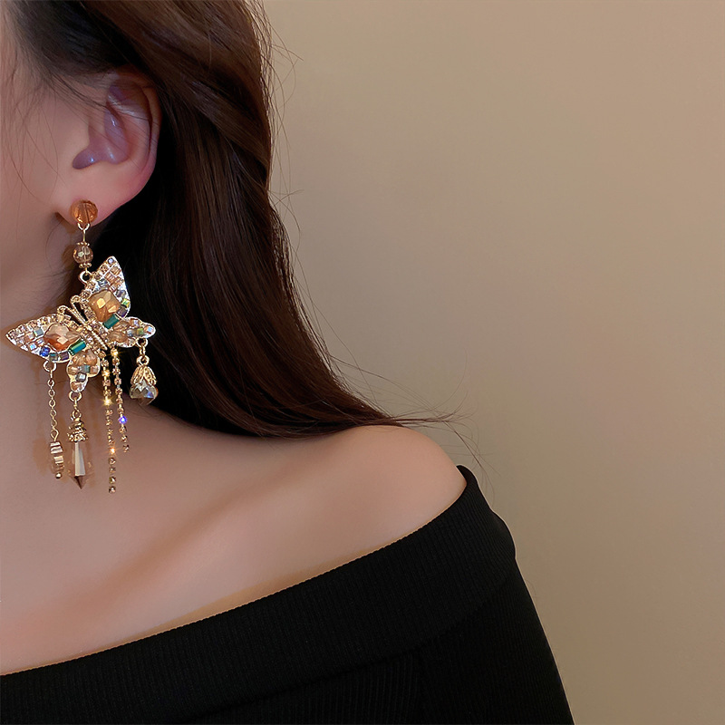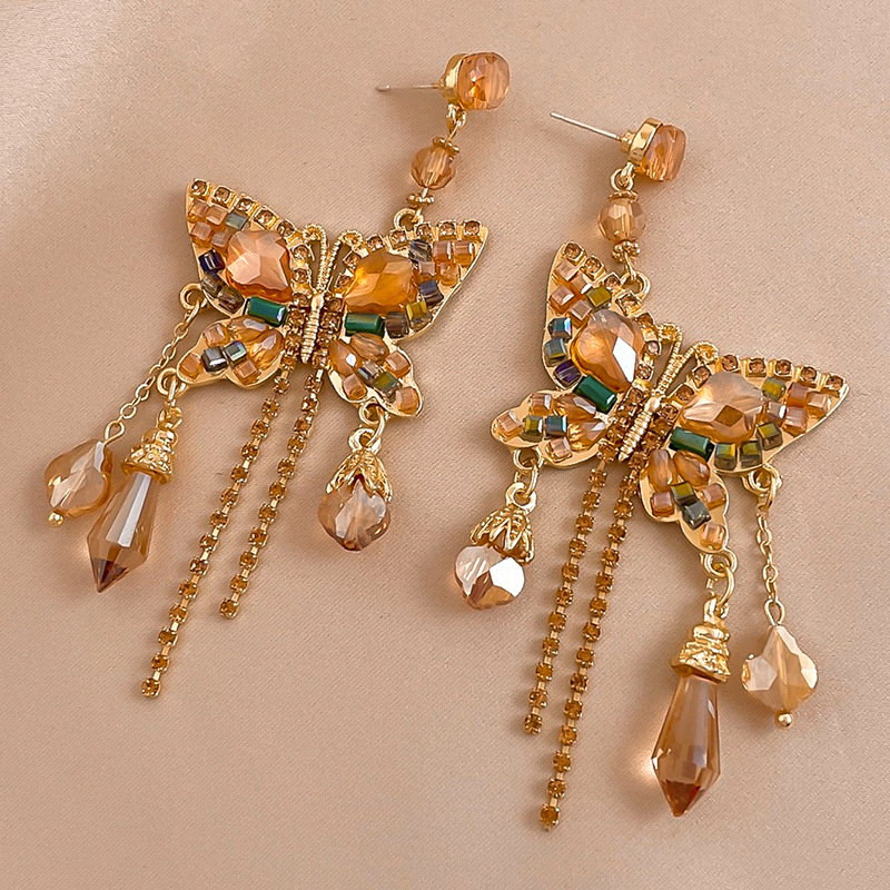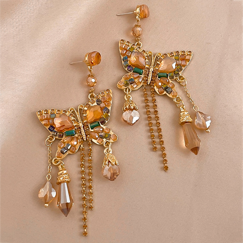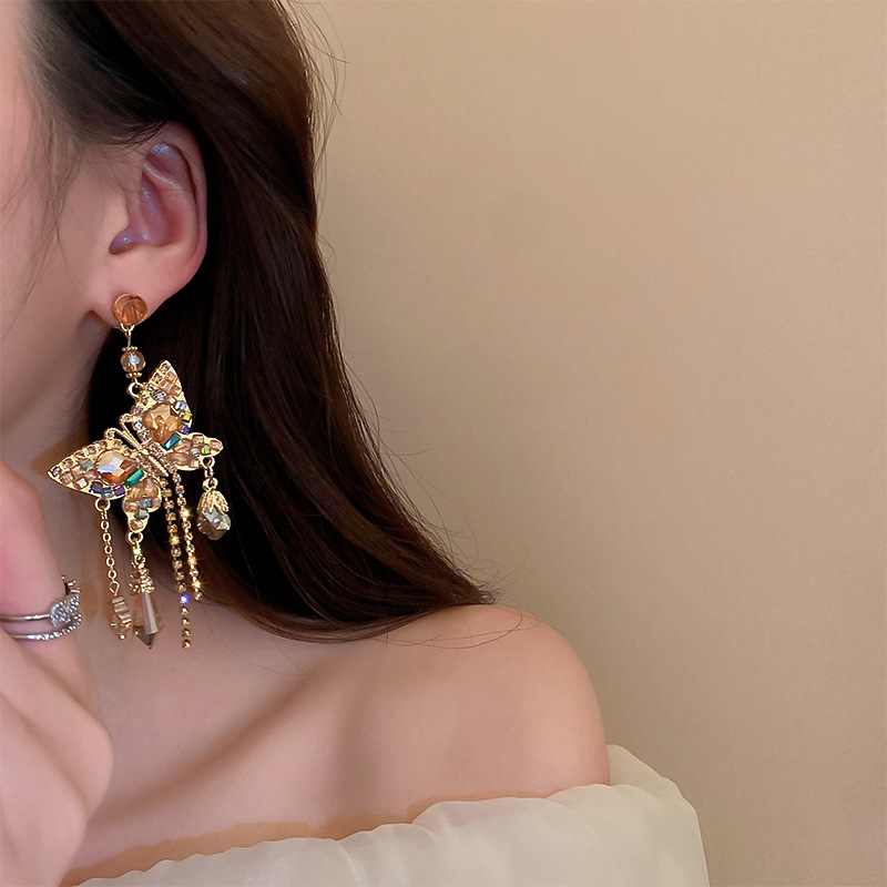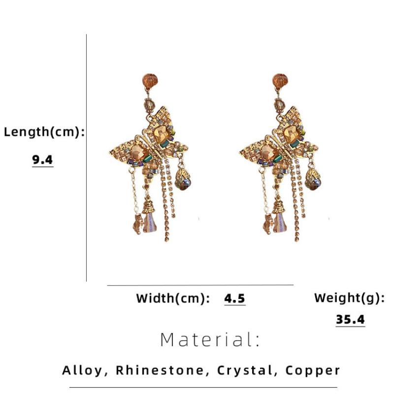 Boucle d'oreille de goutte en cristal, alliage de zinc, avec cristal & laiton, papillon, pour femme & avec strass & creux, doré, Vendu par paire