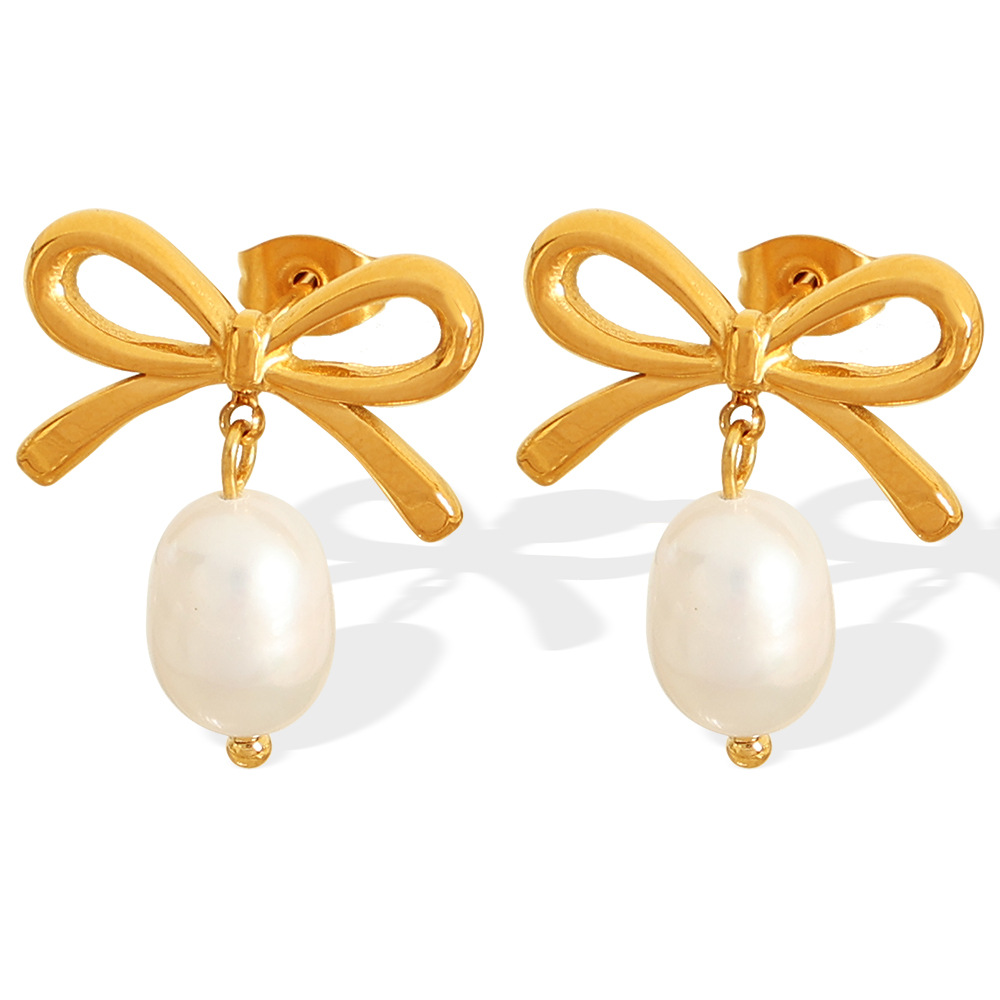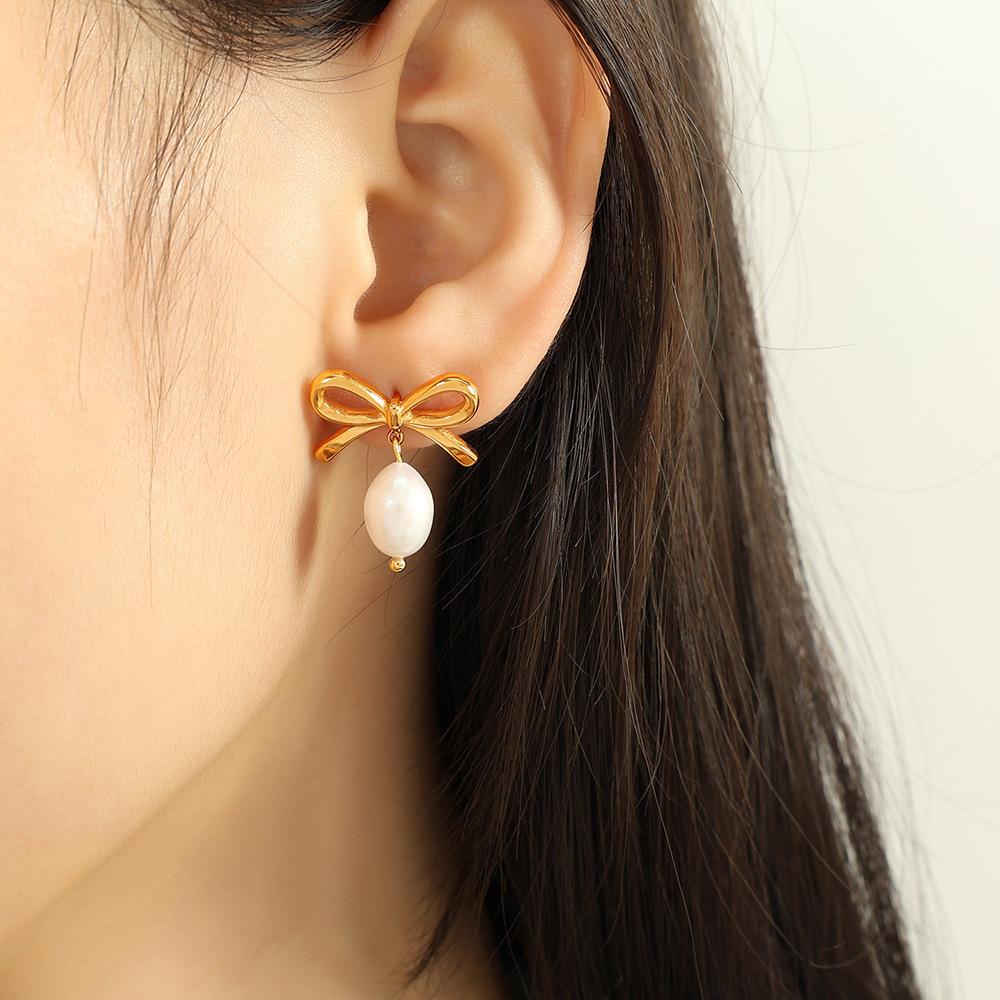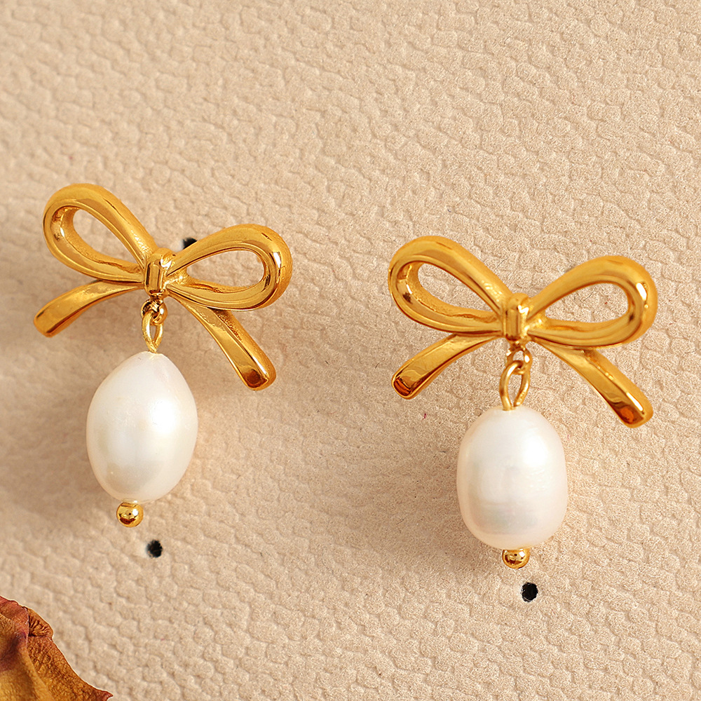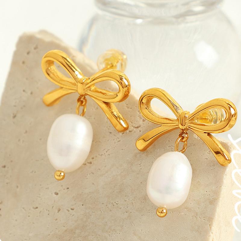 Boucle d'oreille de perle de goutte d'eau douce, Acier inoxydable 304, avec perle d'eau douce cultivée, Noeud papillon, Plaqué or 18K, bijoux de mode & pour femme & creux, Vendu par paire