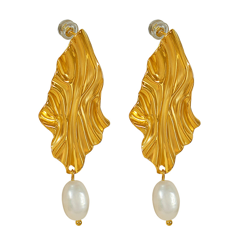 Boucle d'oreille de perle de goutte d'eau douce, Acier inoxydable 304, avec perle d'eau douce cultivée, feuille, Placage, bijoux de mode & pour femme, doré, 24x60mm, Vendu par paire