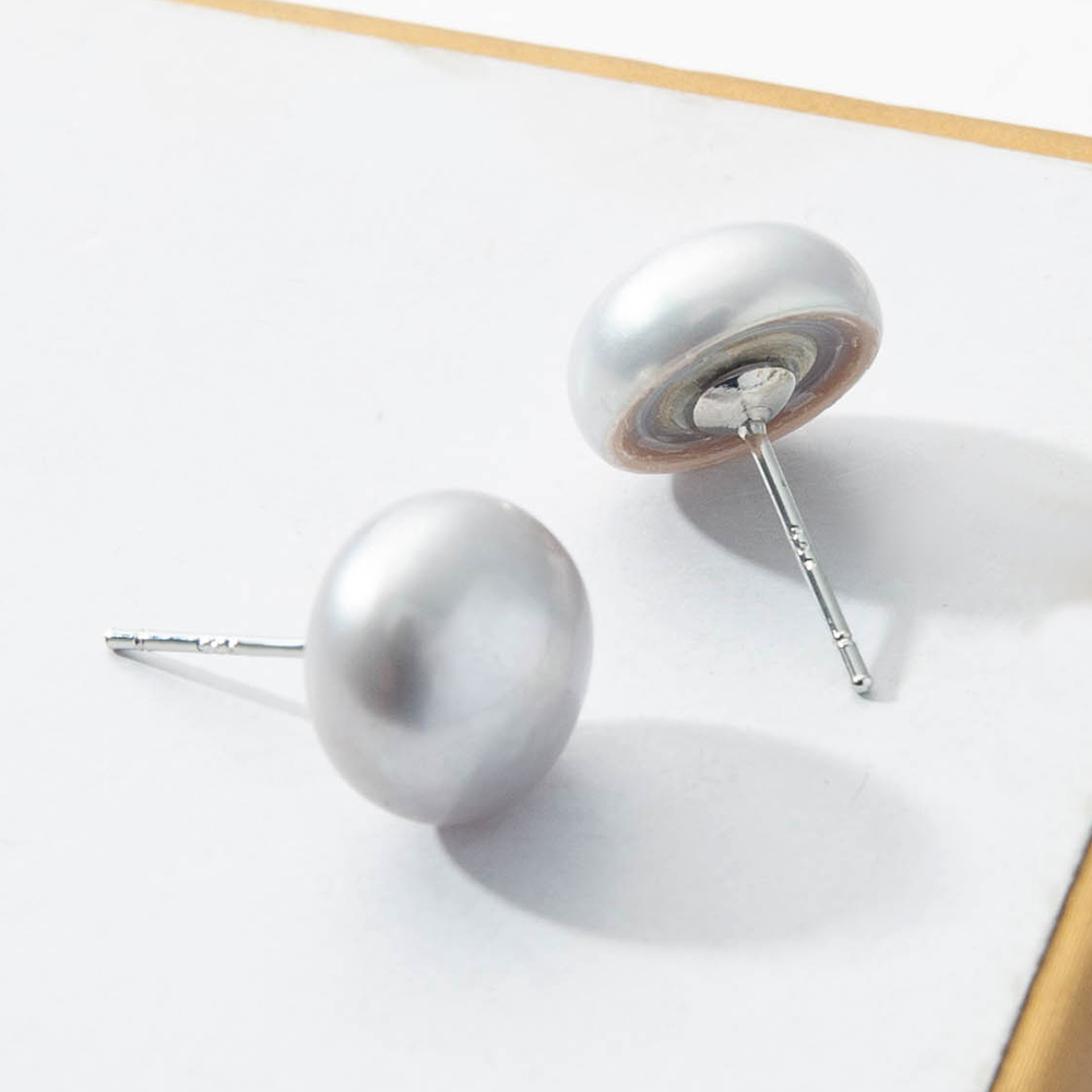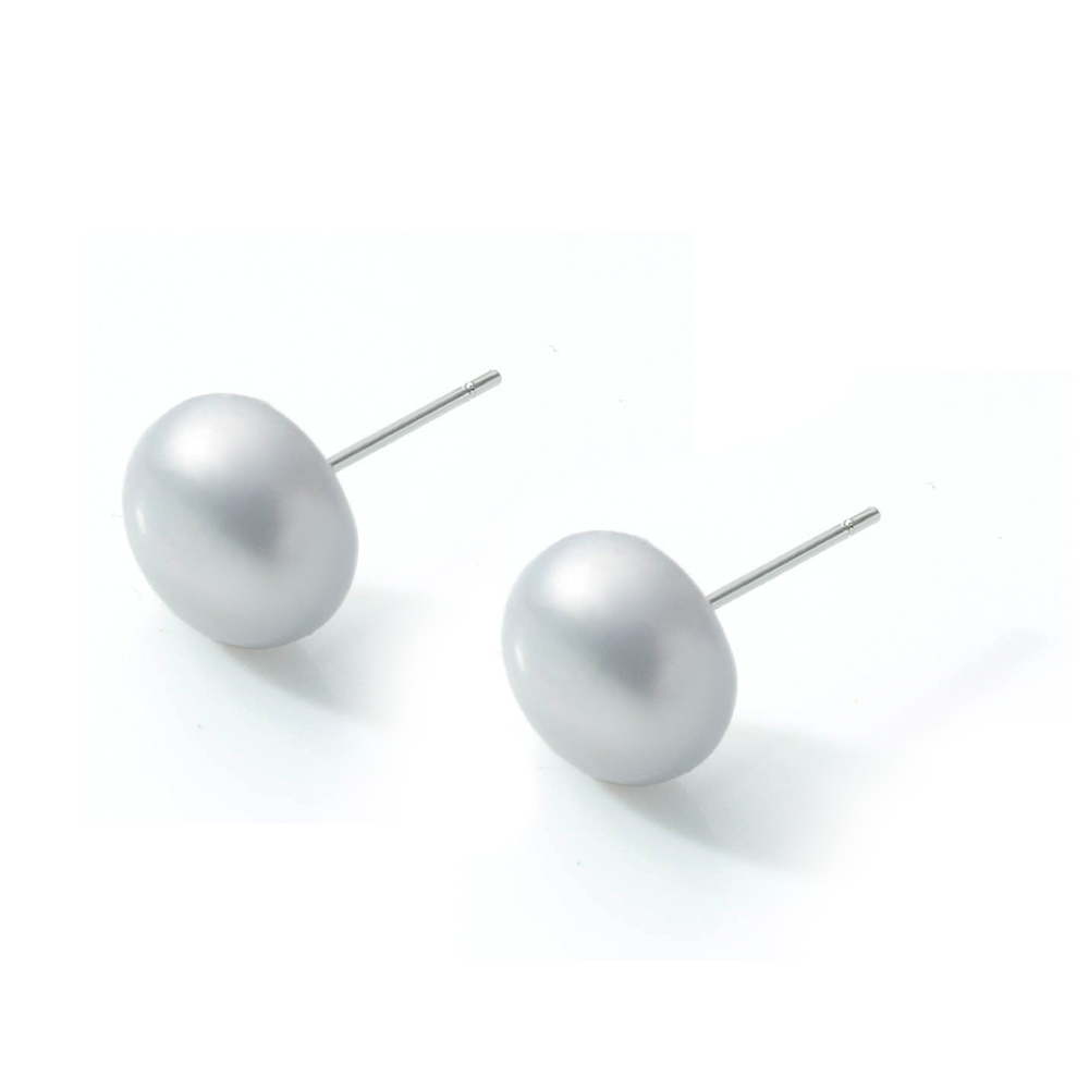 Boucle d'oreille de perles d'eau douce , perle d'eau douce cultivée, laiton puce boucle d'oreille, bouton, Placage de couleur argentée, naturel, blanc, 13-14mm, Vendu par paire