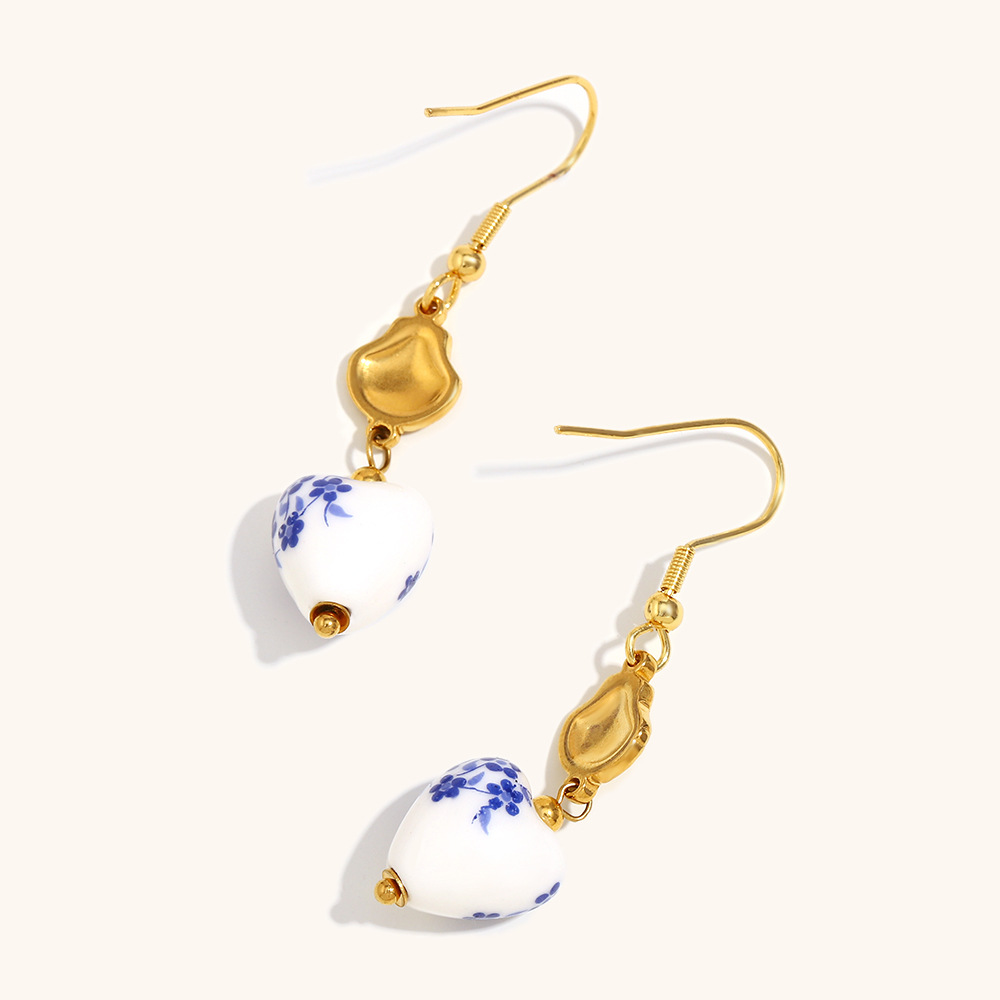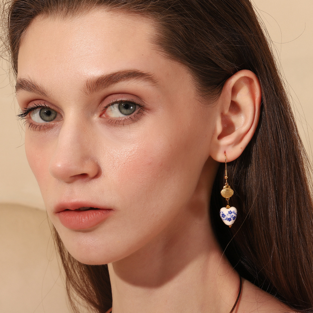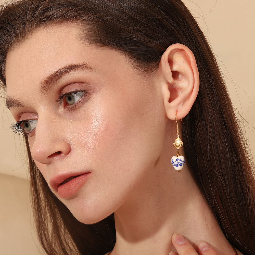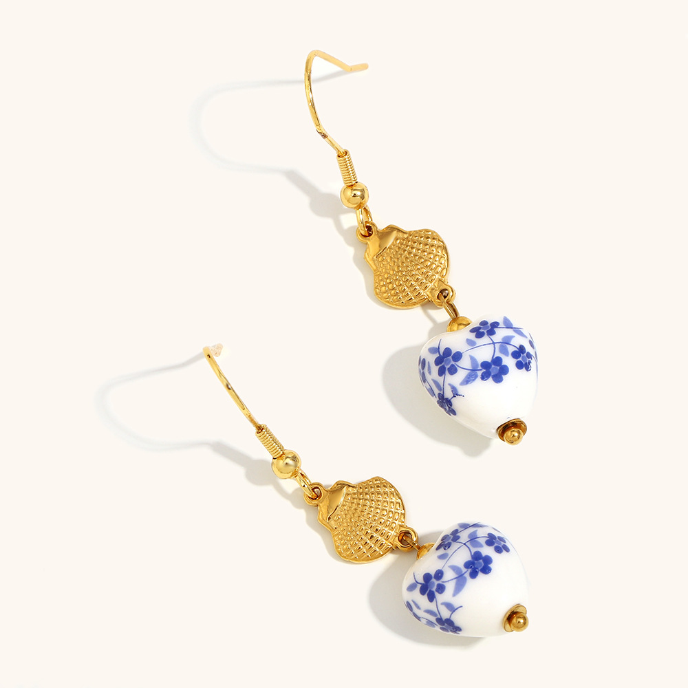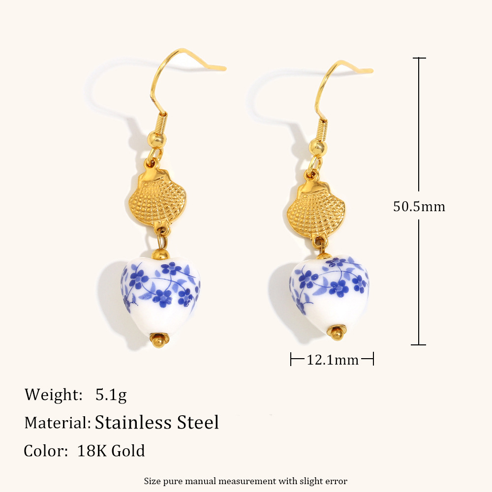 Boucle d'oreille goutte inox, Acier inoxydable 304, avec coquille, coeur, Placage de couleur d'or, pour femme, Vendu par paire