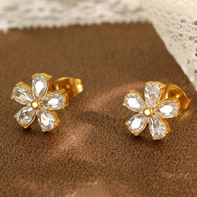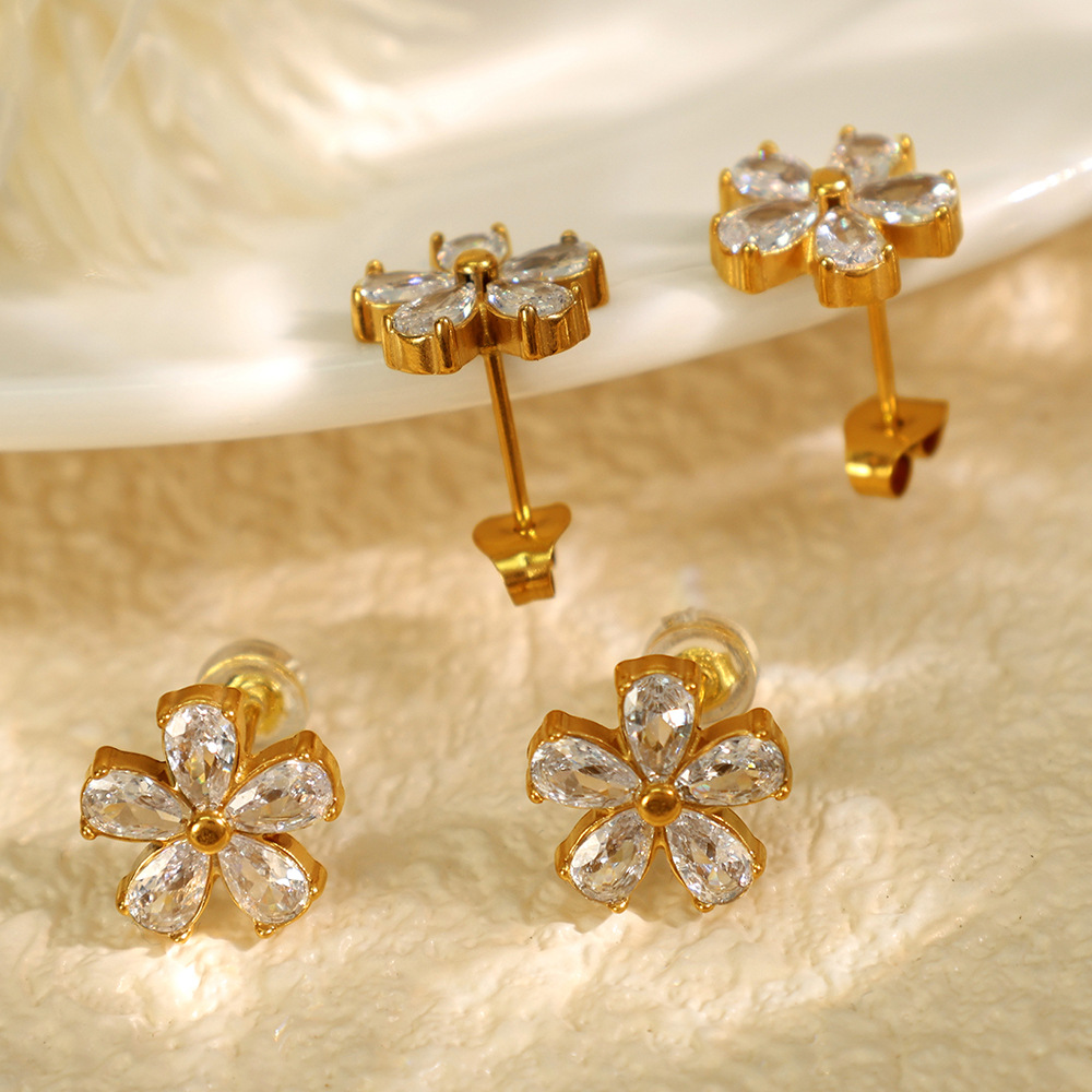 Boucle en acier inoxydable zircons cubiques, Acier inoxydable 304, avec zircon cubique, fleur, Placage, bijoux de mode & pour femme, doré, Vendu par paire