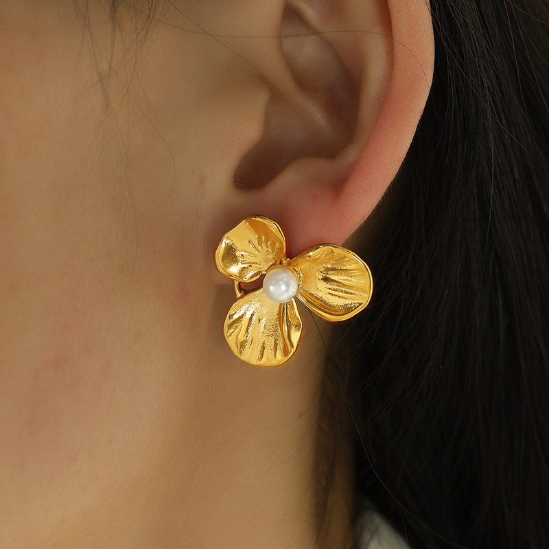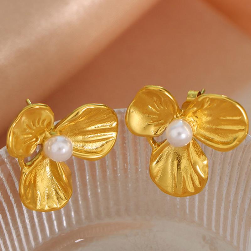 Boucle en acier inoxydable, Acier inoxydable 304, avec perle de plastique, fleur, Plaqué or 18K, bijoux de mode & pour femme, Vendu par paire