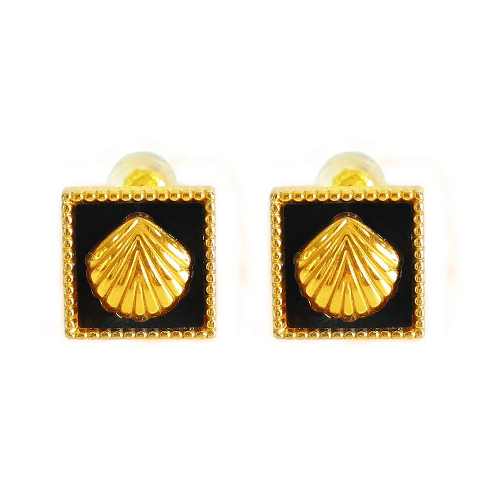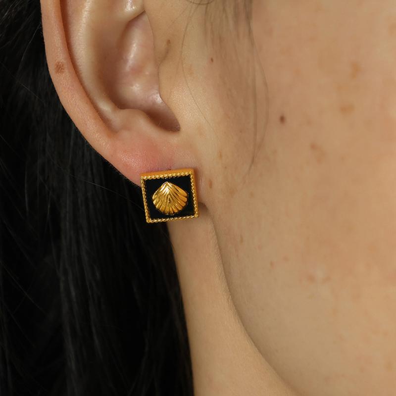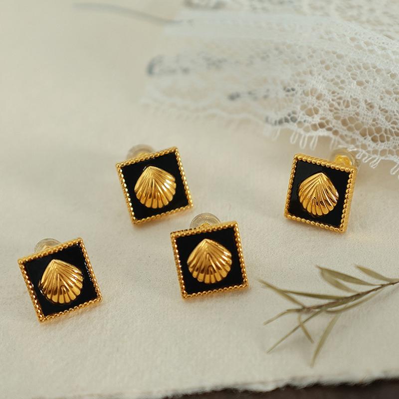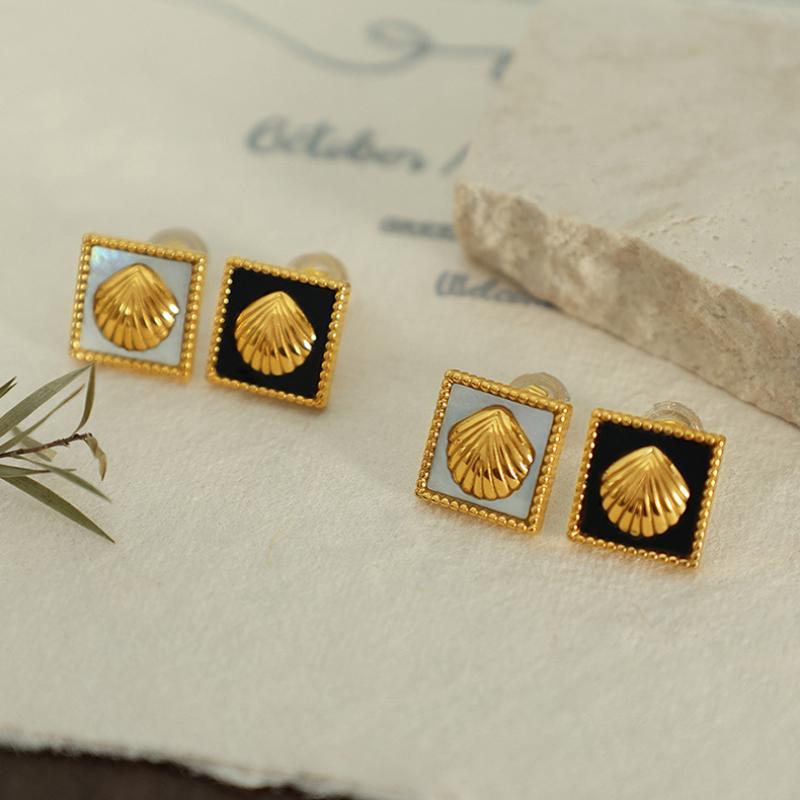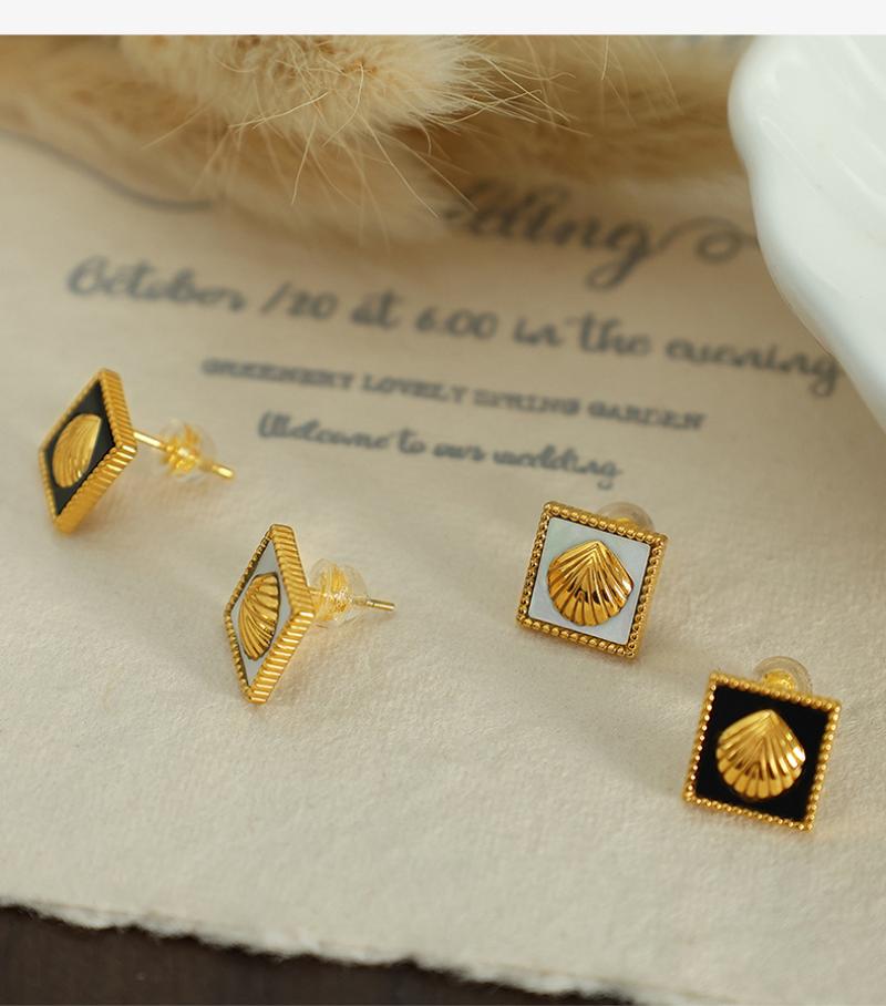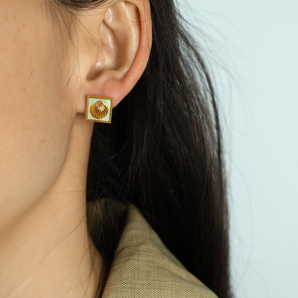 Boucle en acier inoxydable, Acier inoxydable 304, avec coquille blanche, cadre, Placage de couleur d'or, bijoux de mode & différents matériaux pour le choix & pour femme, 10x10mm, Vendu par paire