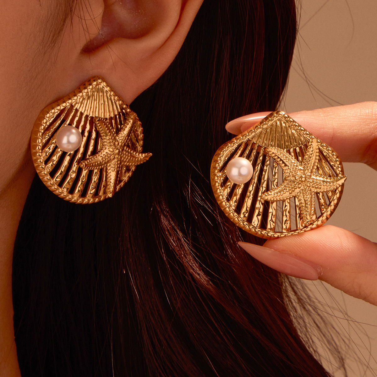 Boucle en acier inoxydable, Acier inoxydable 304, avec perle de plastique, coquille, Plaqué or 18K, bijoux de mode & pour femme & creux, Vendu par paire