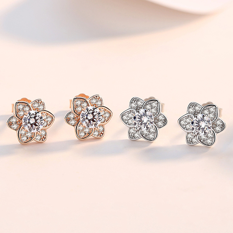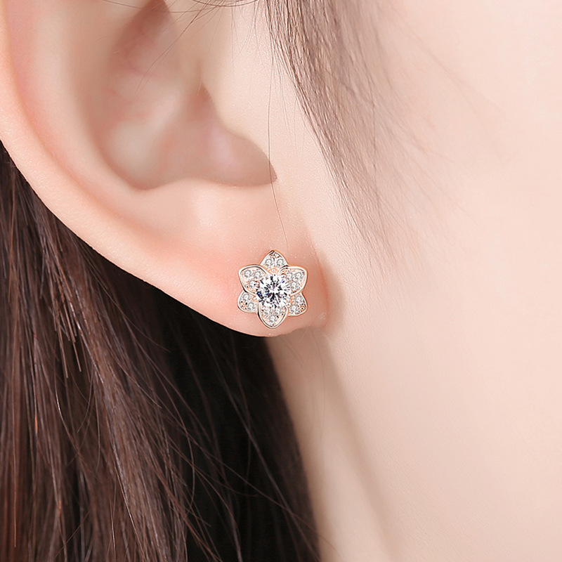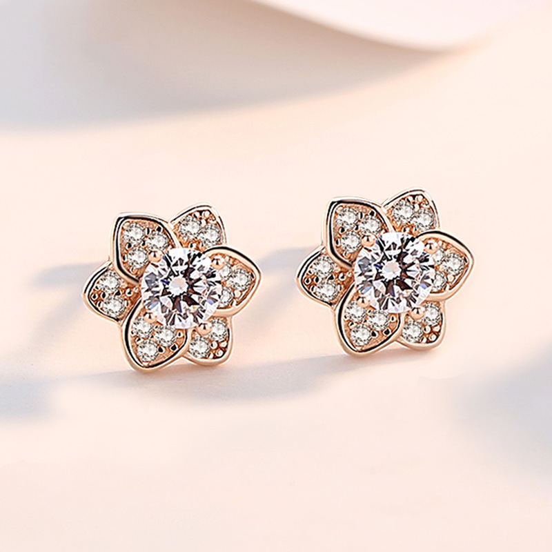 Boucles d'oreilles en laiton zircon cubique pavent, fleur, Plaqué d'or rose, pavé de micro zircon & pour femme Vendu par paire