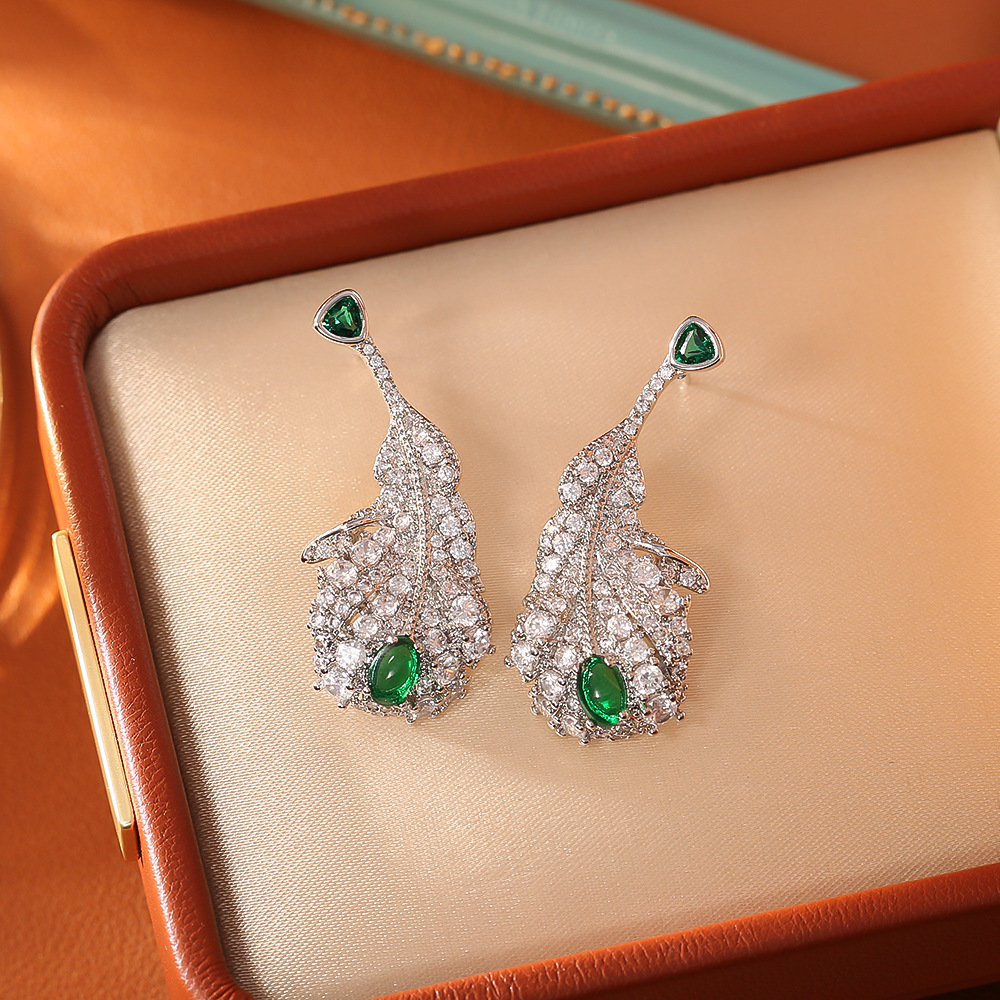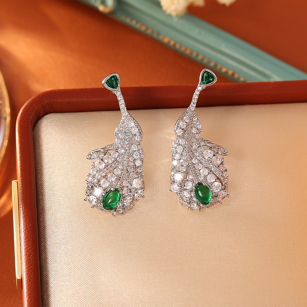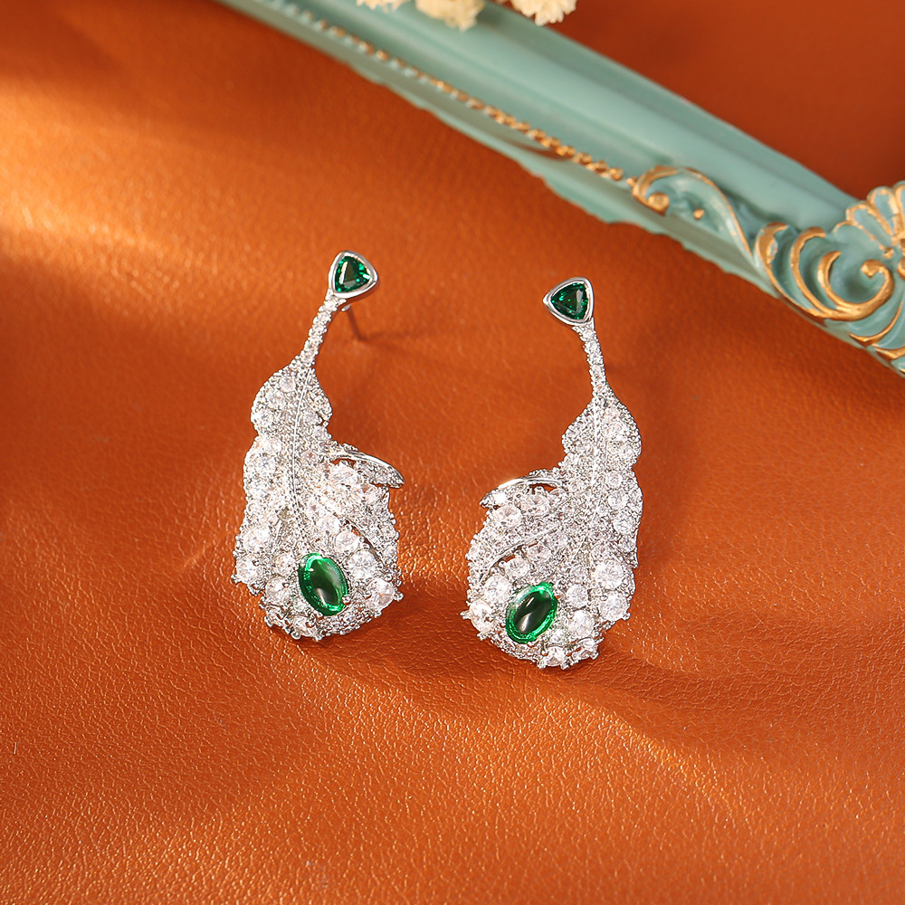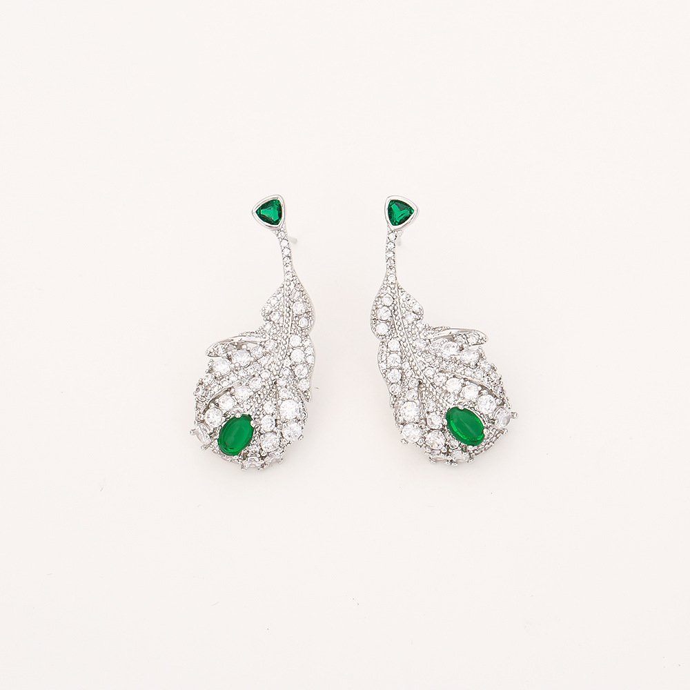 Boucles d'oreilles en laiton zircon cubique pavent, forme de plume, Placage, bijoux de mode & pavé de micro zircon & pour femme, argent, Vendu par paire